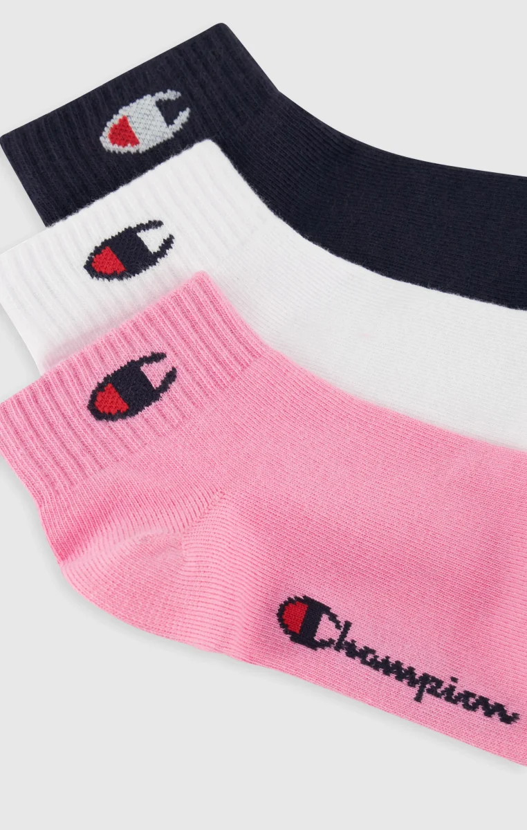 3-pack of socks with classic design and embroidered Champion logo. Made from soft cotton blend, they offer everyday comfort and a snug, non-restrictive fit. Ideal for sports activities and leisure.@@@Fabric: Lightweight stretch knit |Composition: 69% Cotton, 22% Polyester, 6% Polyamide, 3% Elastane |Embroidered logo on collar and toe |Pack of 3 pairs |Quarter height