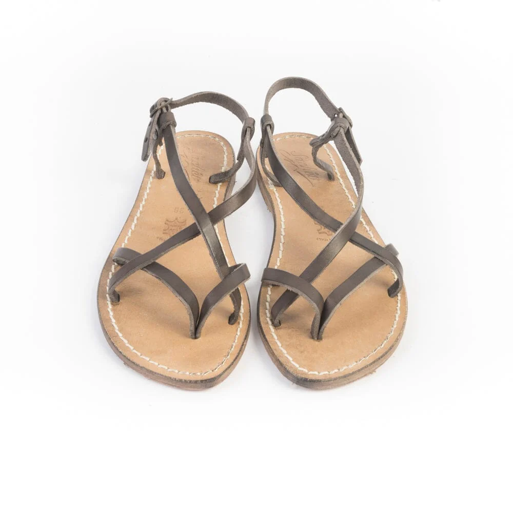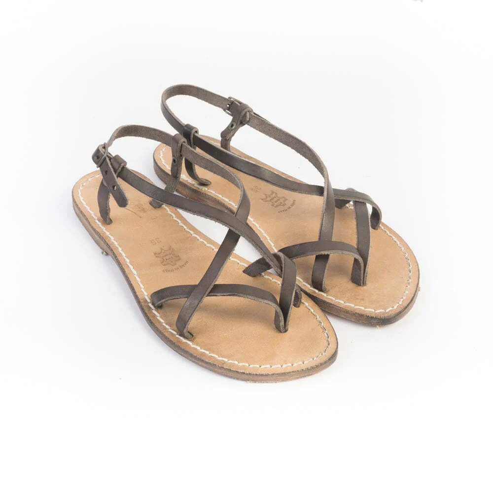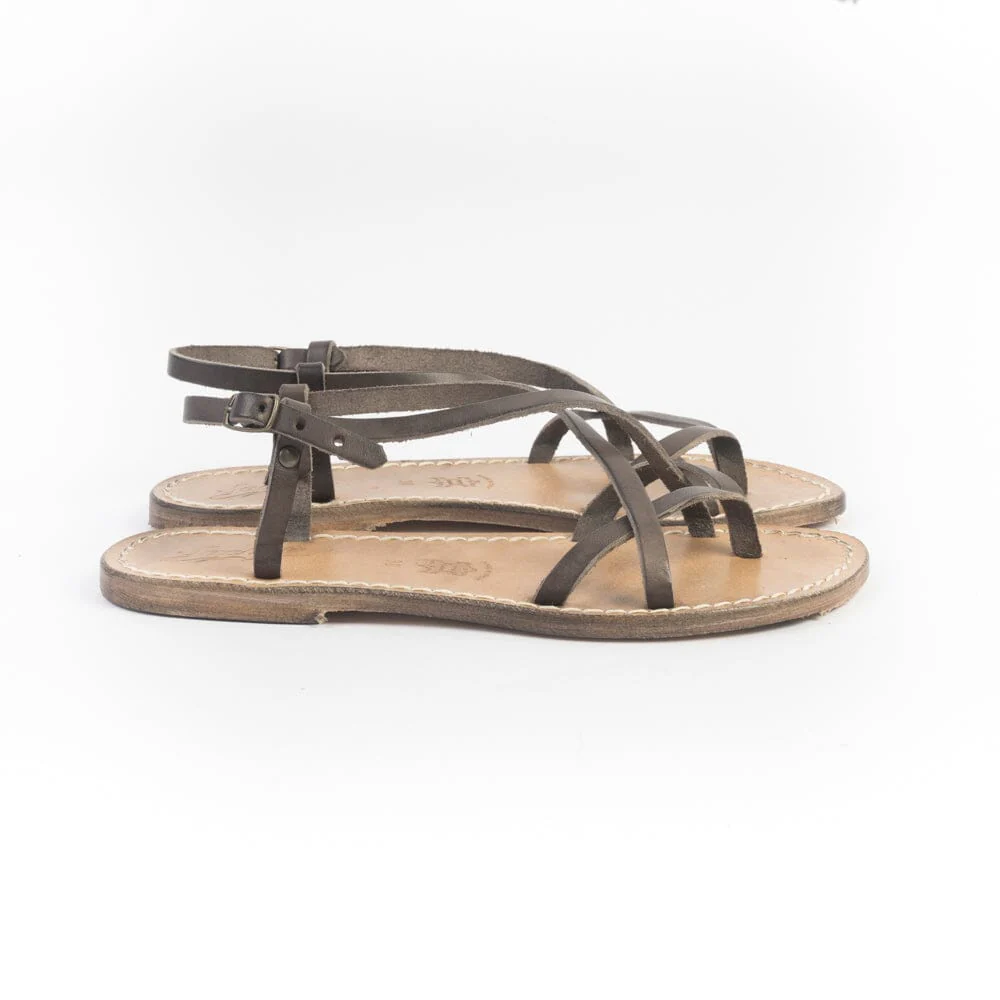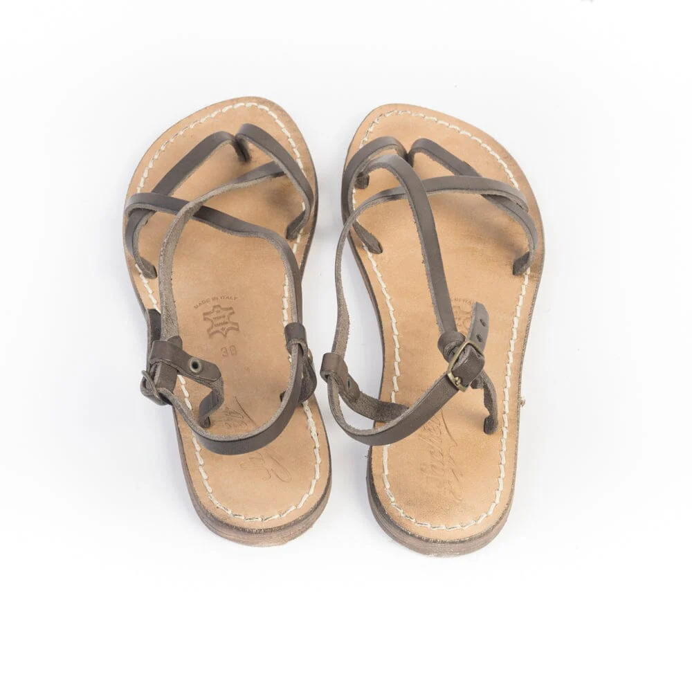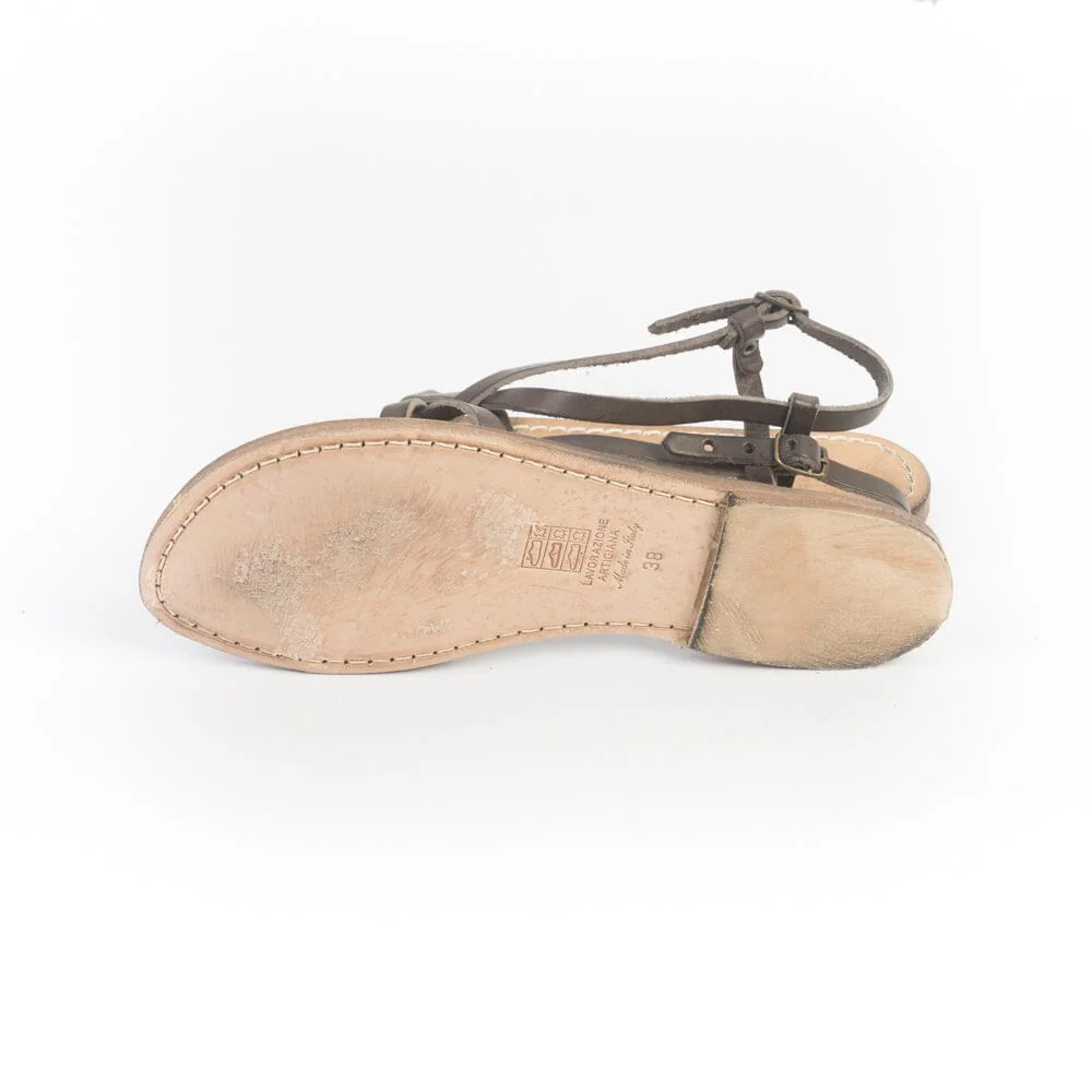 Sandalo infradito realizzato per Sachet, realizzato in pelle di vitello di colore testa di moro con fasce incrociate su tomaia, chiusura con cinturino sottile regolabile alla caviglia. Suola e profili in cuoio fresati ed anticati per un effetto vintage.