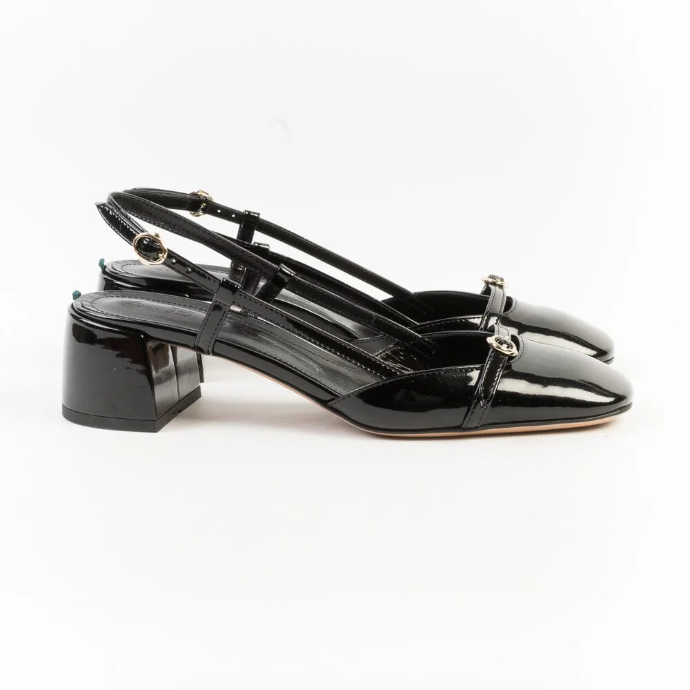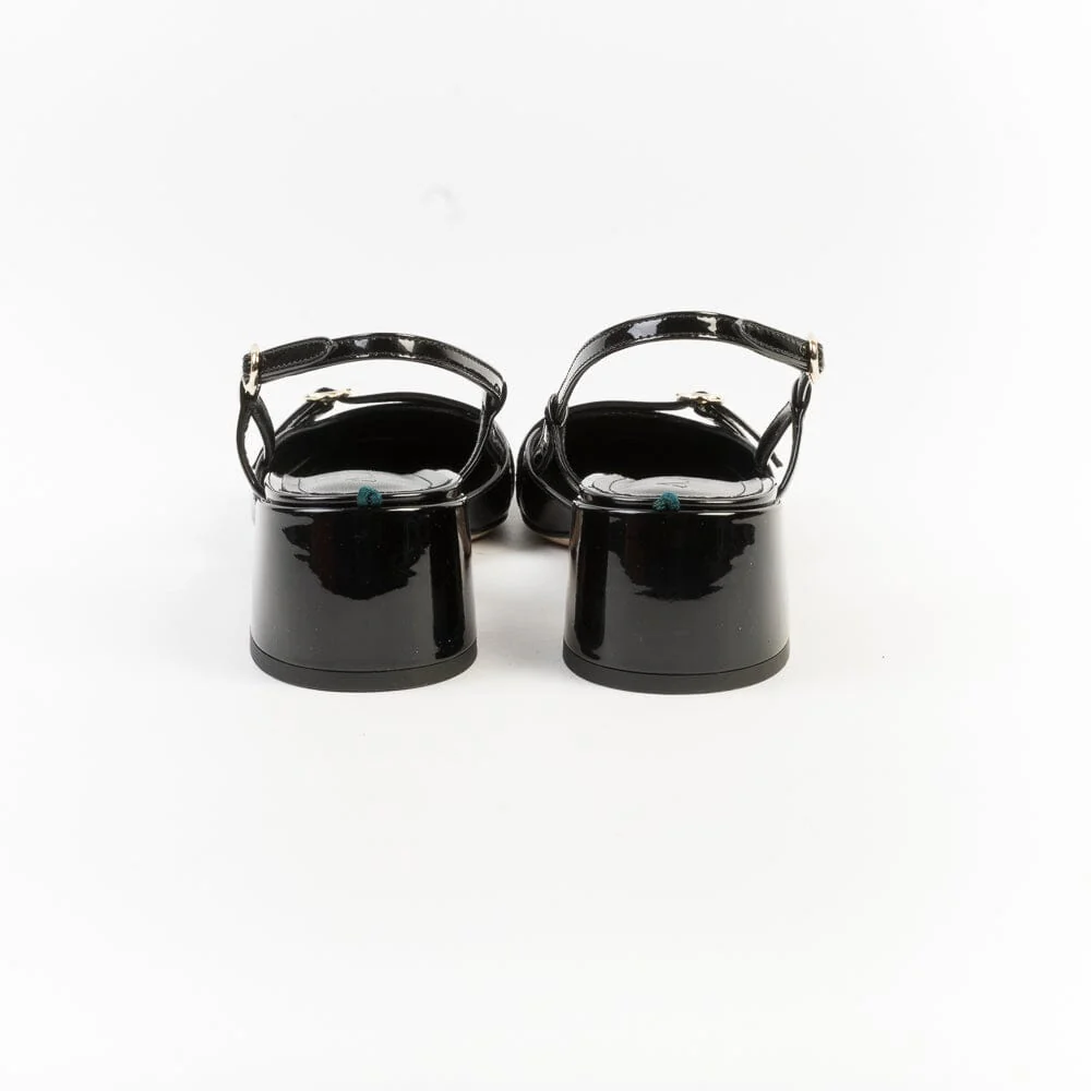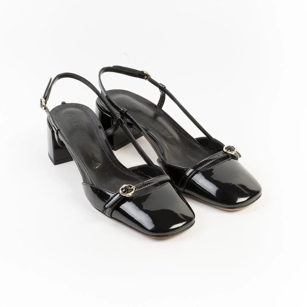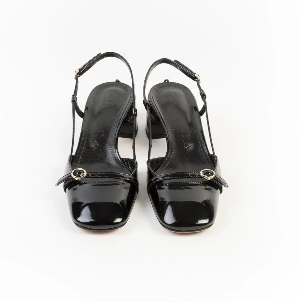 Originale sling back di A. Bocca, realizzate in pelle di vitello verniciata di colore nero. Punta squadrata, decorazione con cinturino su puntale. Chiusura con cinturino sul tallone. Tacco colonna di altezza 4.5 cm circa. Suola in cuoio.