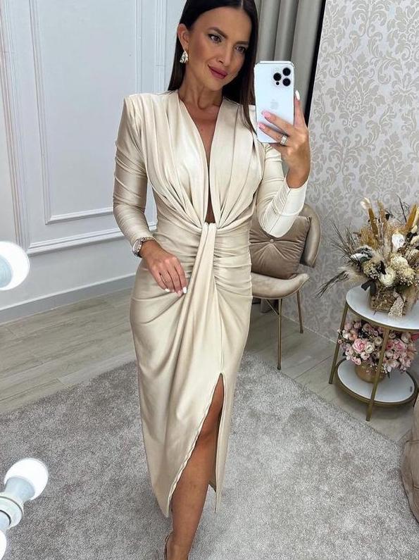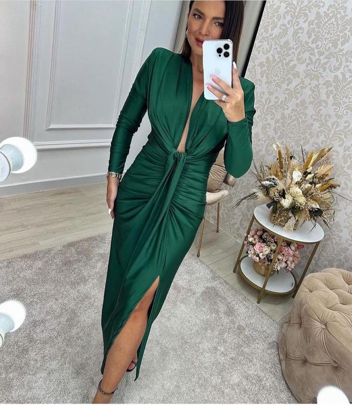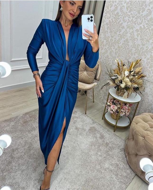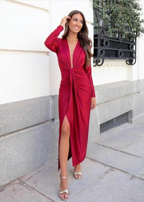 Abito lungo con scollo profondo a V profondo con incrocio e spacco frontale.