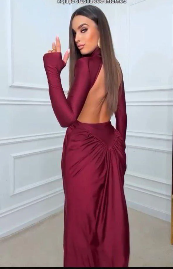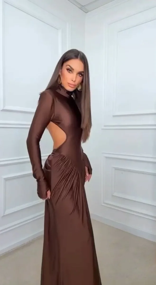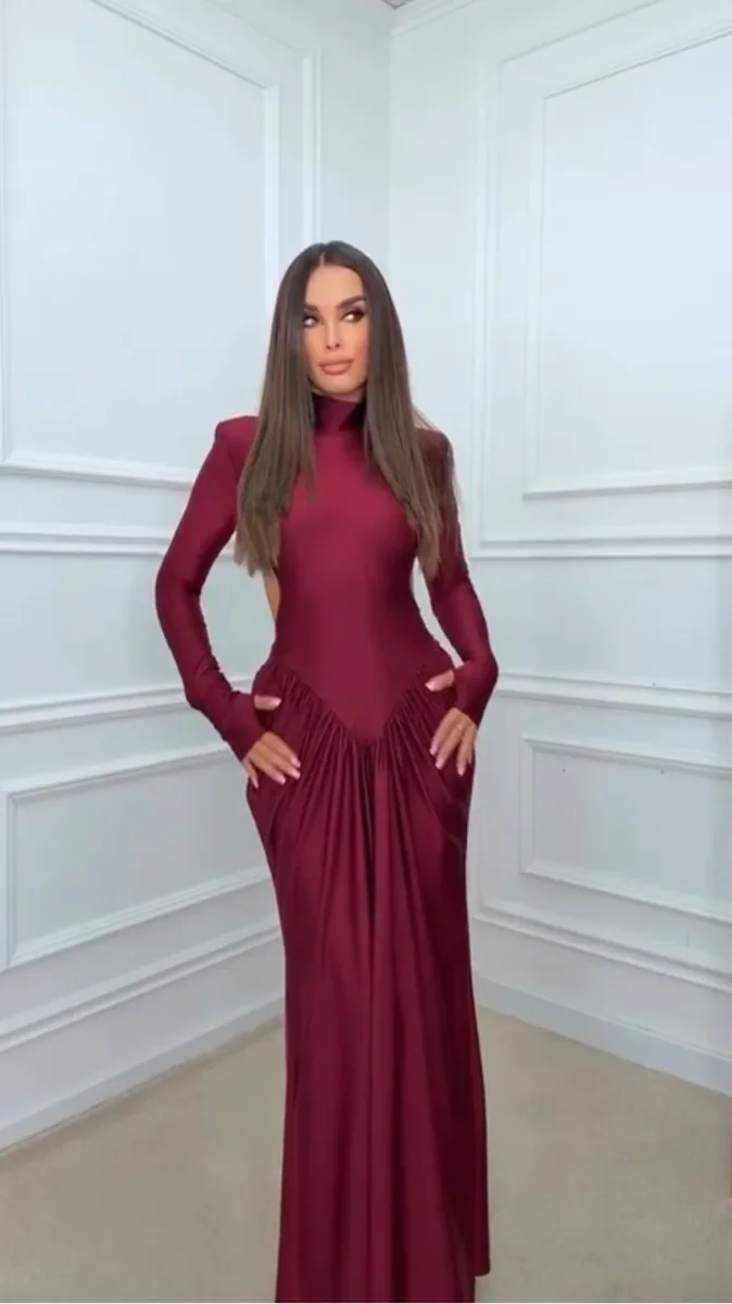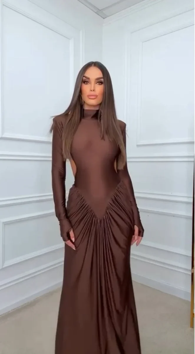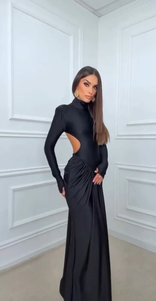 Abito lungo accollato, maniche lunghe con spalline, drappeggiato con schiena scoperta.