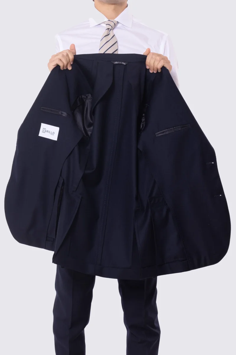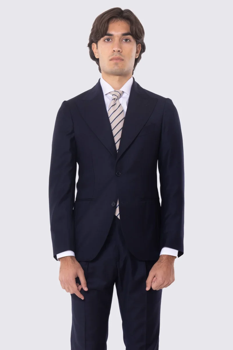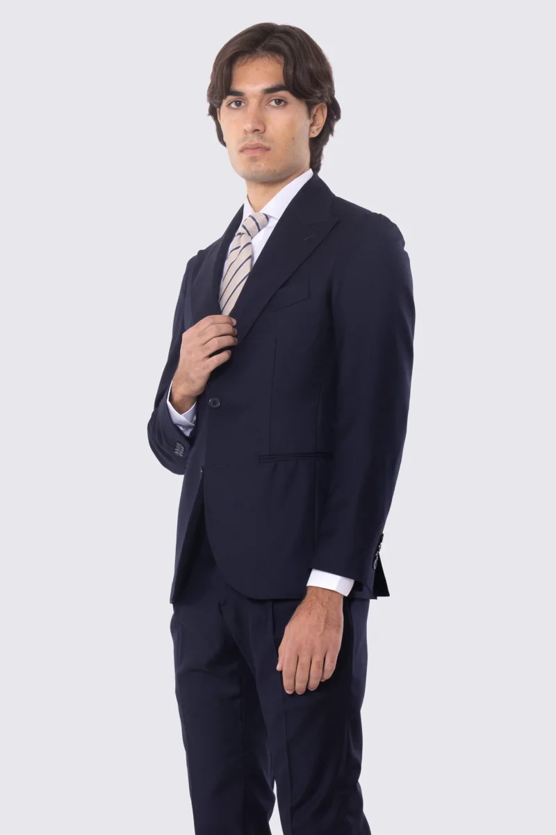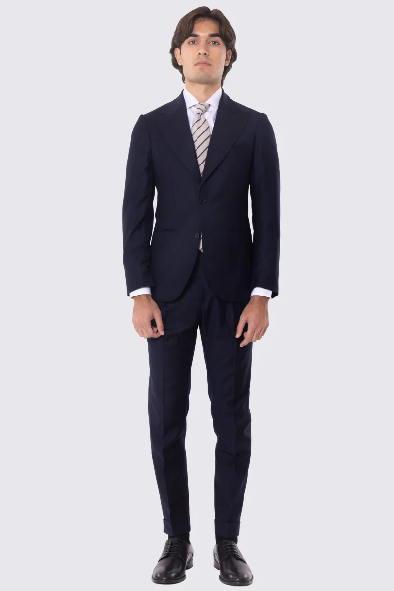 Abito blu notte con giacca monopetto rever a lancia tasche a filo e pantalone vita alta doppia pinces e risvolto 5cm 100% lana Flanella Carillo Drapers