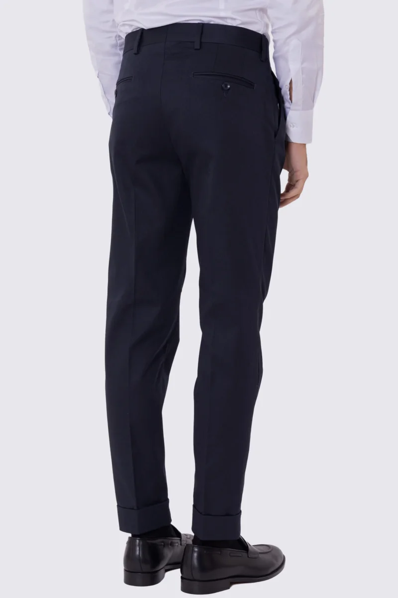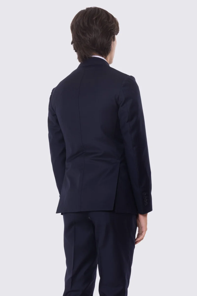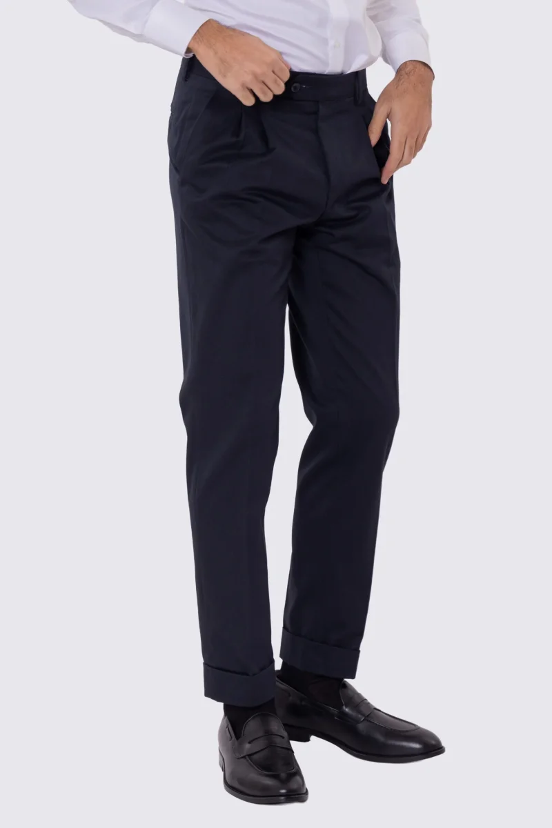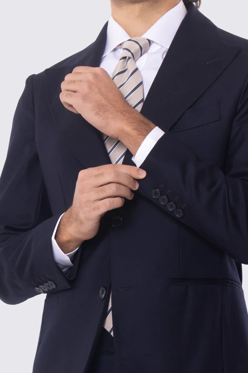 Abito blu notte con giacca monopetto rever a lancia tasche a filo e pantalone vita alta doppia pinces e risvolto 5cm 100% lana Flanella Carillo Drapers