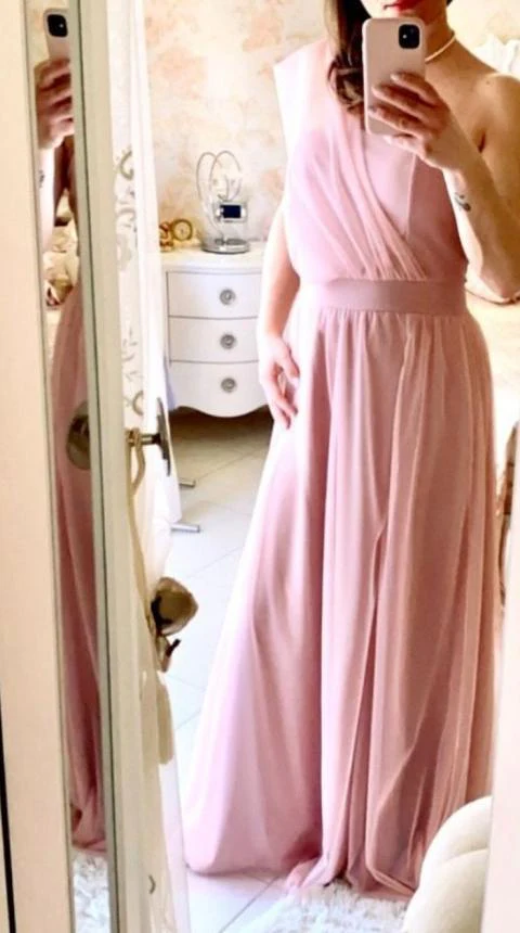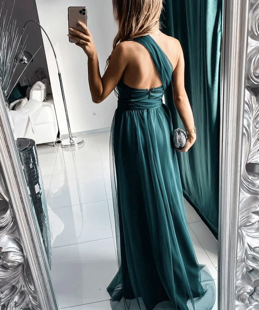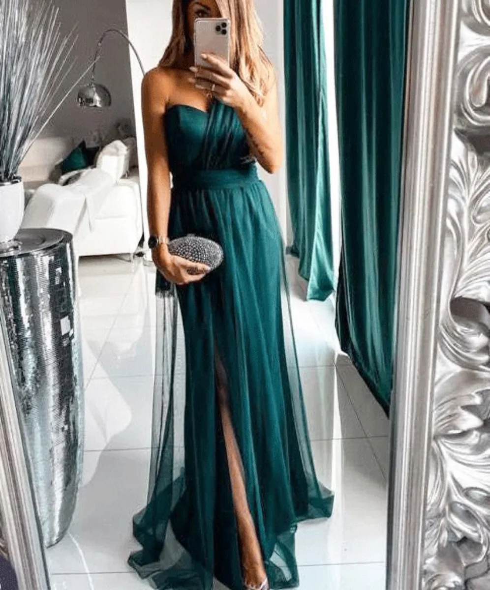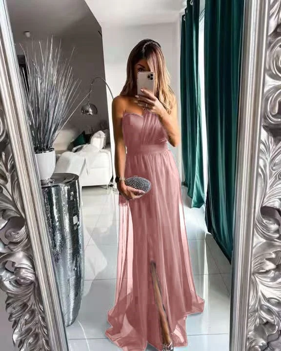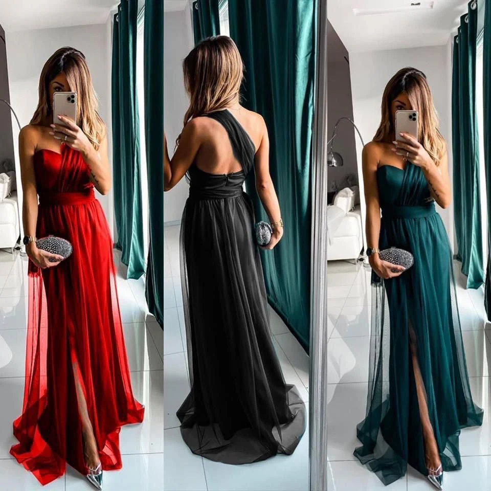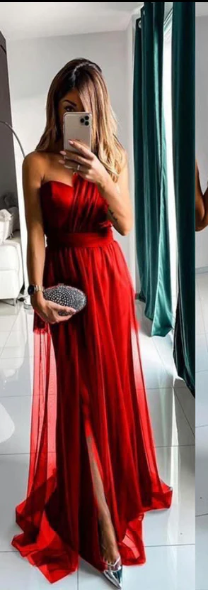 Abito lungo in tulle con corpetto mnospalla gonna mobida con spacco laterale.