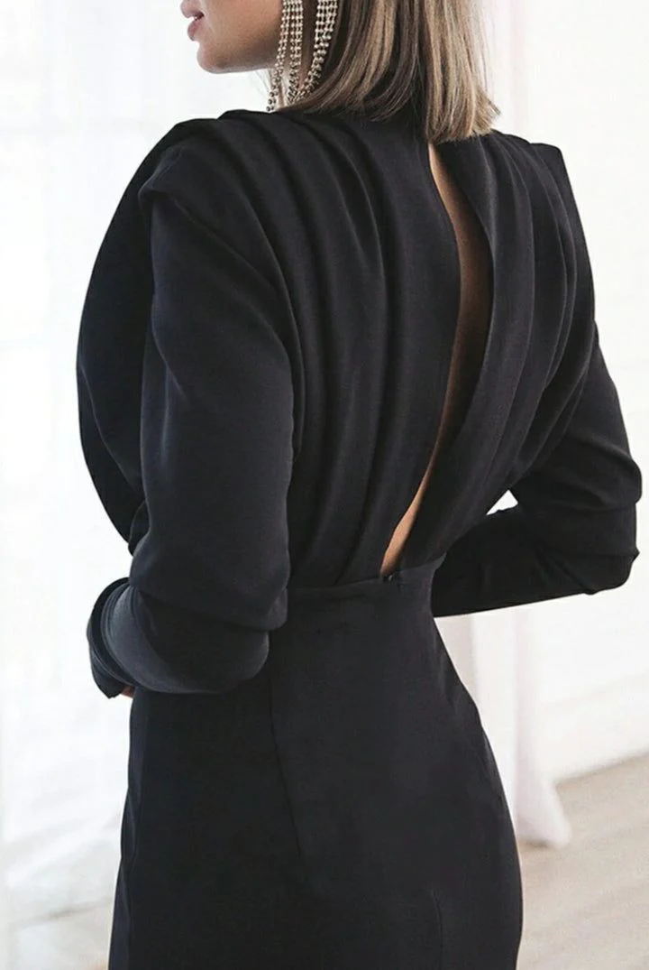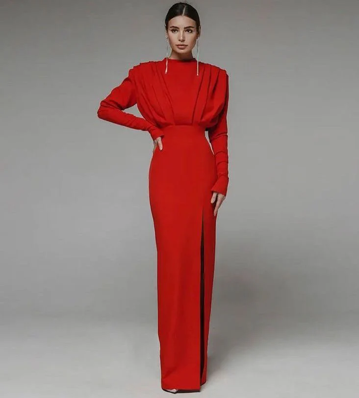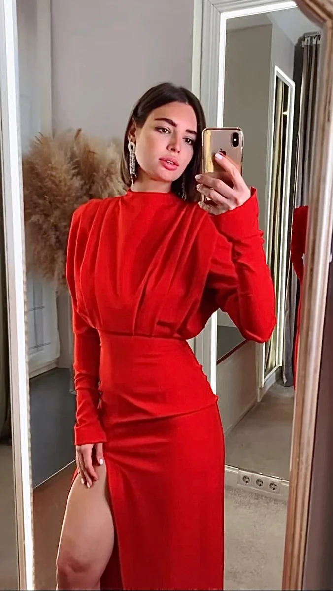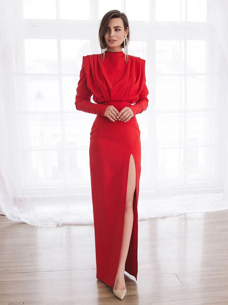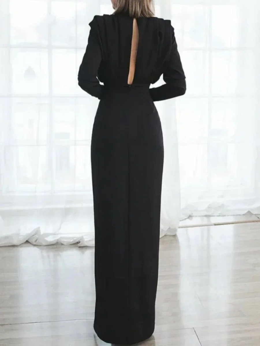 Abito lungo con drappeggio sulla parte superiore e apertura sulla schiena, con spacco laterale.