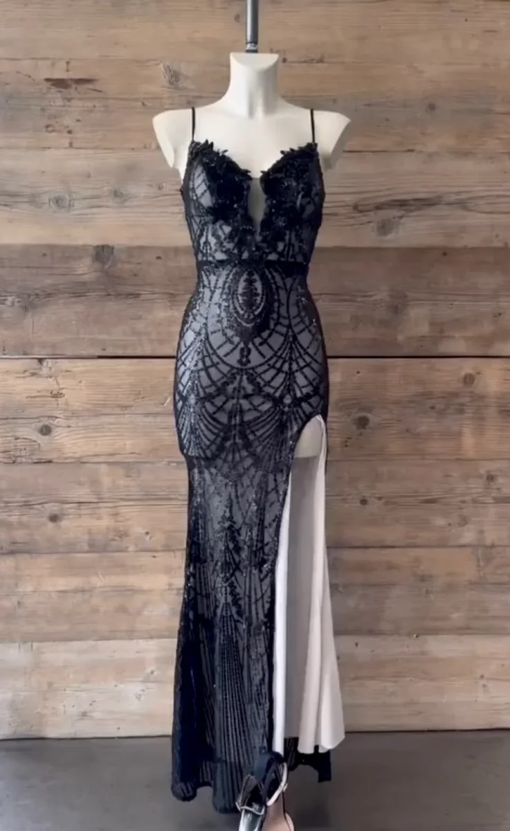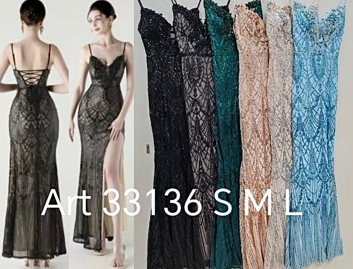 Abito lungo da cerimonia, taglio a sirena, lavorato con paillettes.