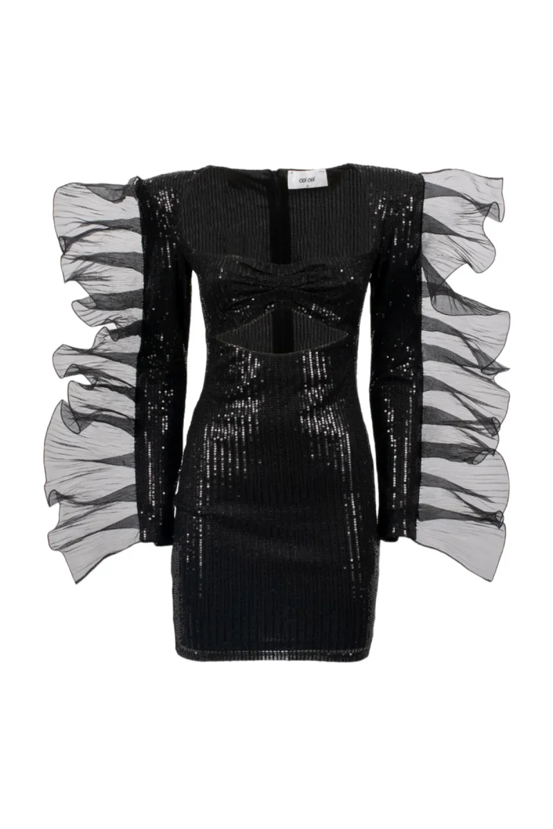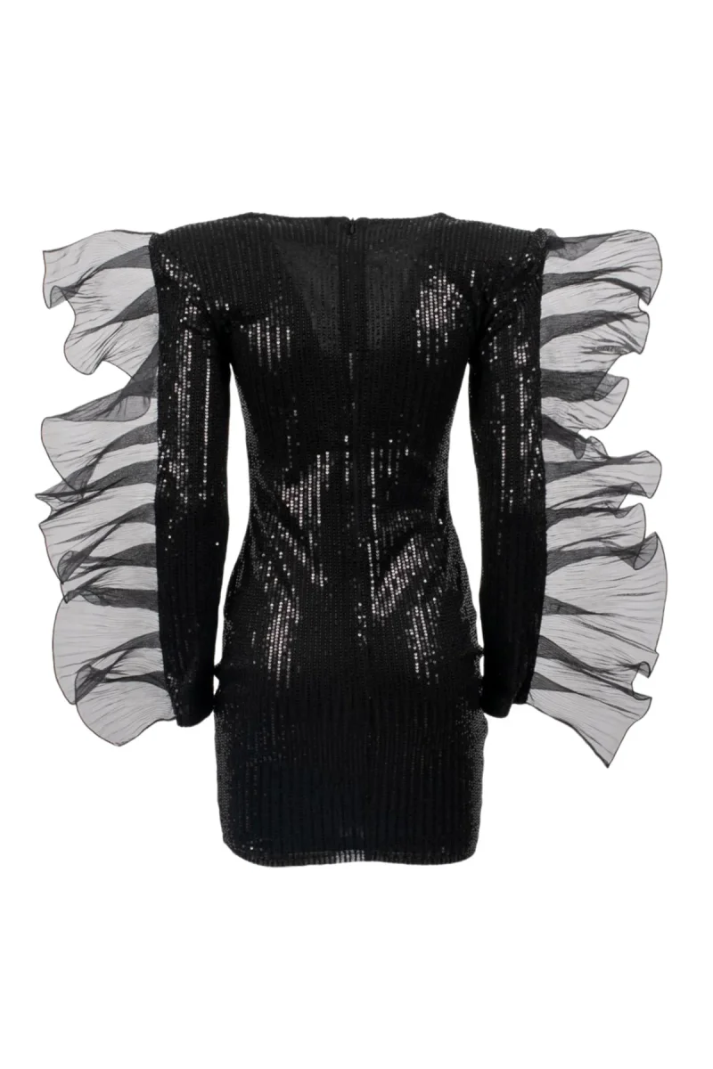 Abito donna corto in micro pailettes nero manica lunga rouches in organza con spalline