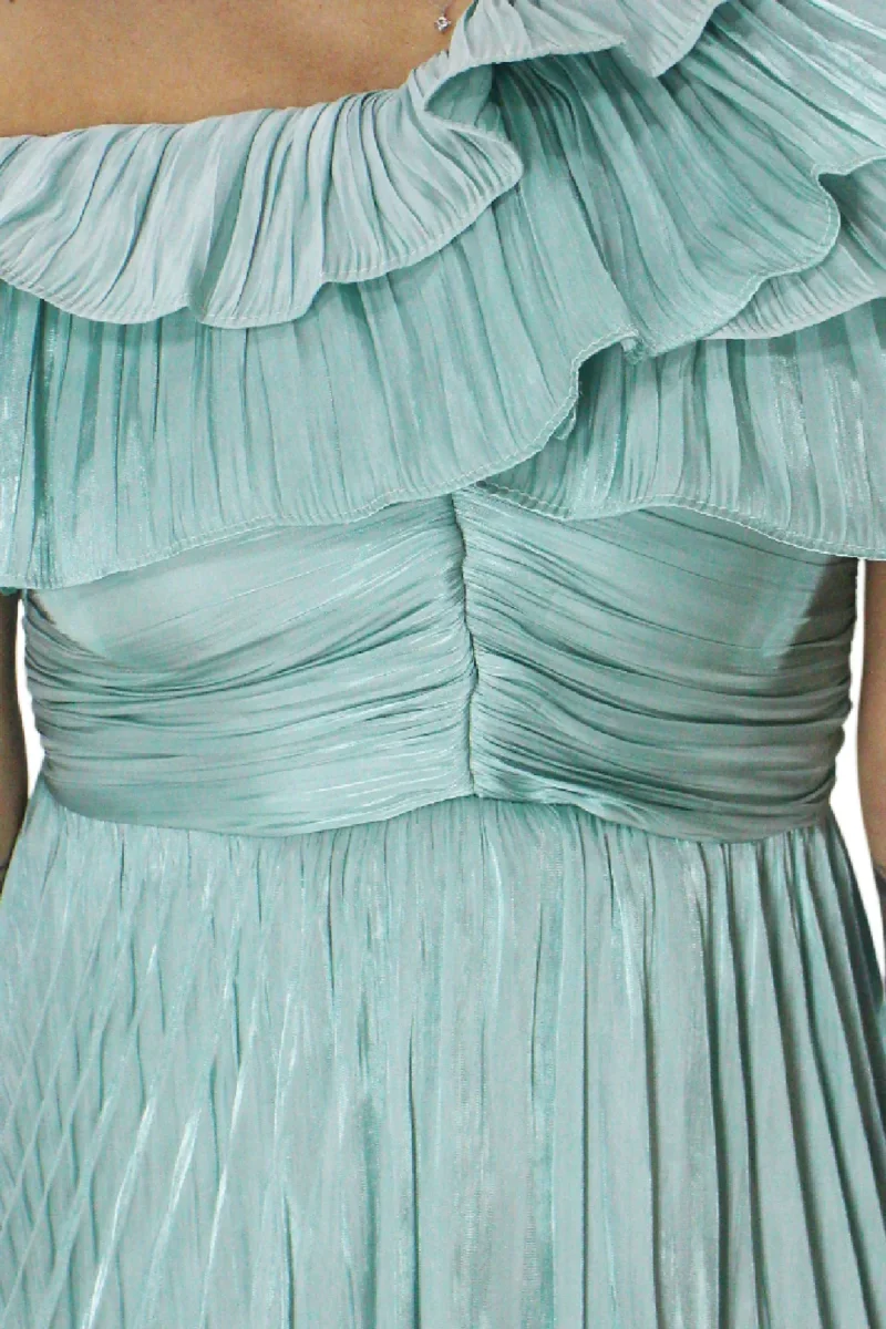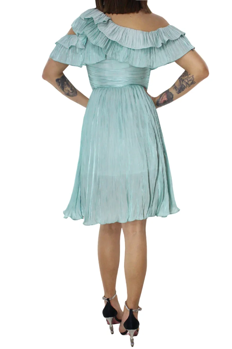 Abito donna corto monospalla con balze tessuto effetto metal chiusura cerniera lato
