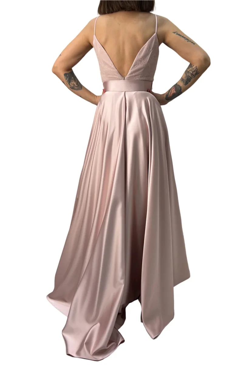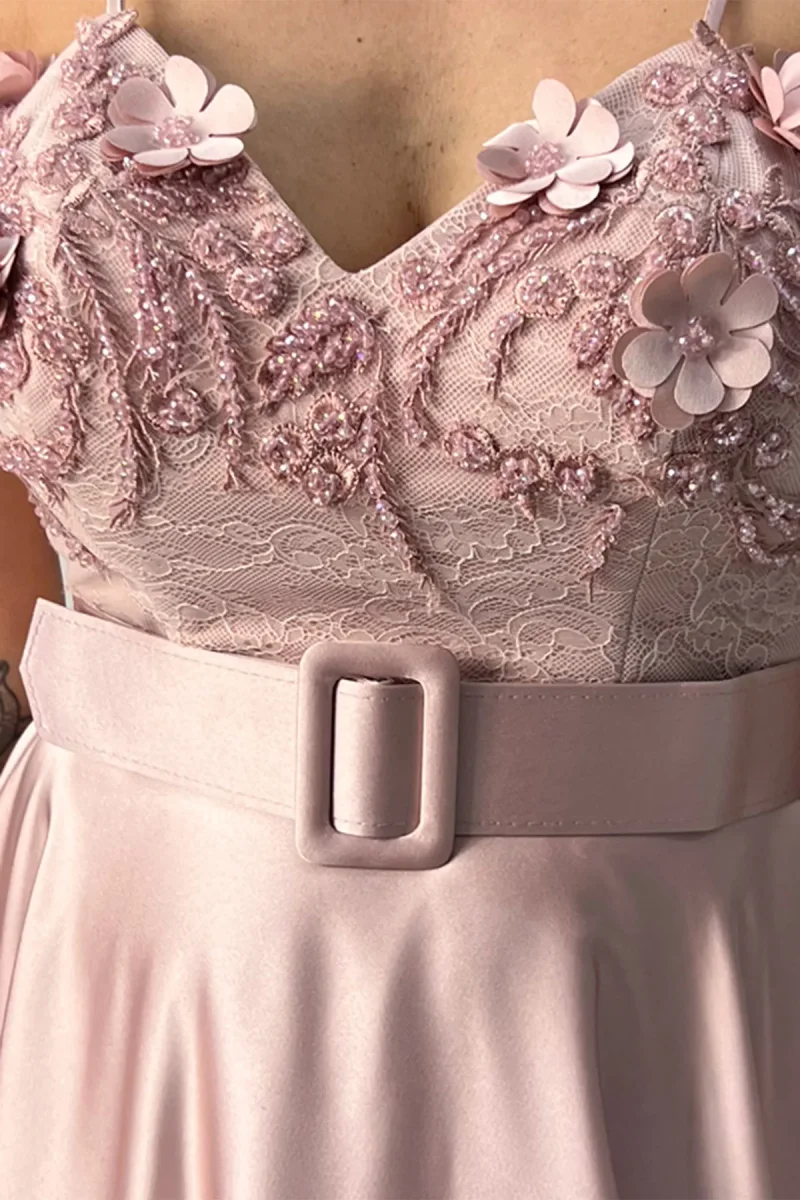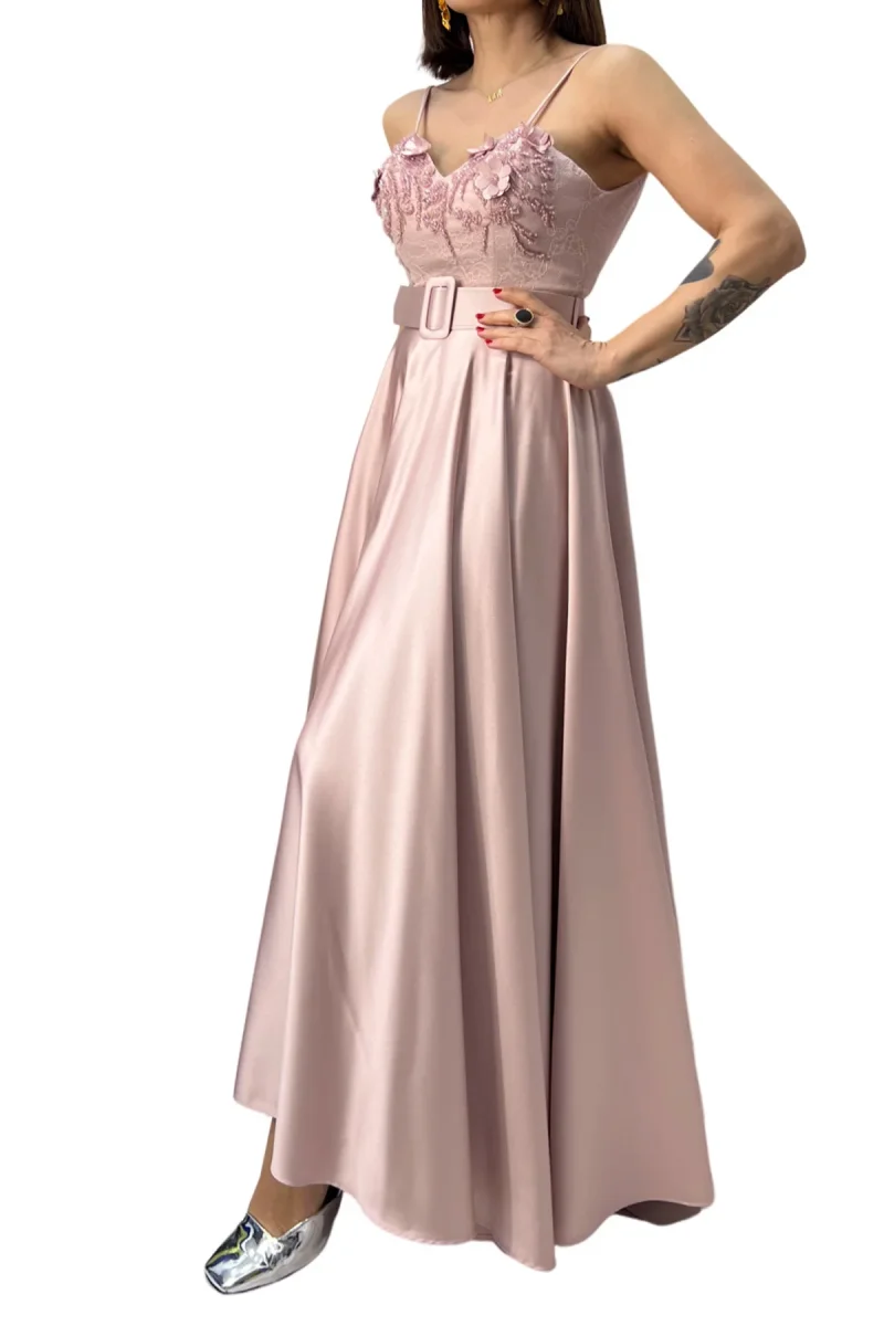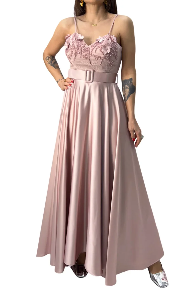 Abito donna longuette in raso con cintura removibile e con corpetto in pizzo con inserti ricamati a mano