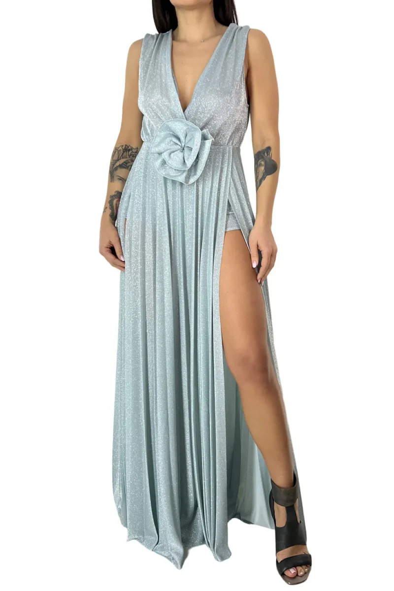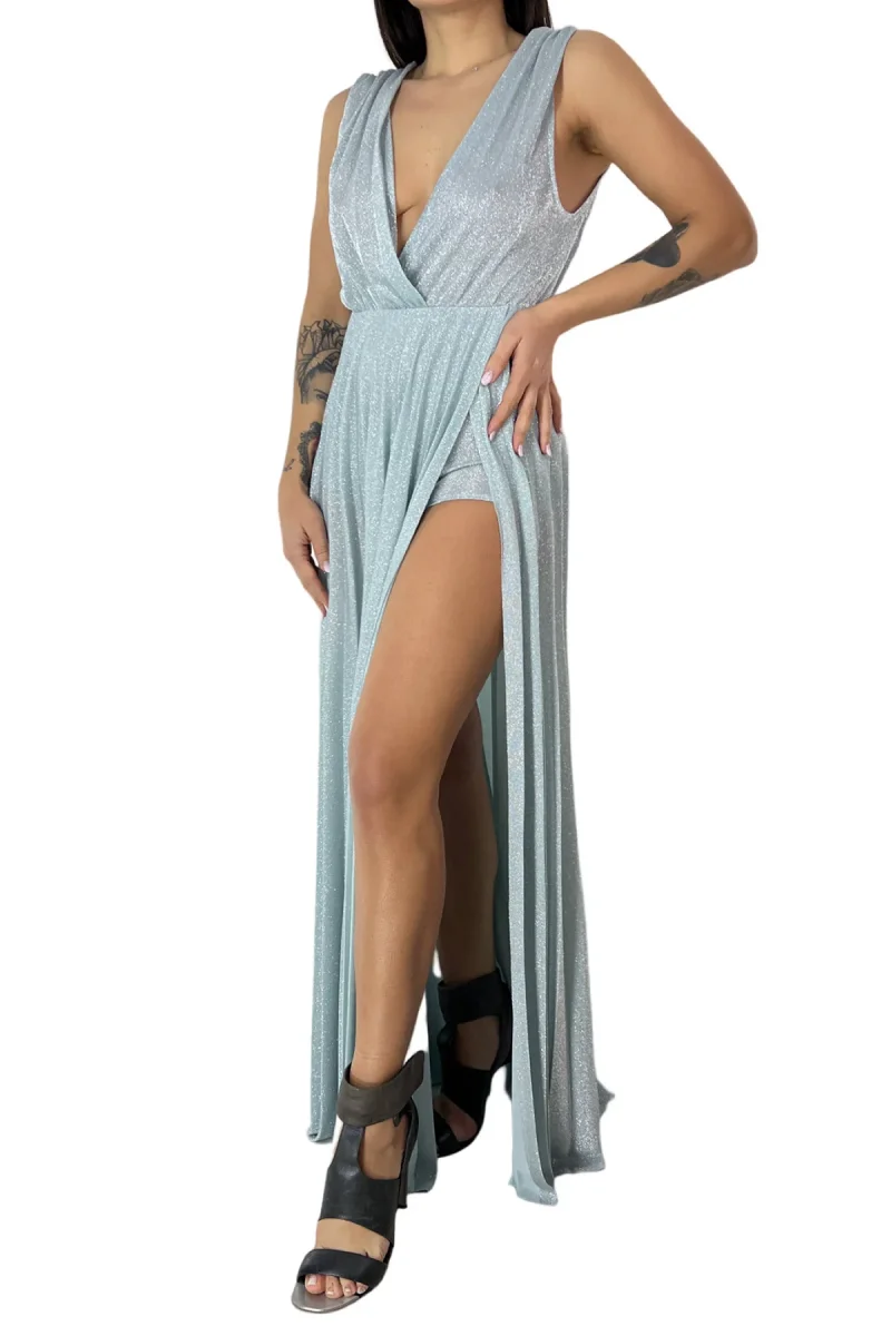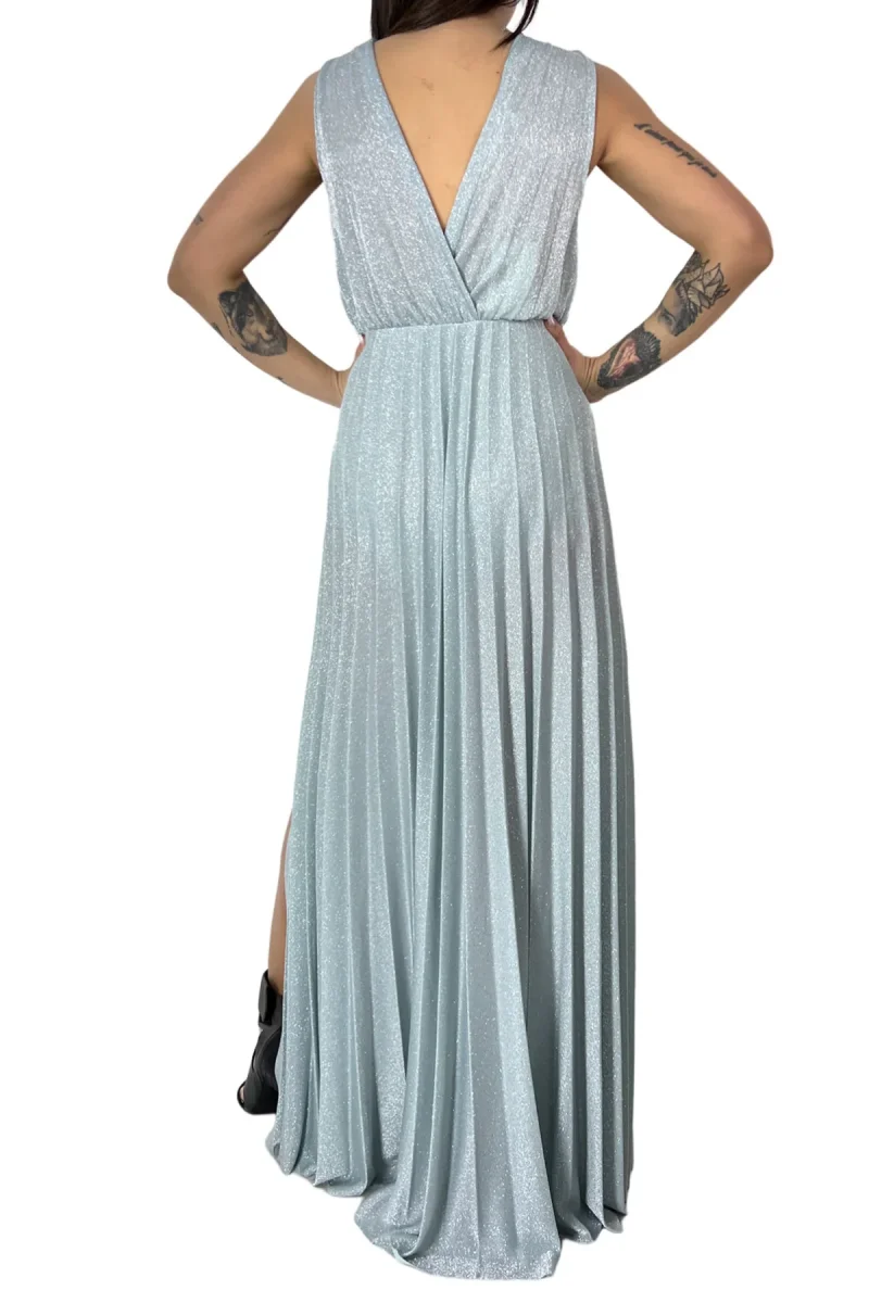 Abito donna lungo micro plisse tessuto lurex fili argento scollo a V incrocio giromanica e spacchi alti