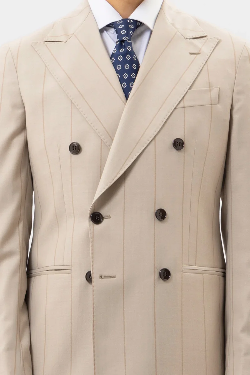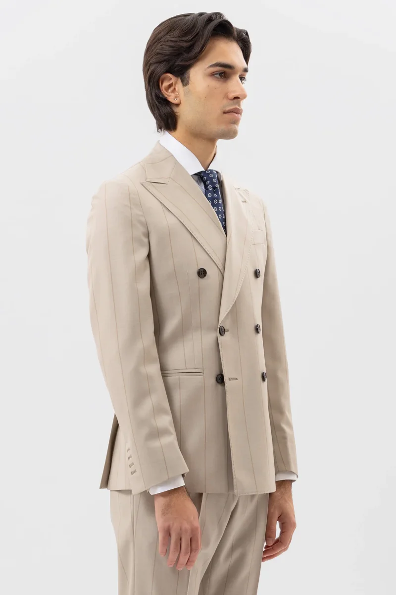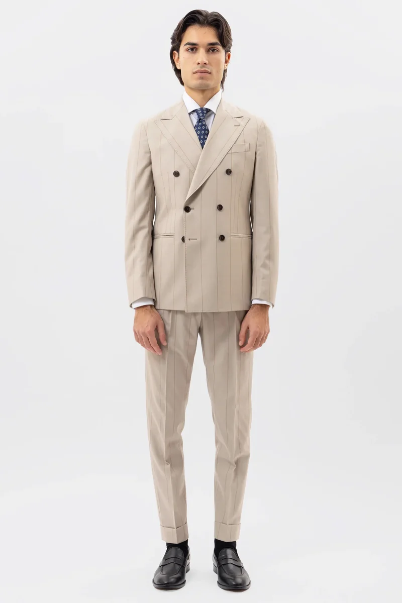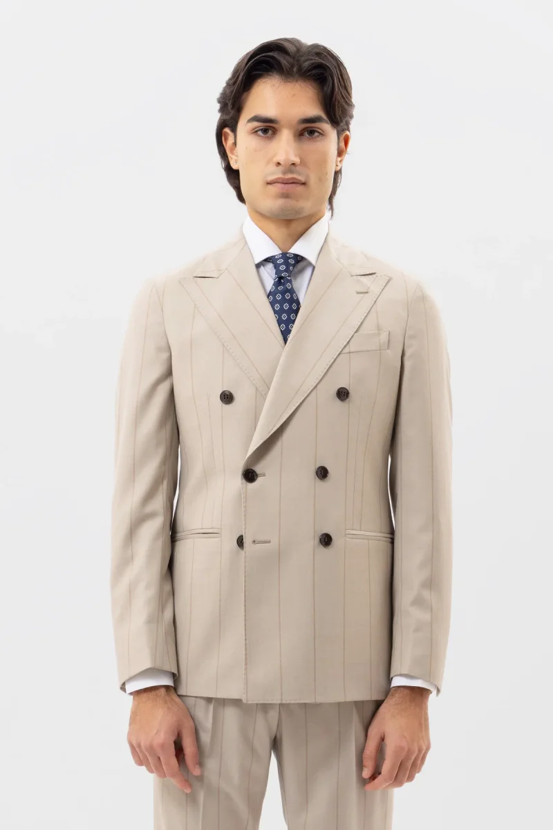 Abito Doppiopetto Beige Gessata Fango Uomo in Fresco Lana Super 130s – Eleganza Sartoriale Made in Italy