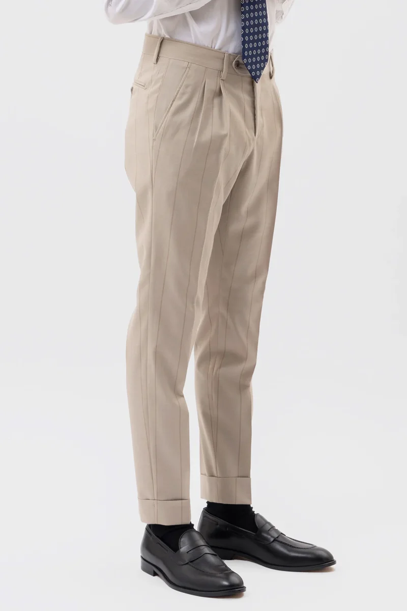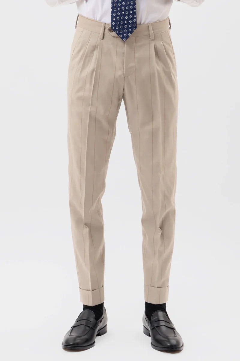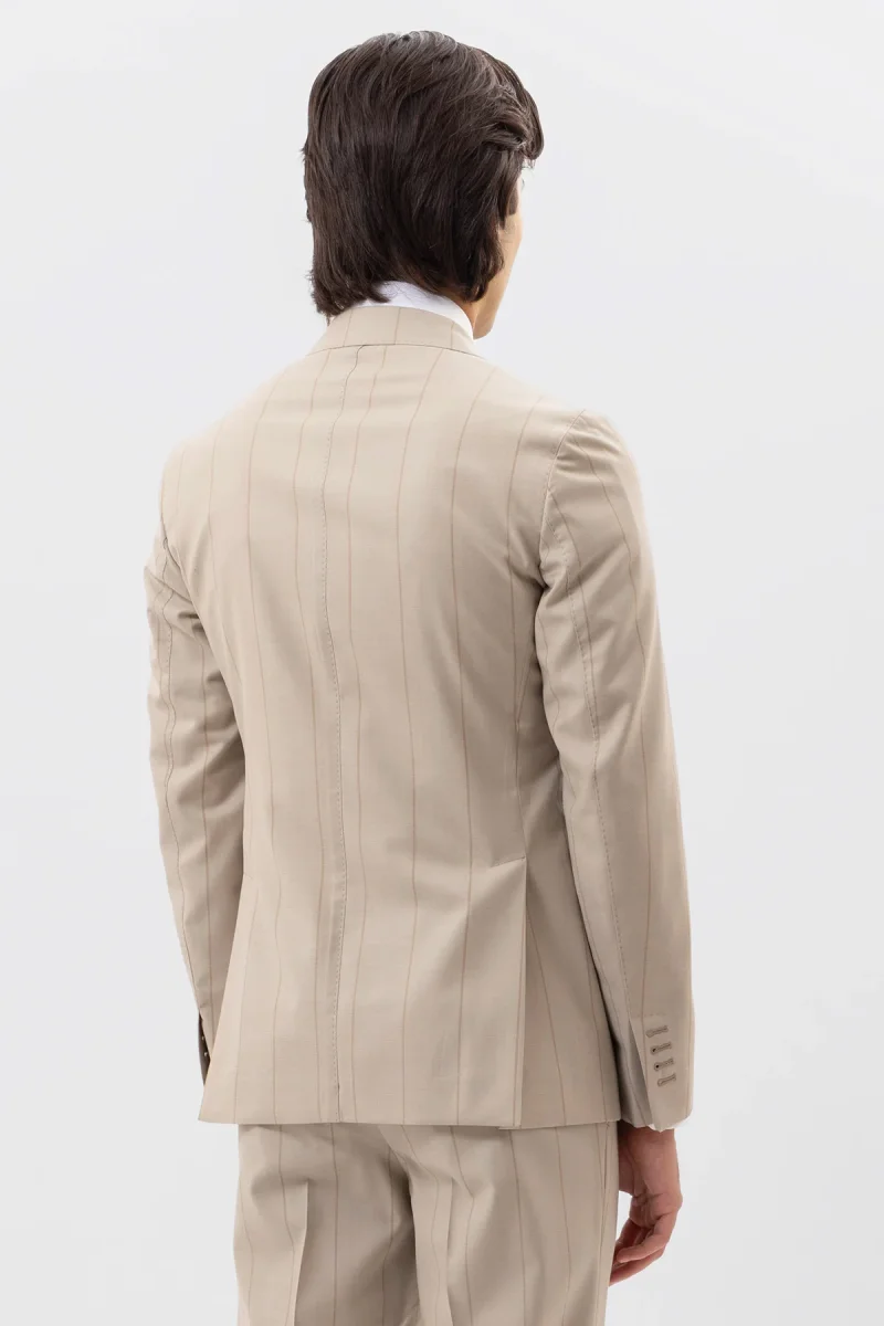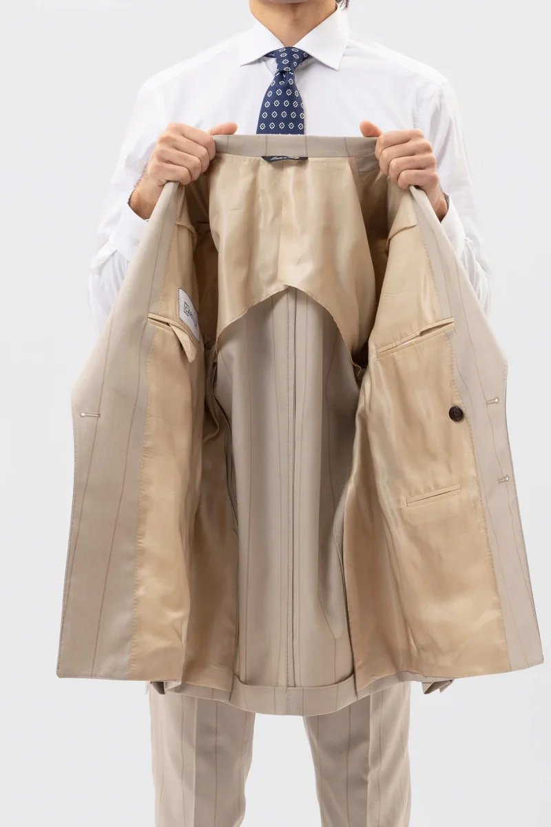 Abito Doppiopetto Beige Gessata Fango Uomo in Fresco Lana Super 130s – Eleganza Sartoriale Made in Italy