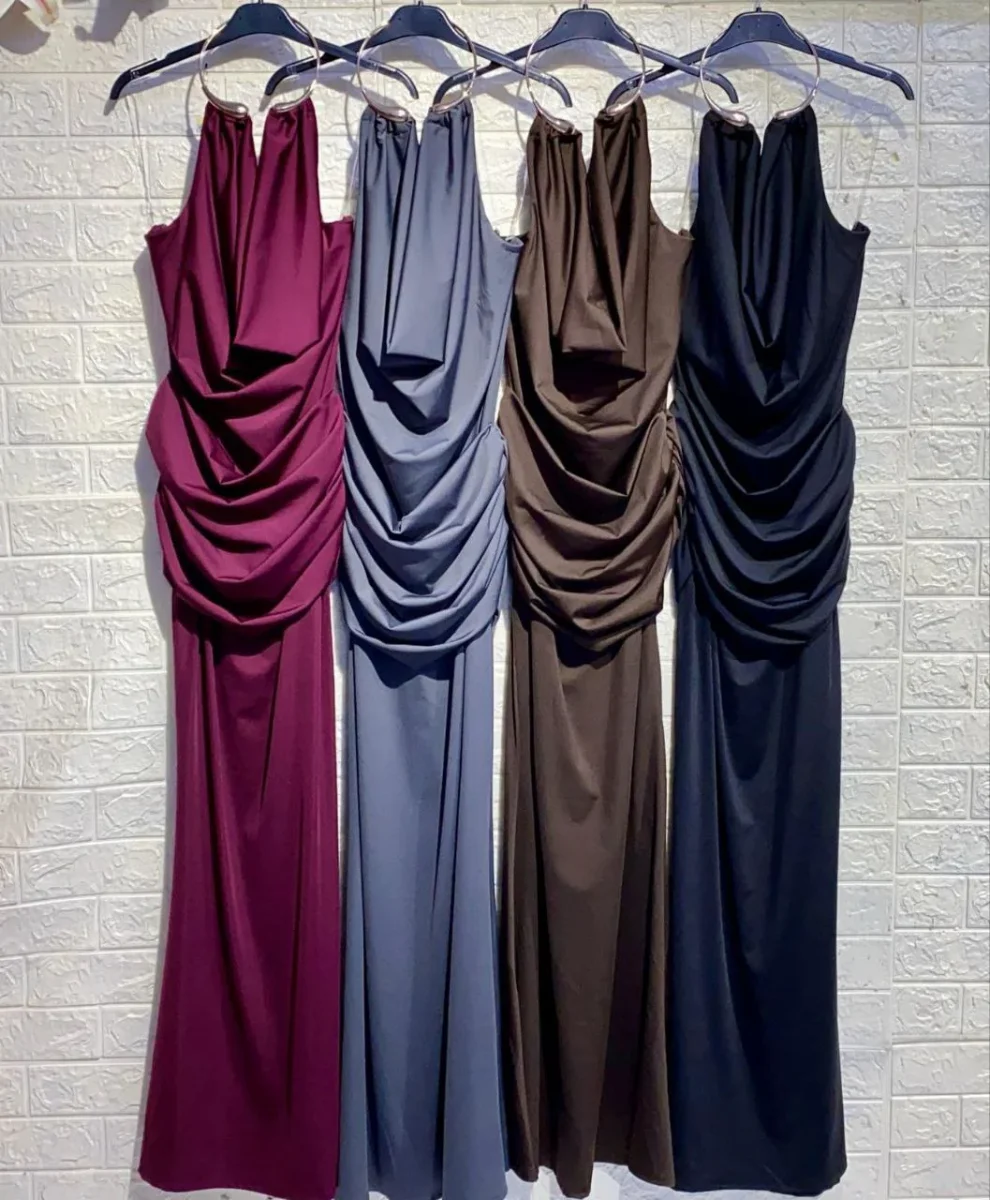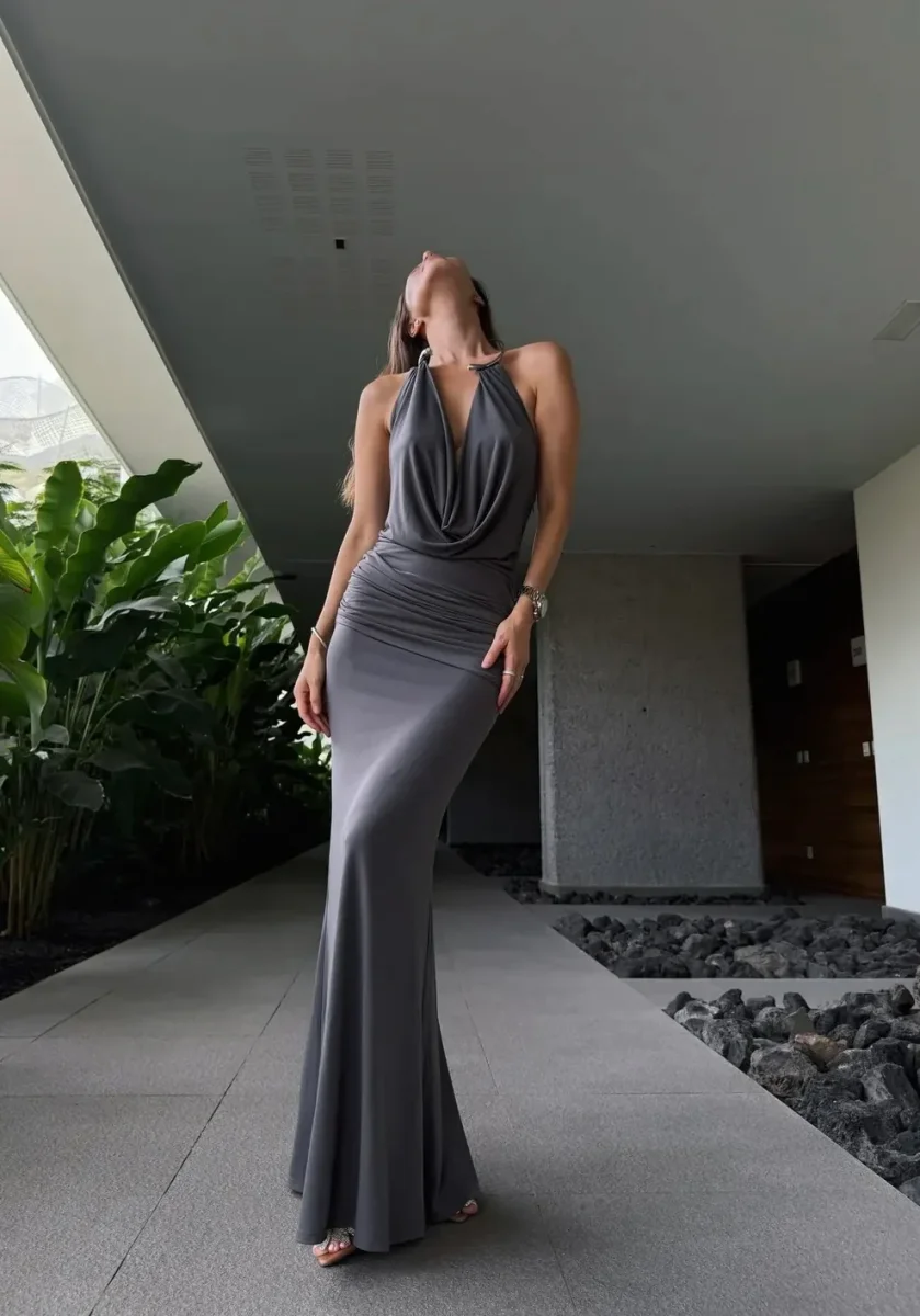 Abito lungo drappeggiato con scollo a cascata dotato di dettaglio in metallo. Tessuto con elasticizzato.