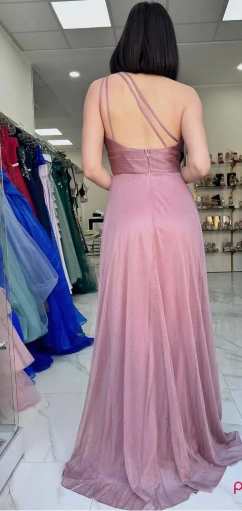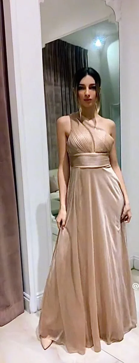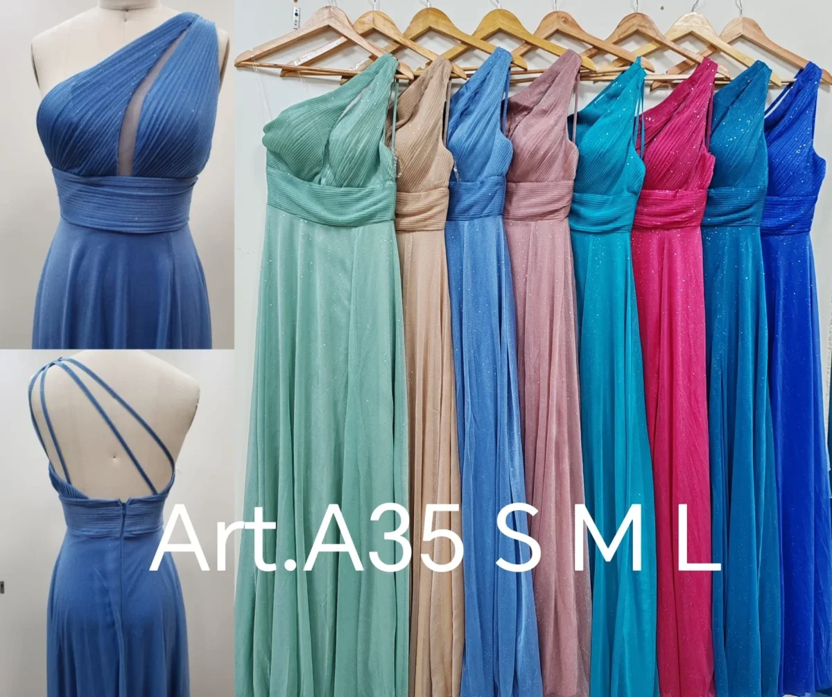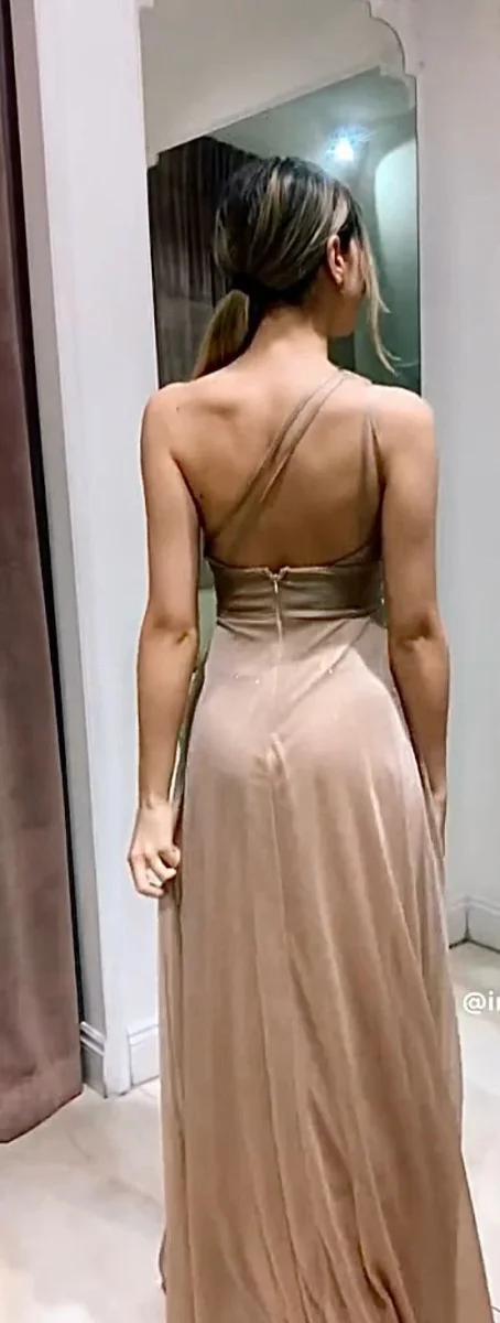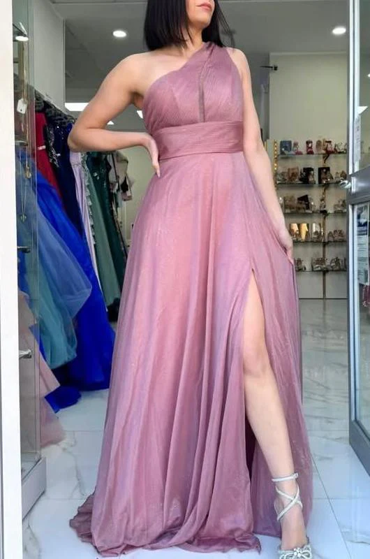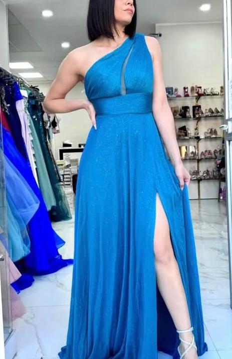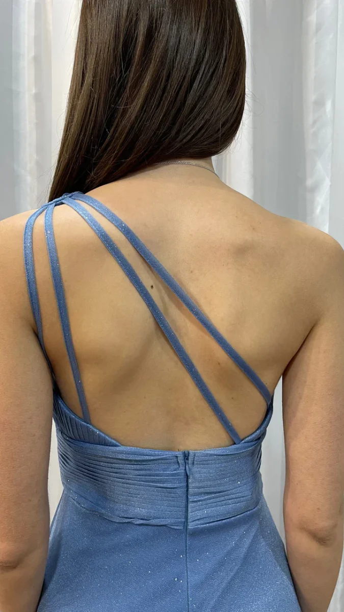 Abito da cerimonia monospalla in chiffon. Chiusura posteriore con cerniera.