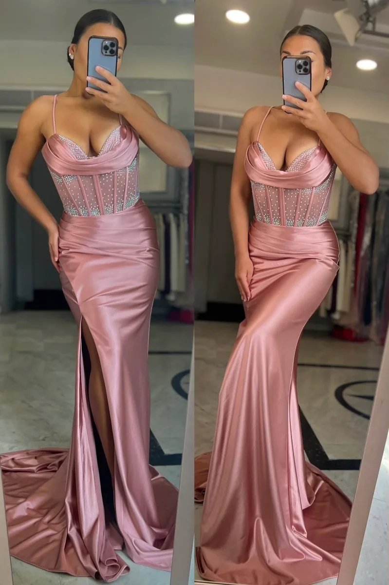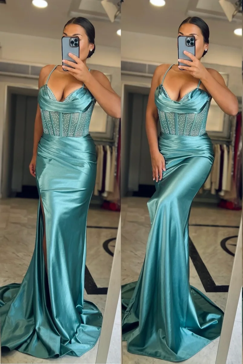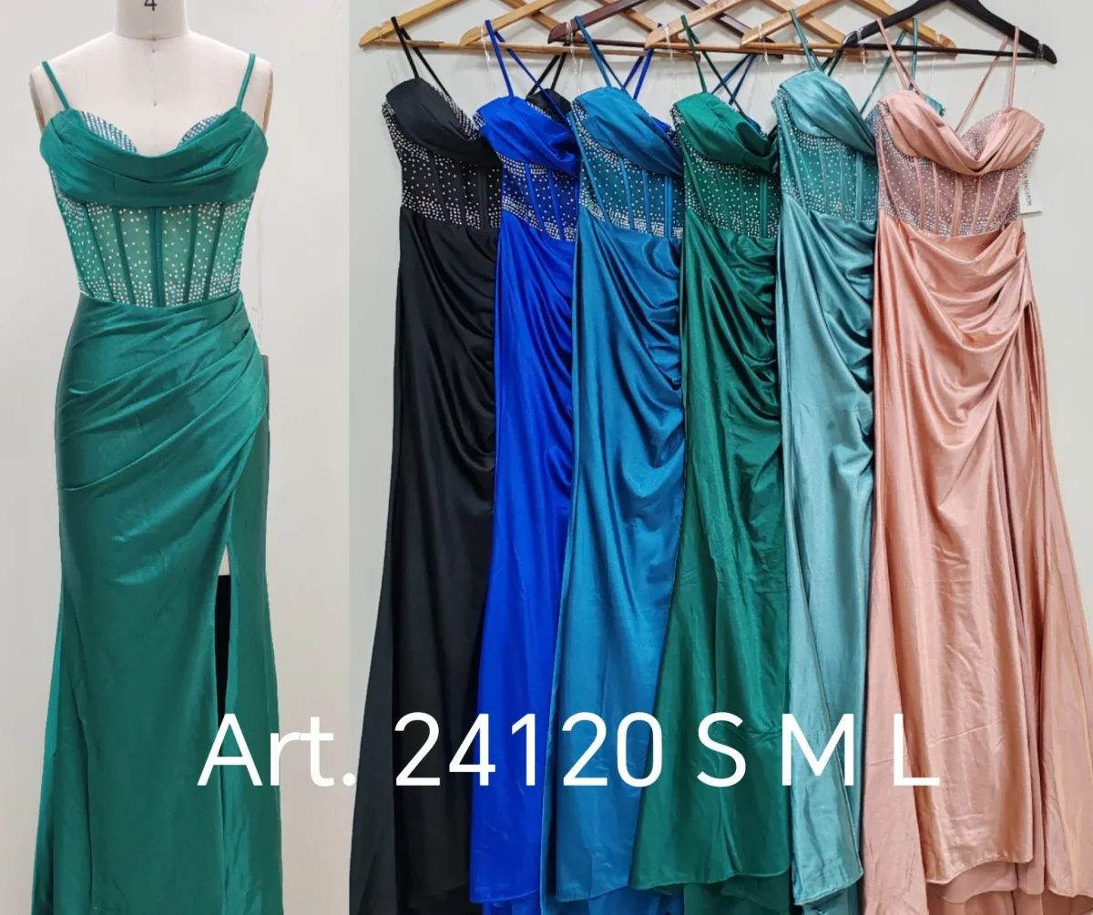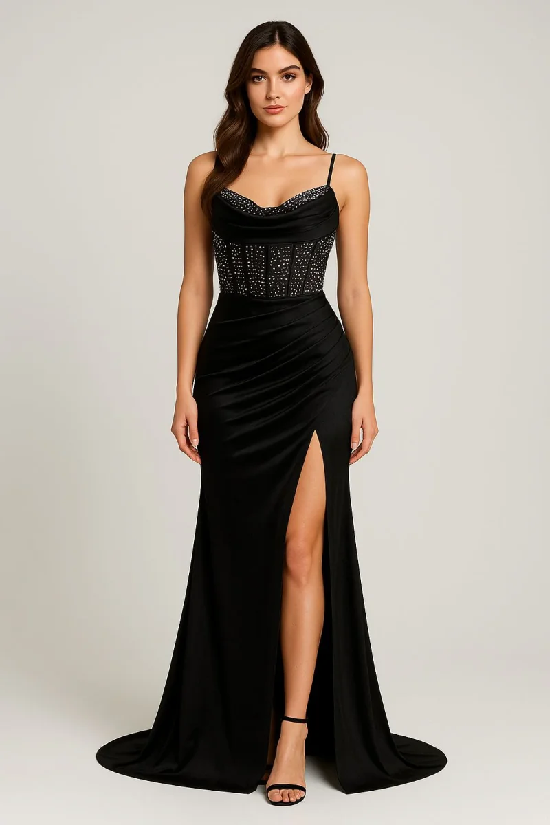 Abito lungo con bustino impreziosito da strass e drappeggio. Con spacco laterale.