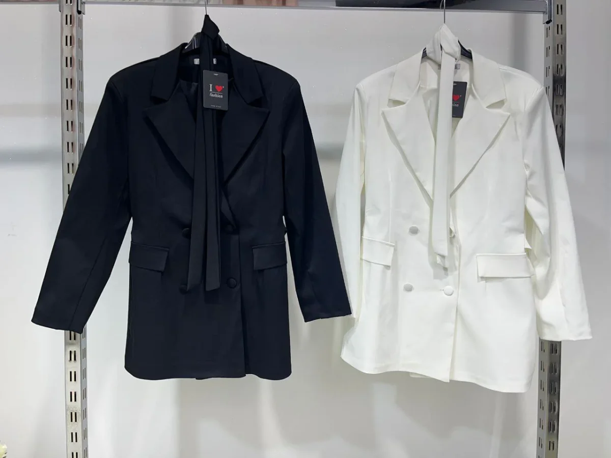 • Scollatura: Il collo è a revers classici di un blazer, ma l’abito è indossato senza nulla sotto, creando una profonda scollatura a V che arriva quasi alla vita.