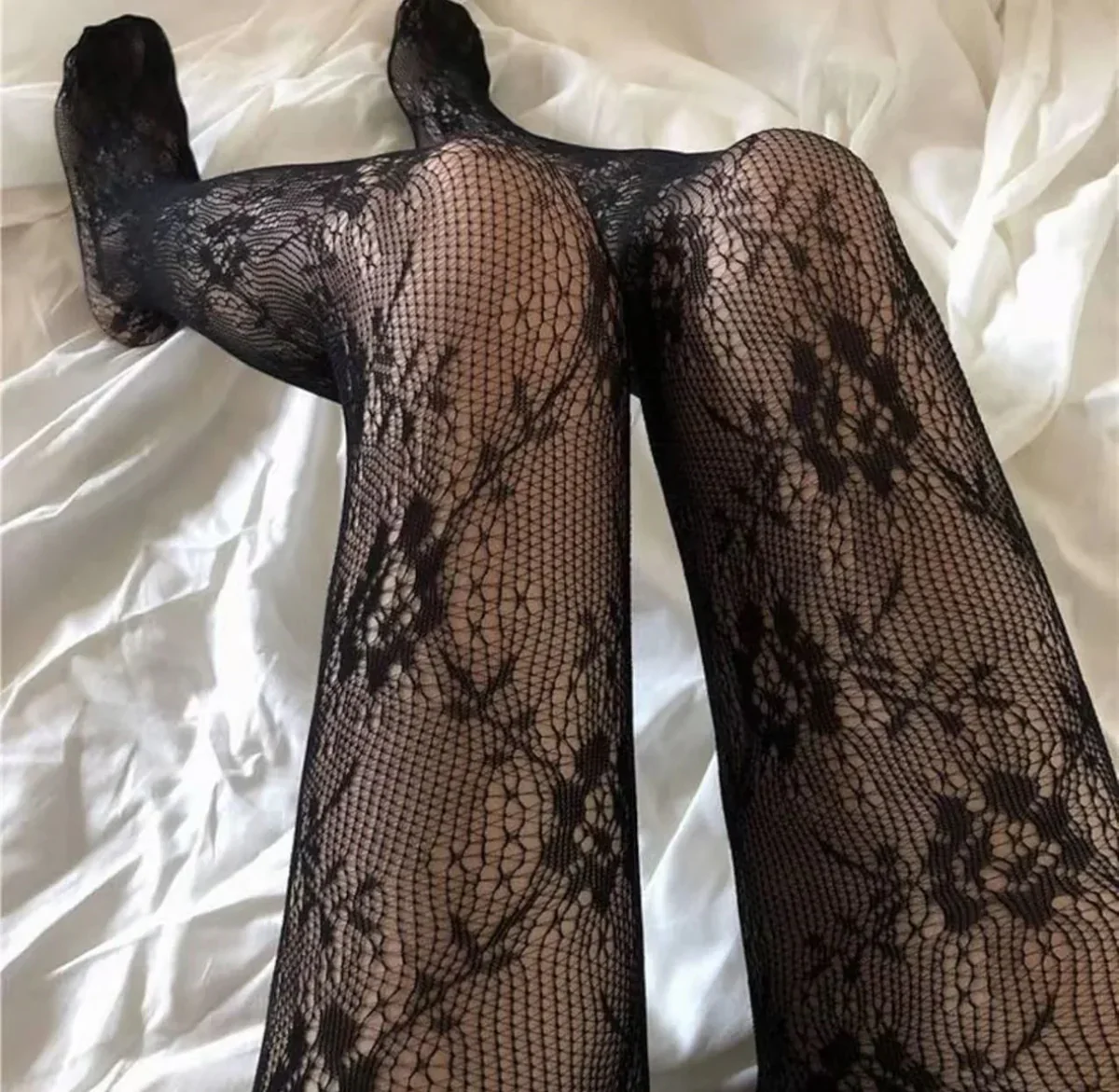 • Modello: Sono collant a fantasia floreale in pizzo (o un motivo molto elaborato che simula il pizzo/macramè) su base trasparente o a rete.