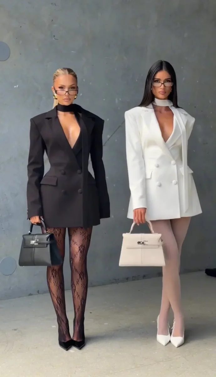 In sintesi, è un look che gioca sul contrasto tra l’eleganza bossy e strutturata dell’abito e la femminilità seducente delle calze.