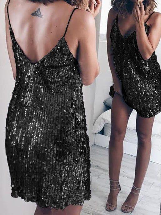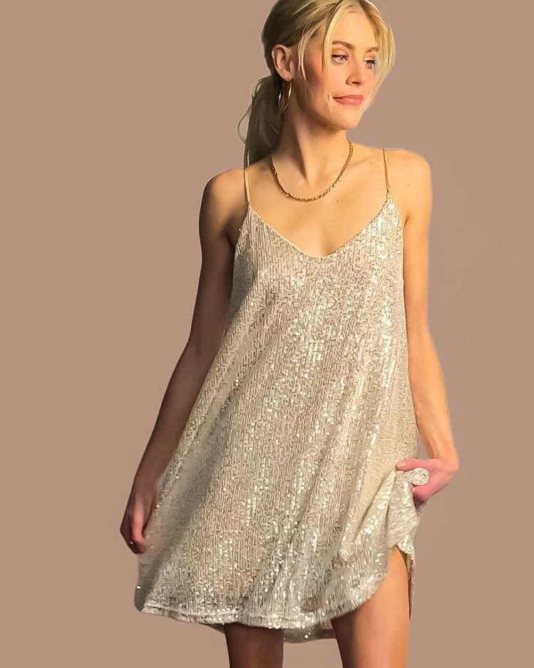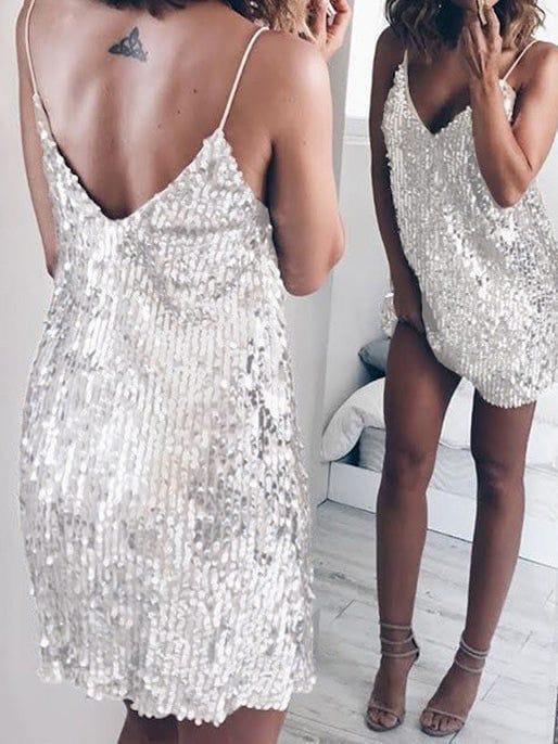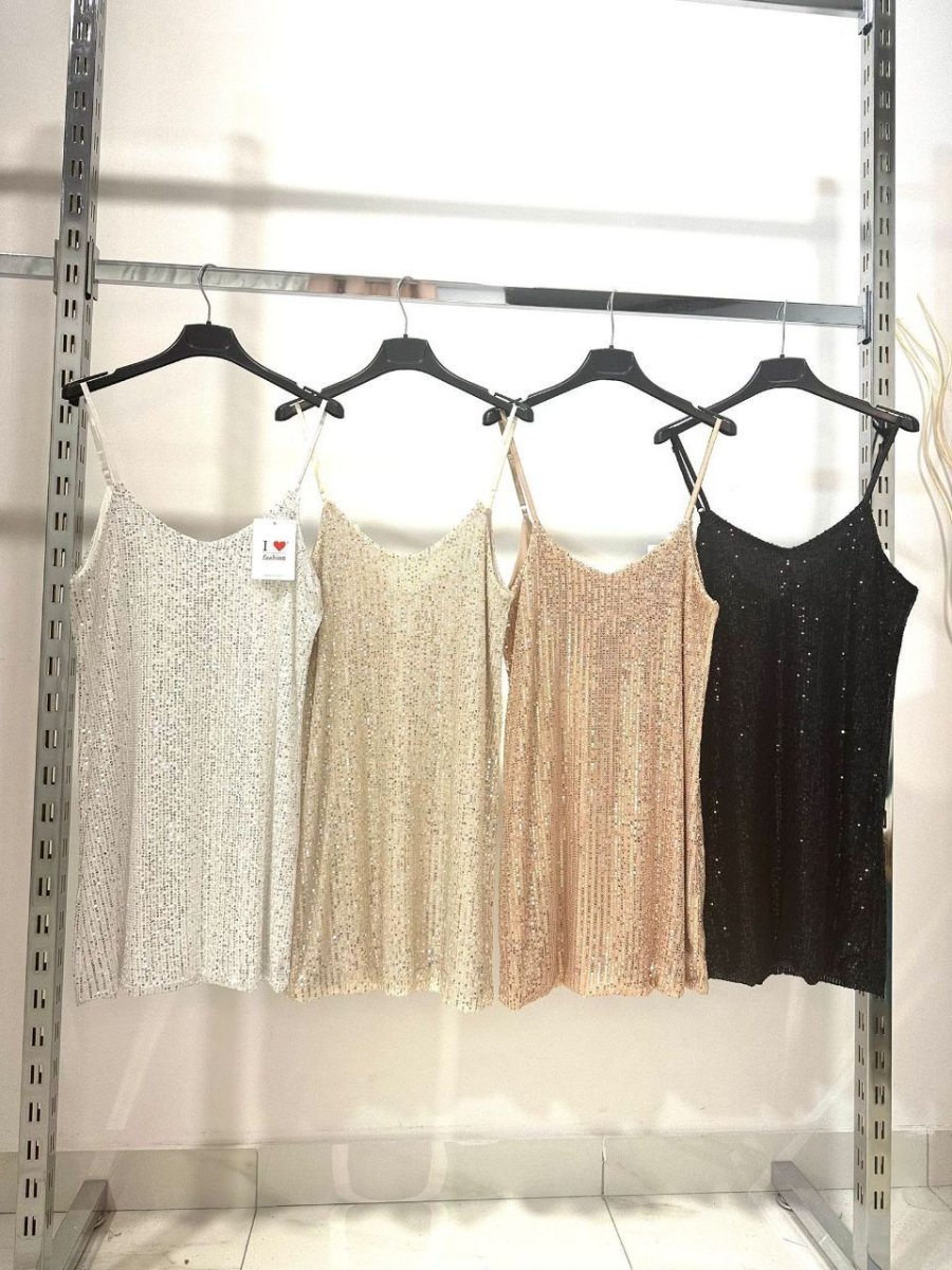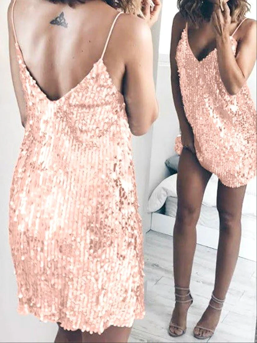 Abito corto a sacchetto completamente in paillettes, spalline sottili, scollo a V sia davanti che sul retro.
