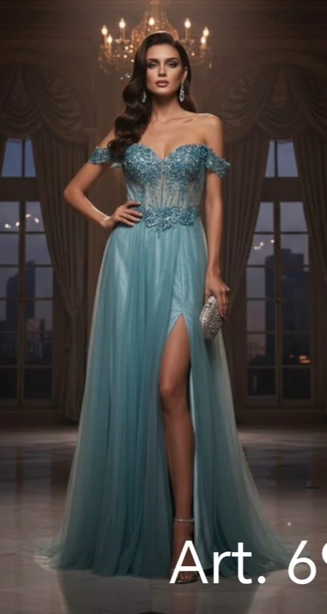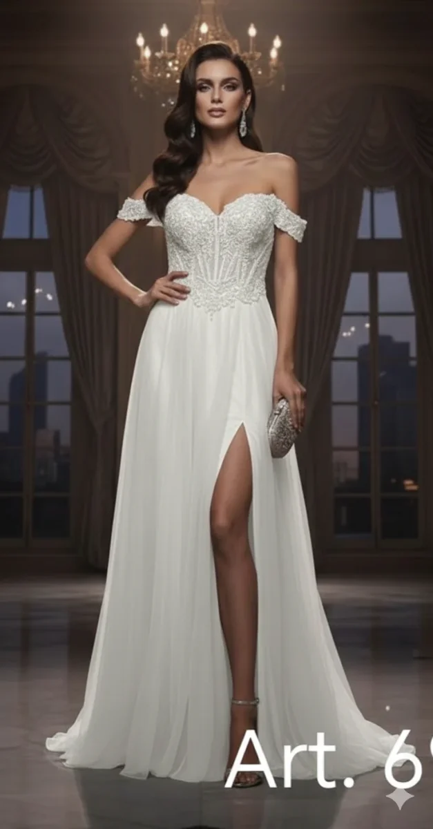 • Dettaglio “Off-the-shoulder”: Le spalline scivolano delicatamente sulle braccia, lasciando le spalle scoperte per un look sofisticato.