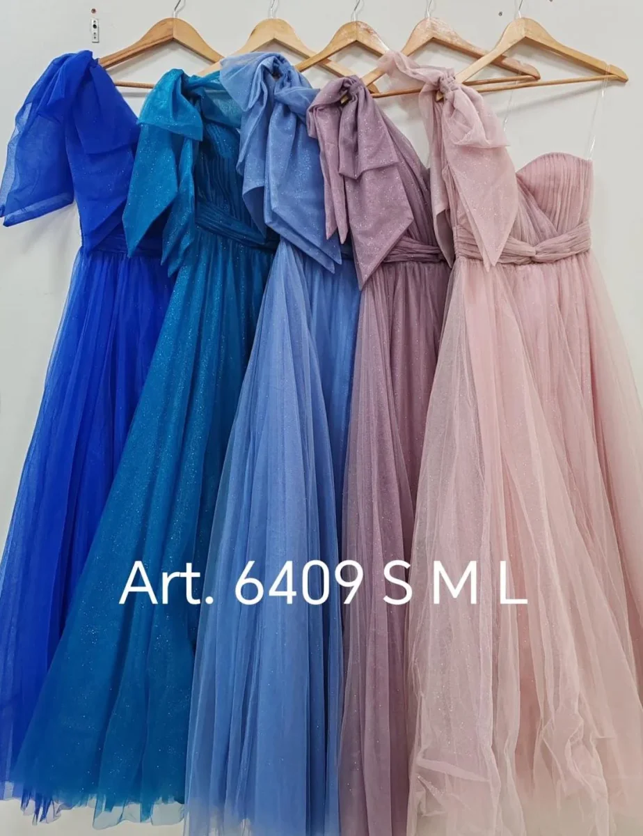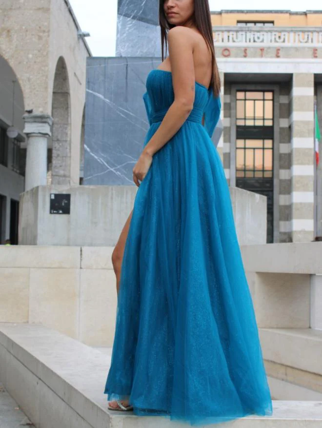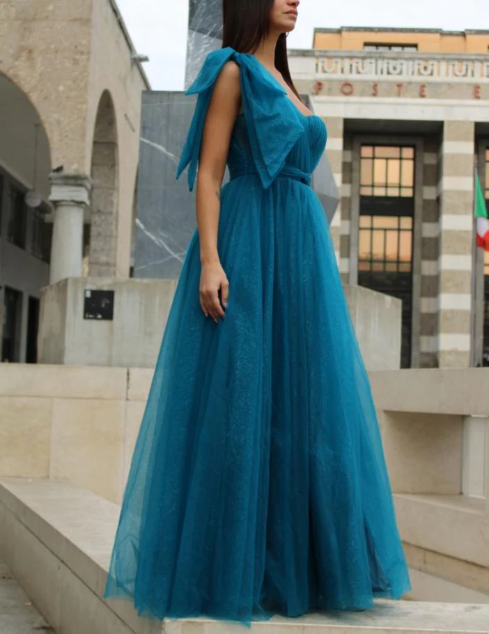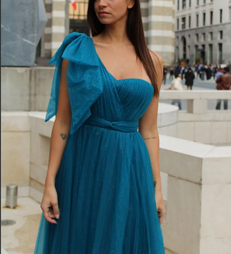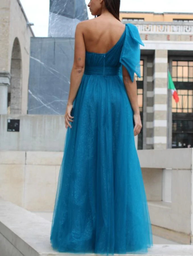 Abito lungo da cerimonia in tulle con brillantini, monospalla con fiocco