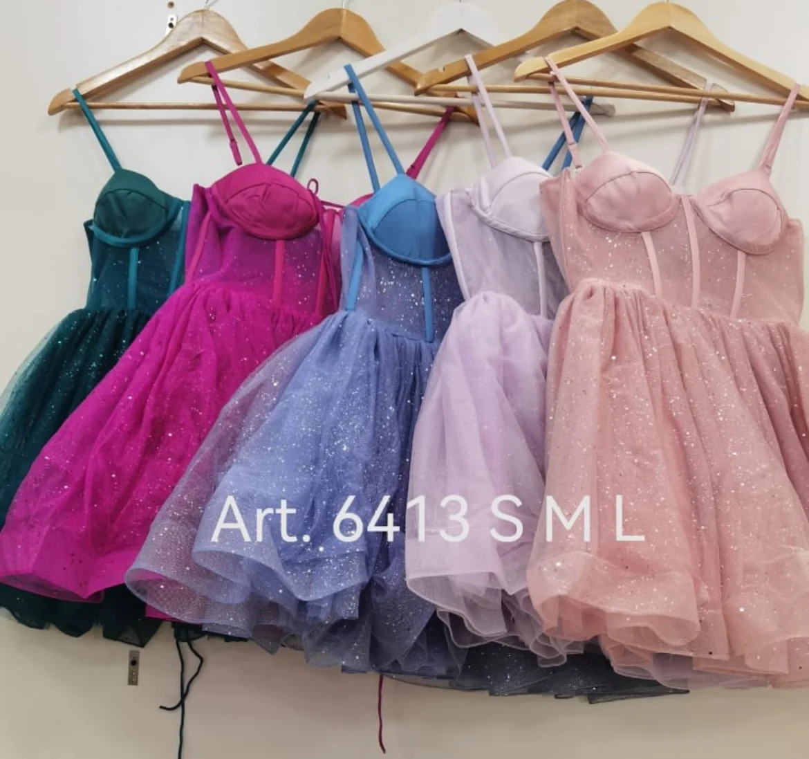 Abito corto con bustino e coppe seno in tulle con brillantini.