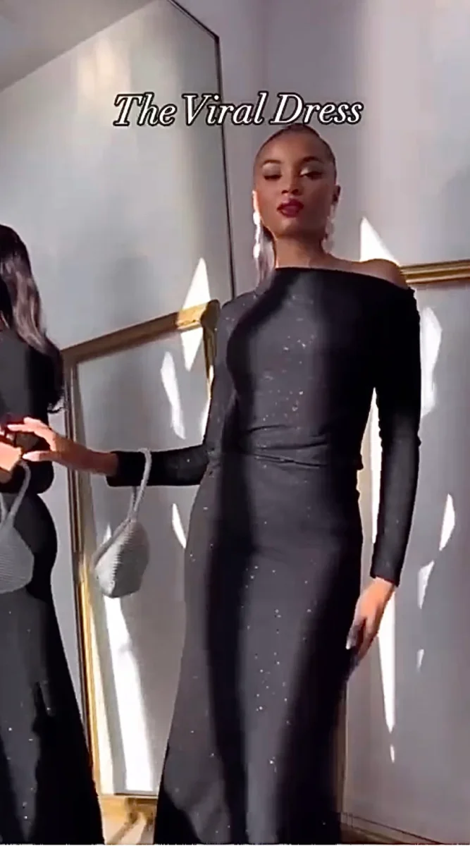 Abito lungo elegante, brillantinato con drappeggio in vita.