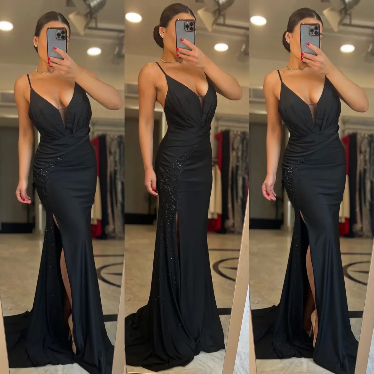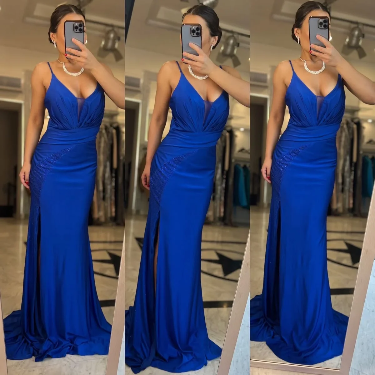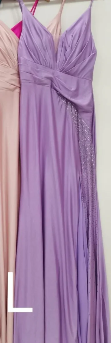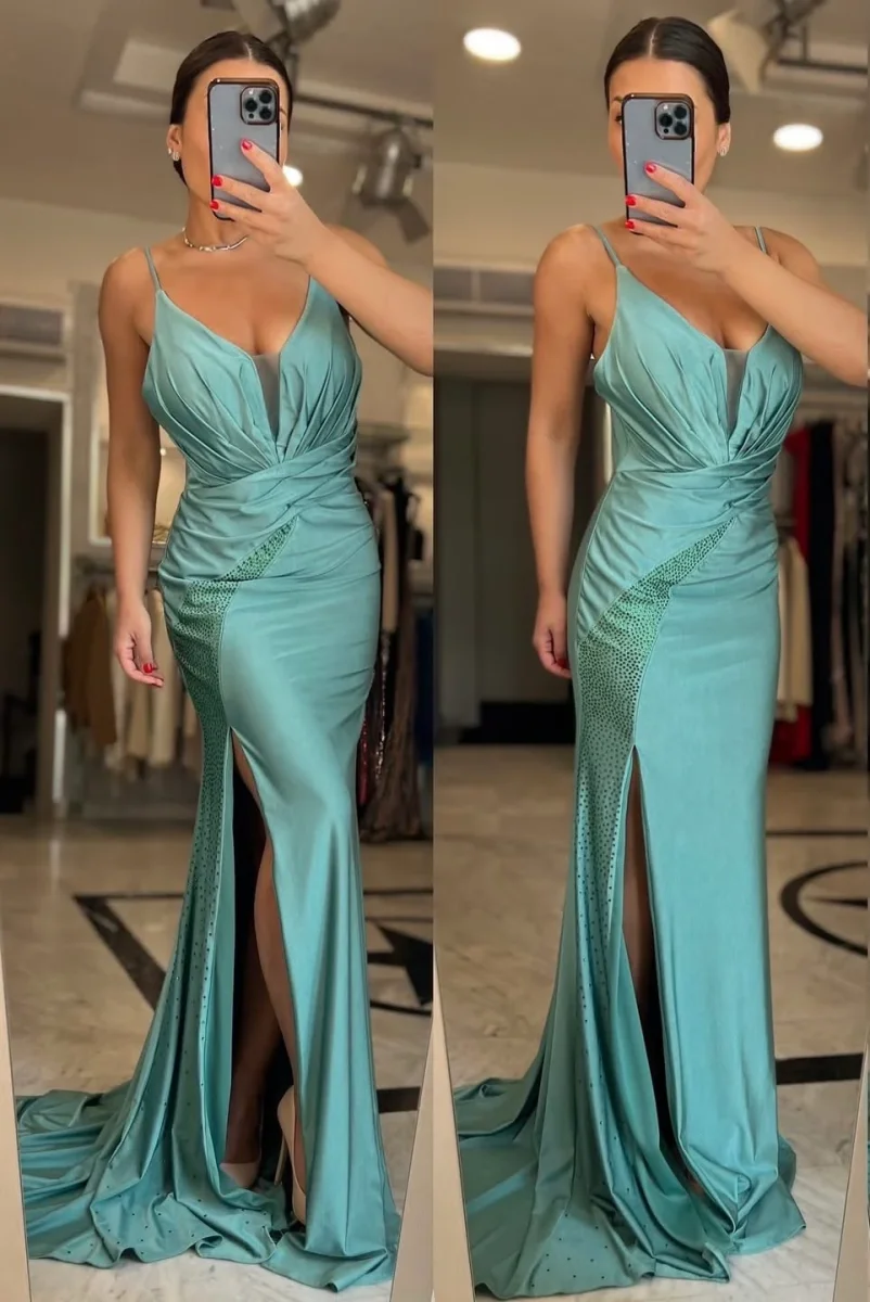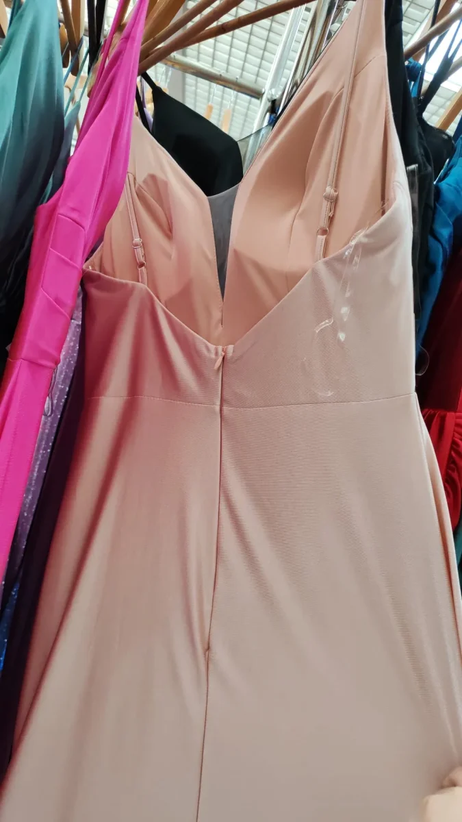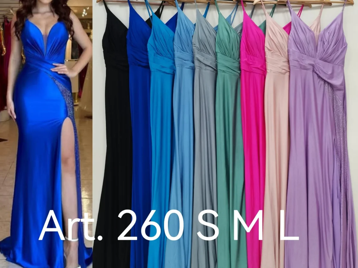 Abito lungo da cerimonia con spacco e decorazione strass. chiusura posteriore con cerniera. tessuto elasticizzato.