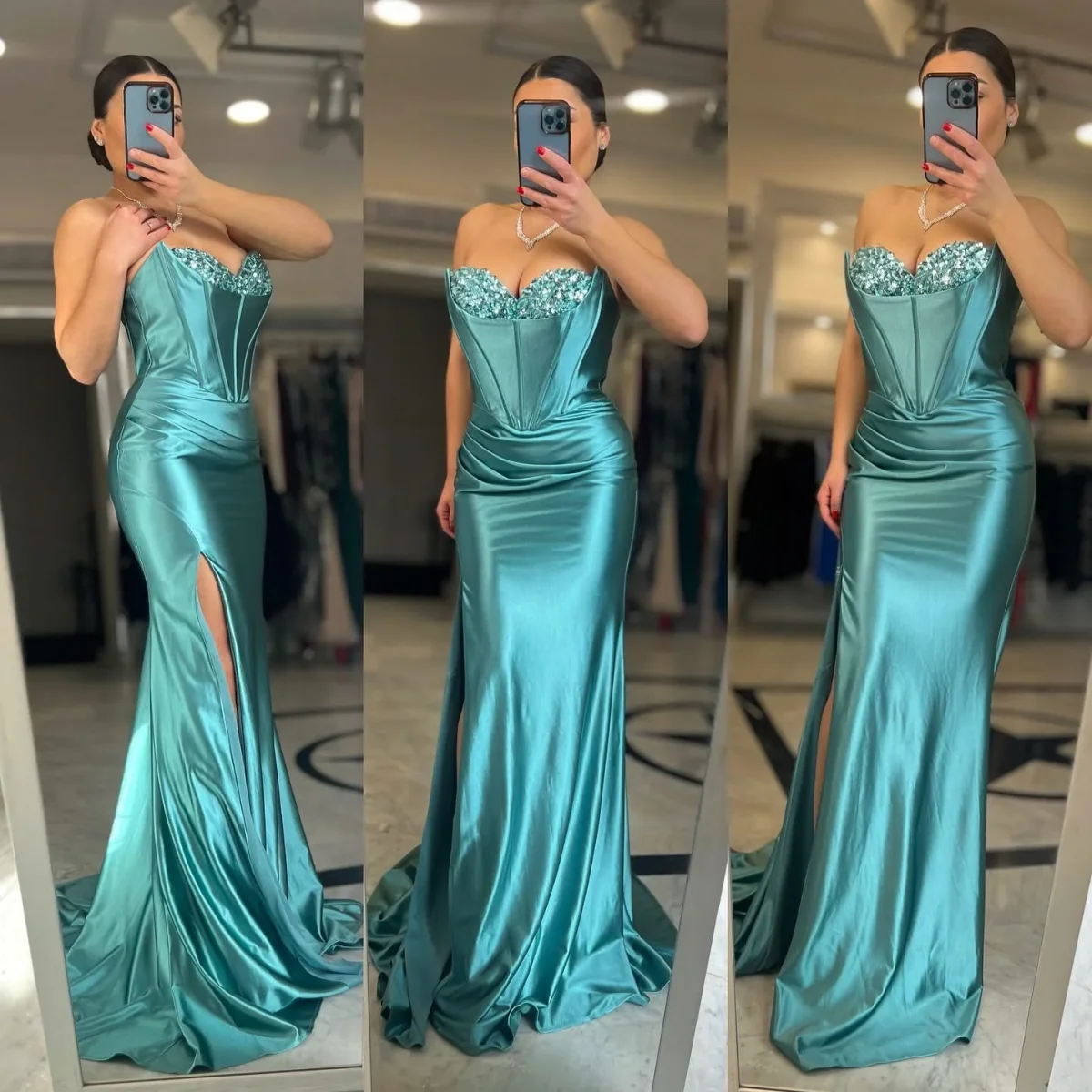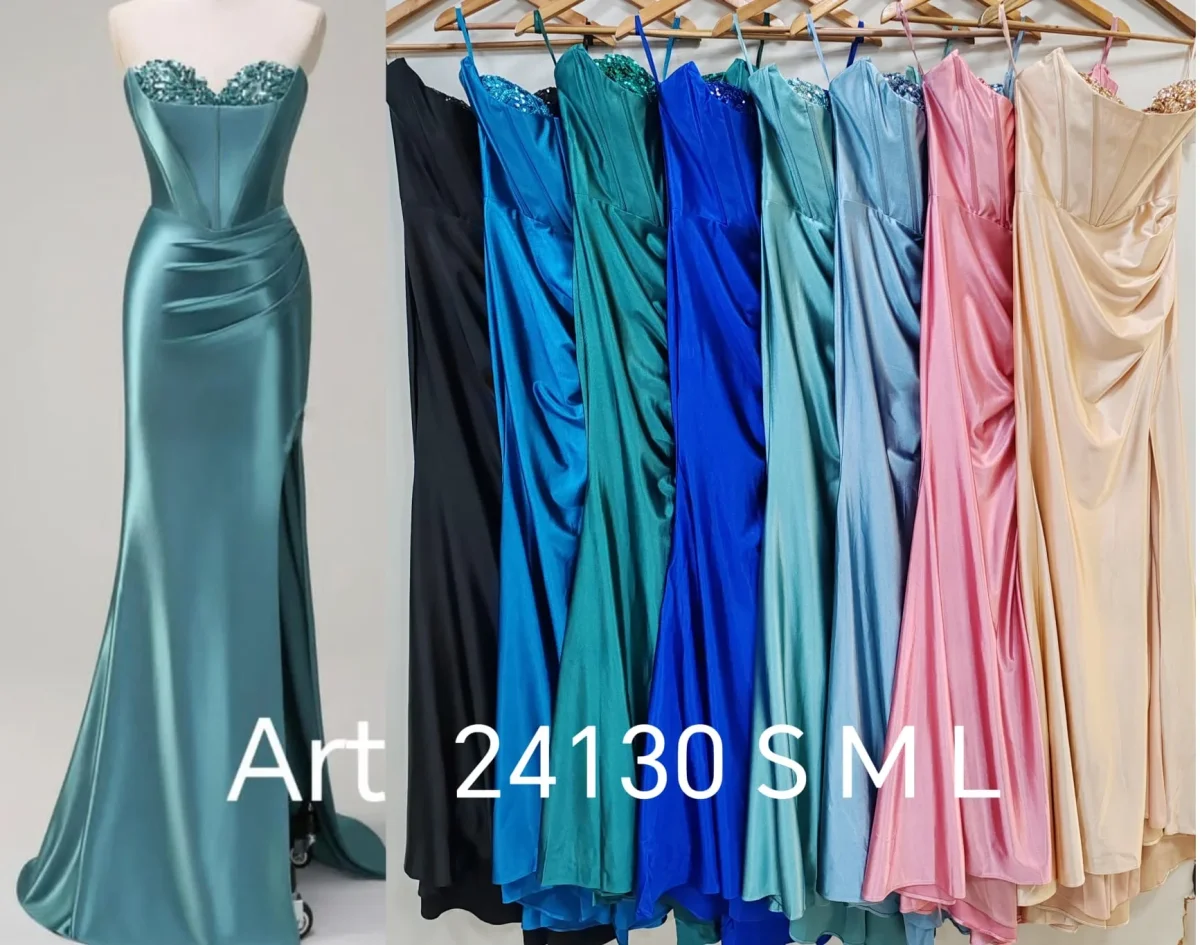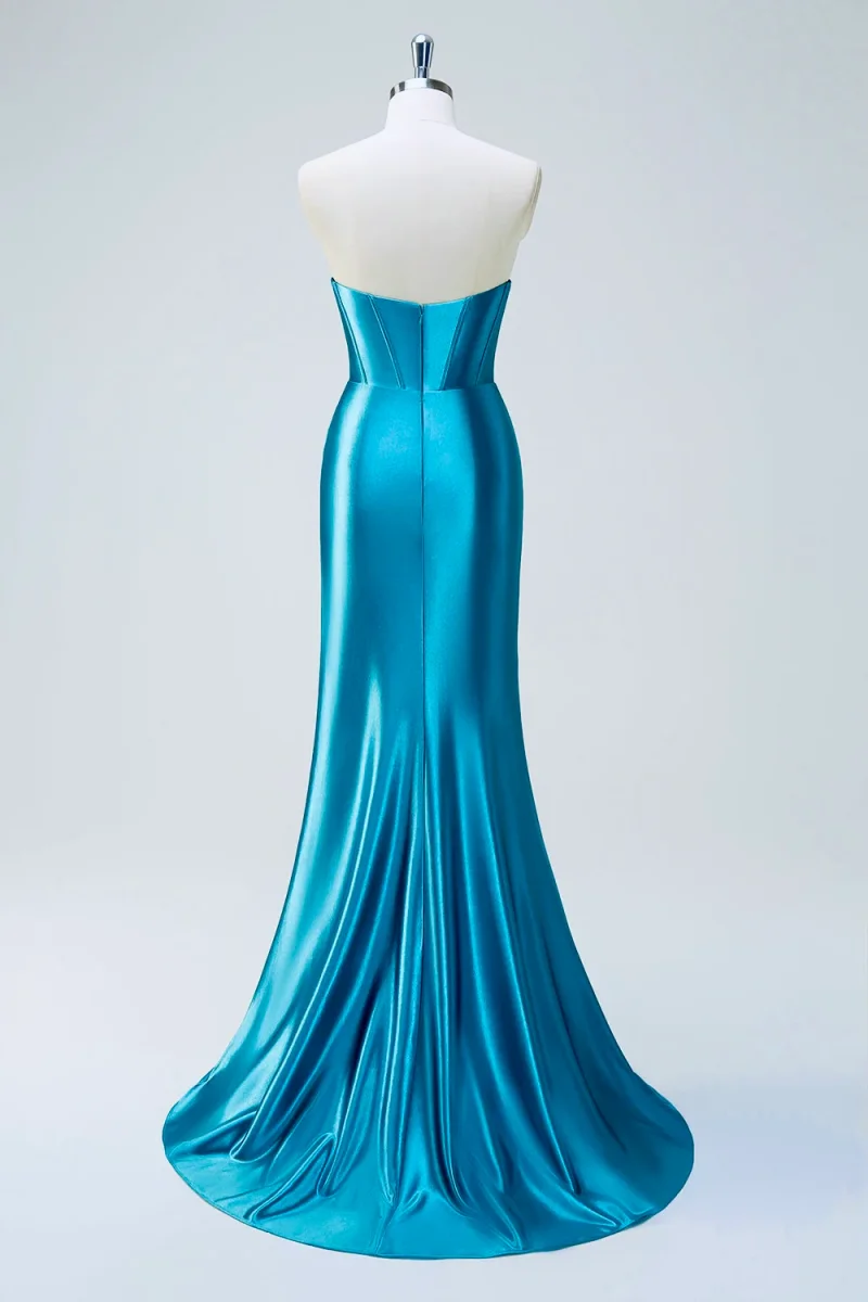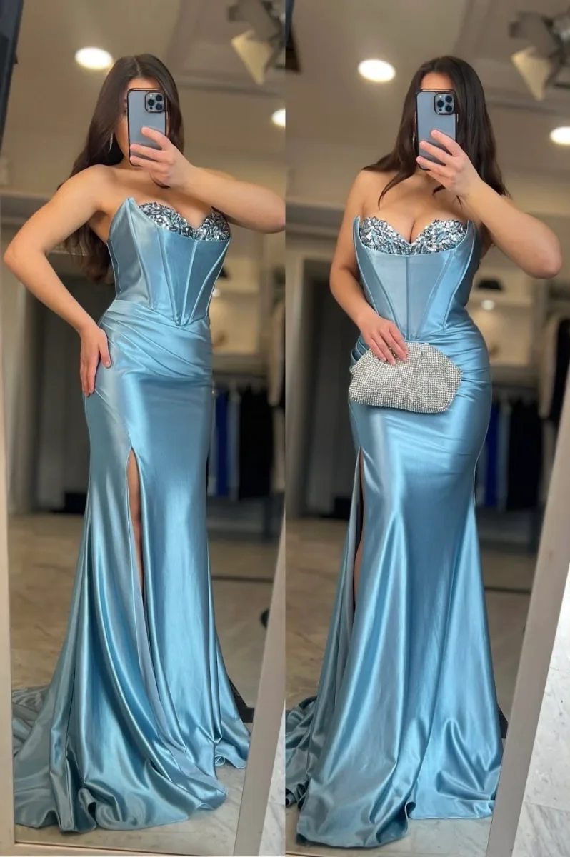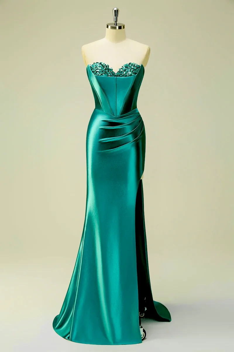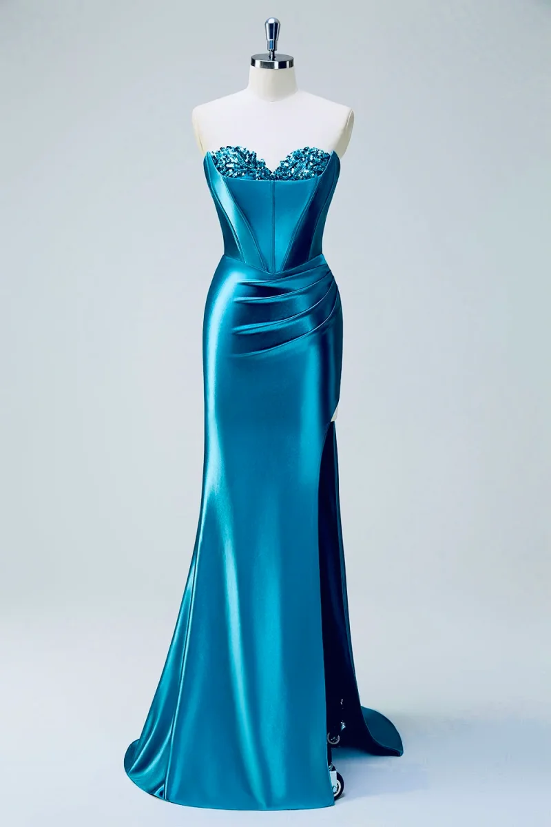 Abito da cerimonia lubgo taglio a sirena con spacco, dotato di bustino impreziosito da lavorazione in paillettes.