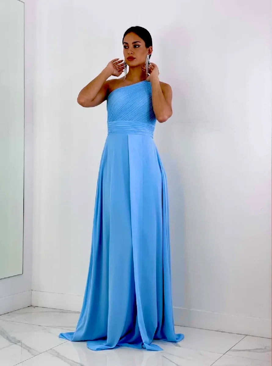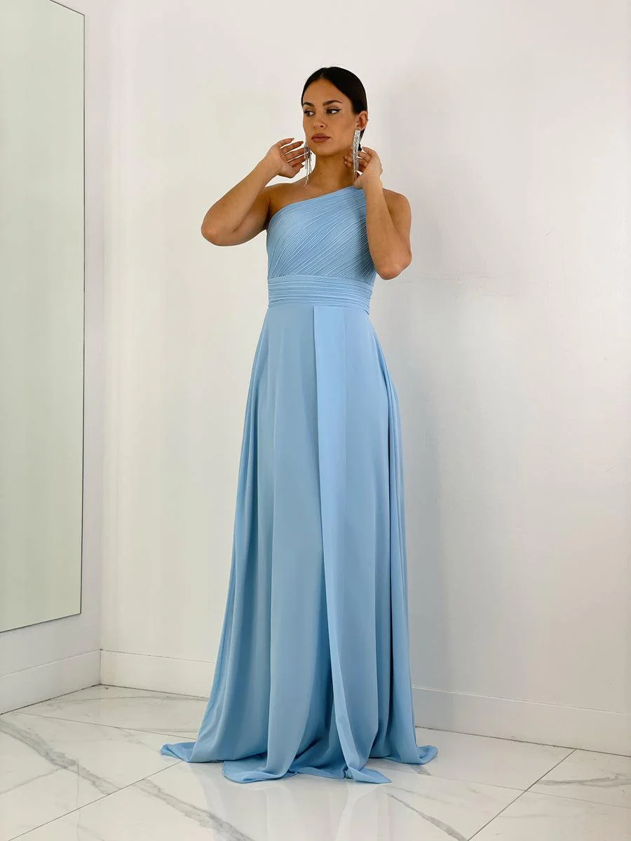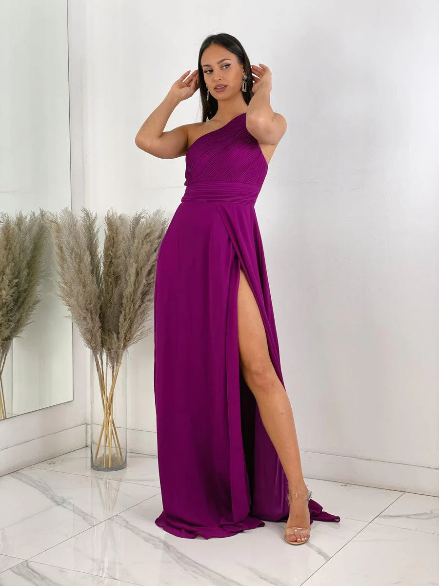 Abito lungo in chiffon corpetto monospalla plissettato con spacco