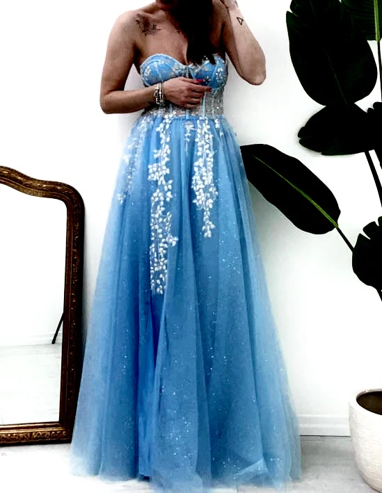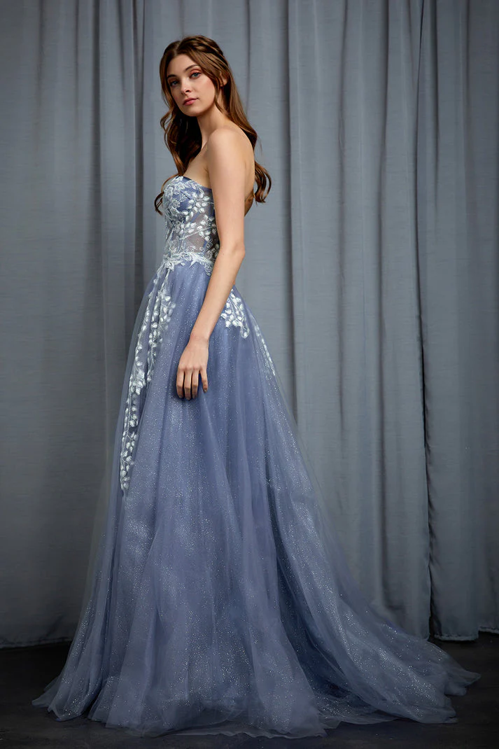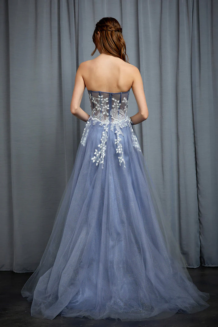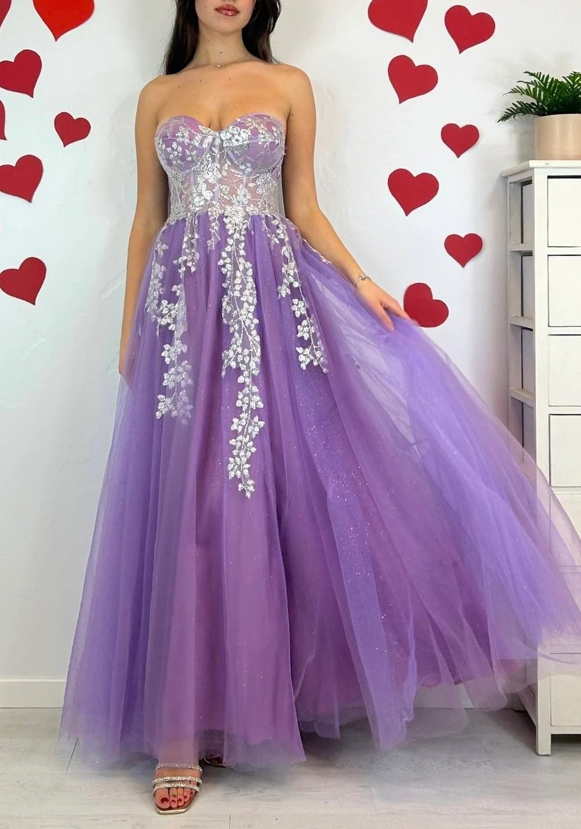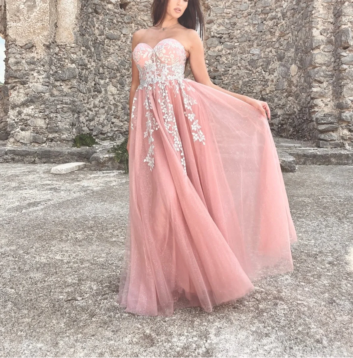 Abito da cerimonia lungo in tulle con soacco e bustino lvorato con fiorellini.