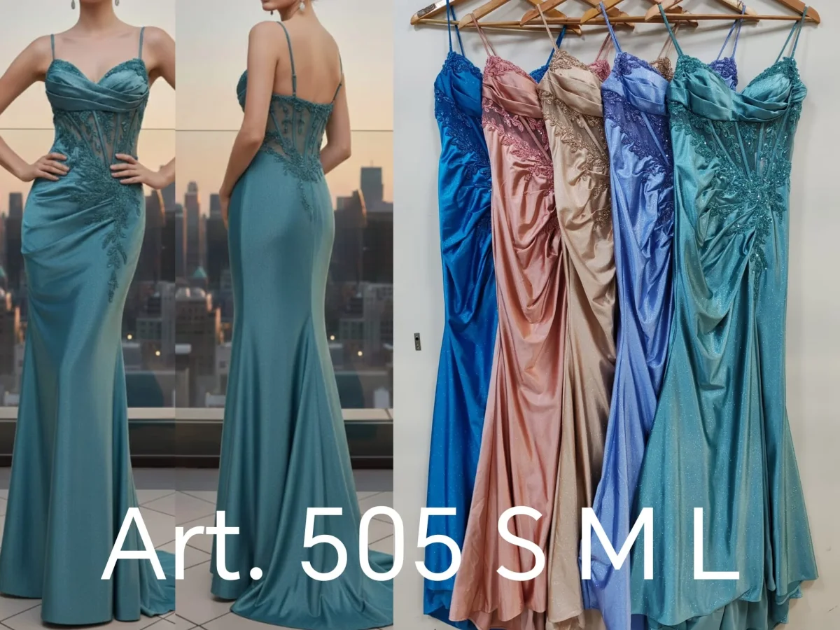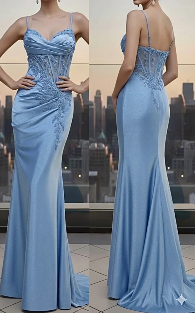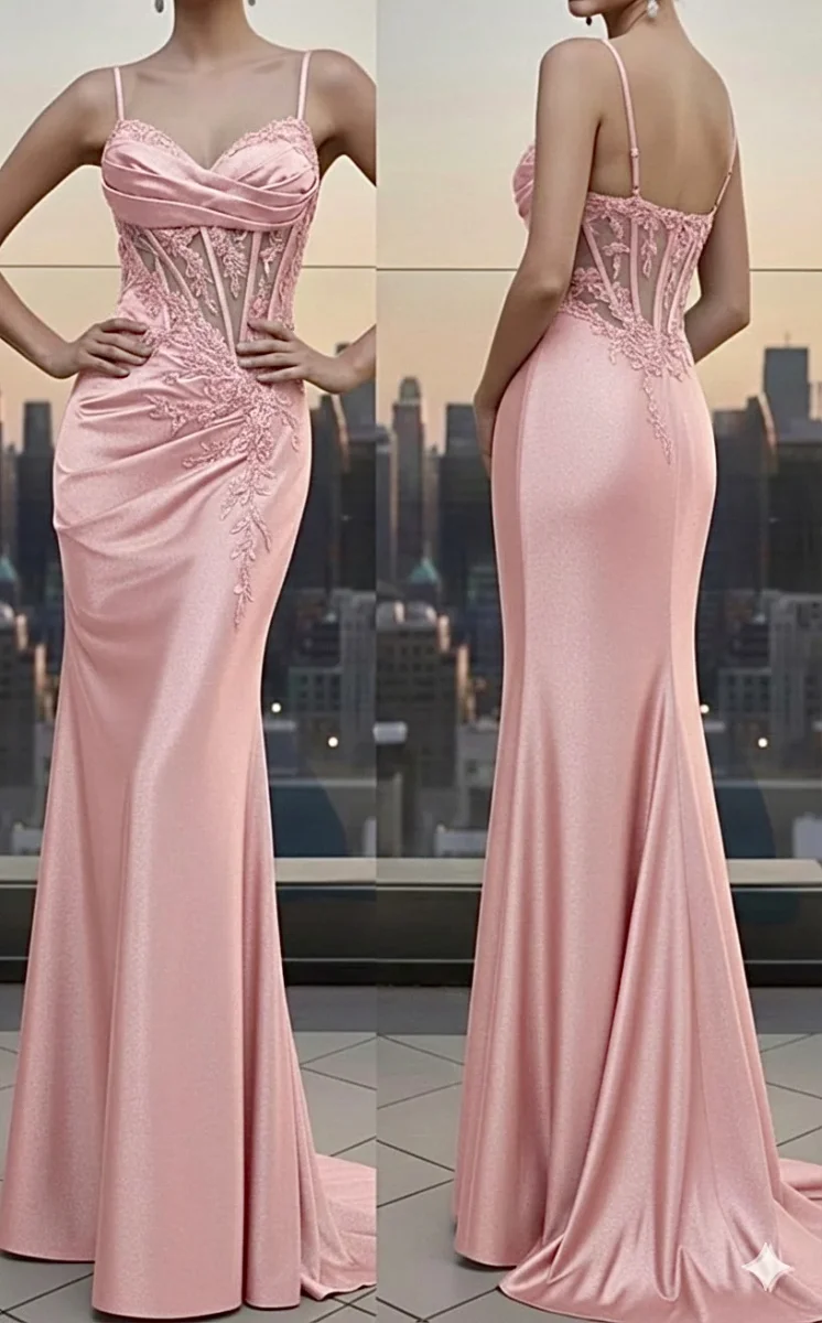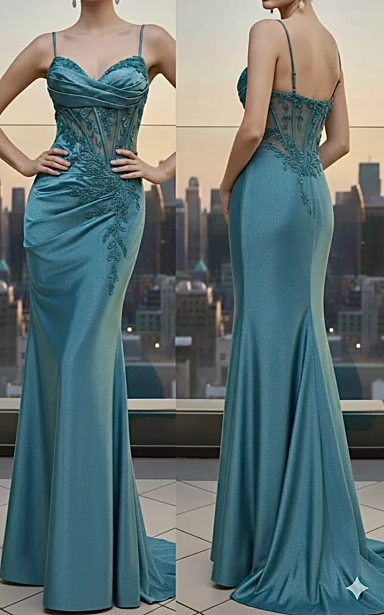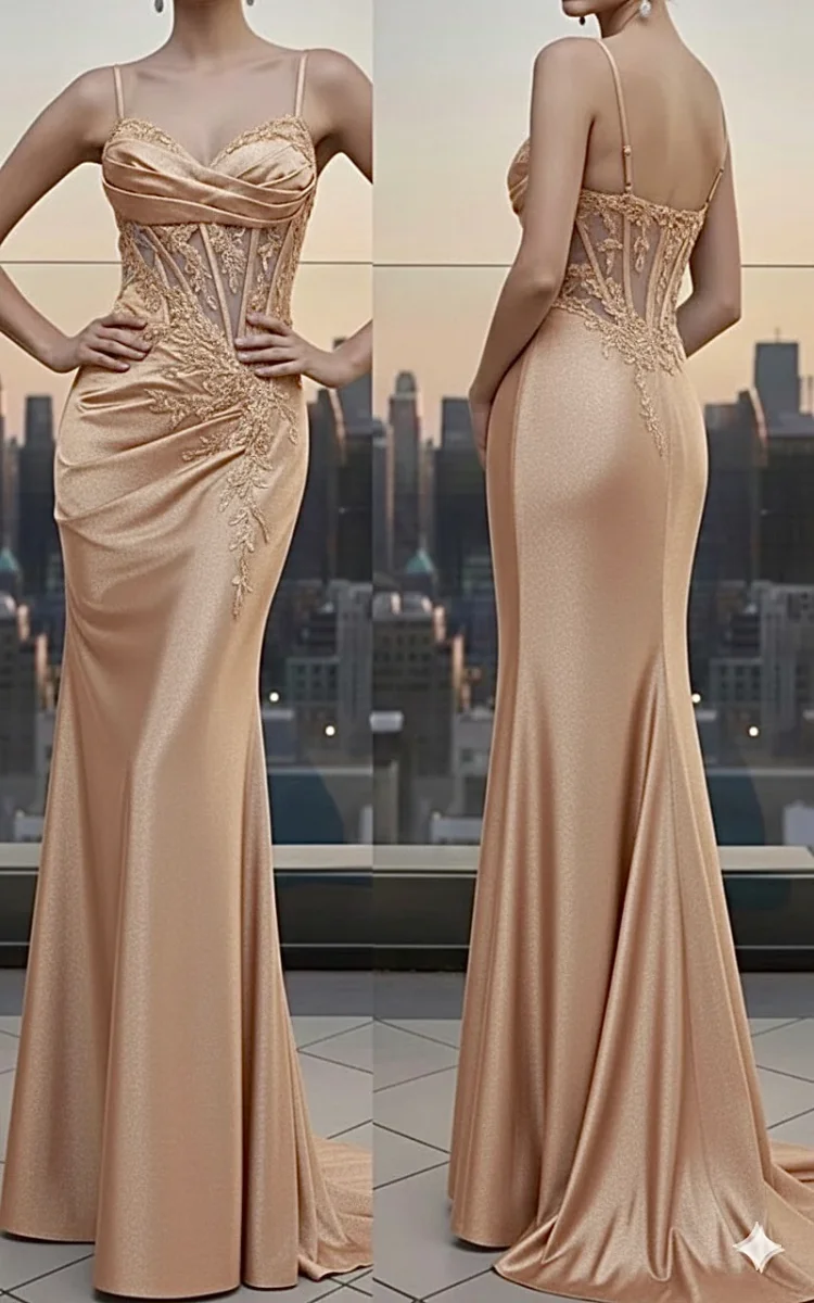 • Scollo: Presenta uno scollo a cuore con un raffinato drappeggio incrociato sul seno, sostenuto da sottili spalline a “spaghetto”.