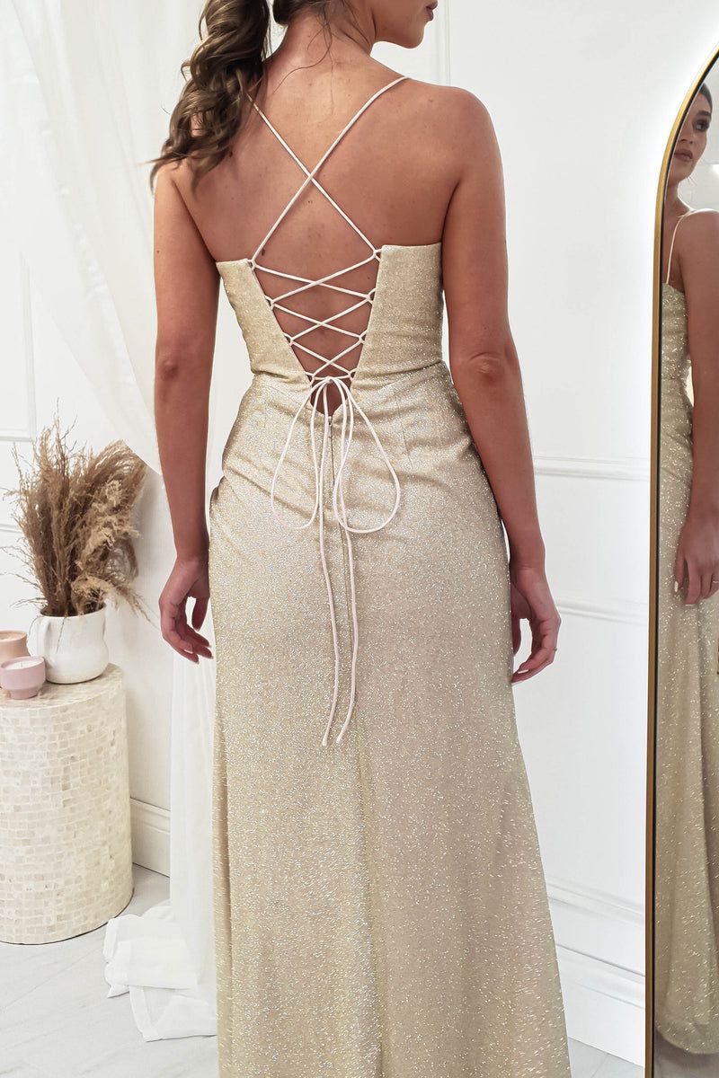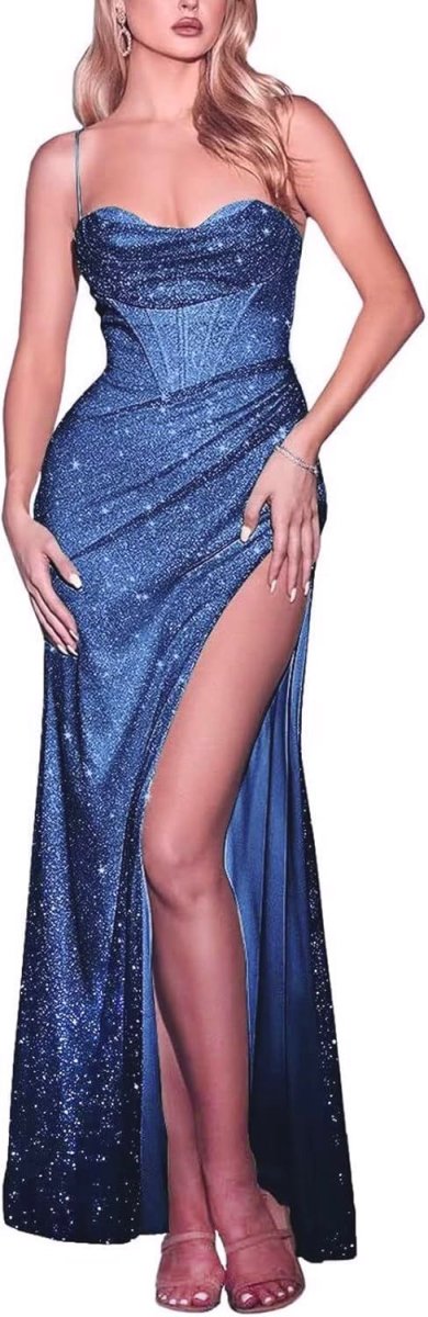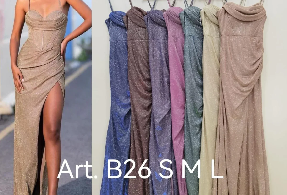 Abito lungo elegante, brillantinato dotato di corpetto con coppe preformate con scollo a cuore con drappeggio, spacco laterale con drappeggio e bretelline sottili regolabili.