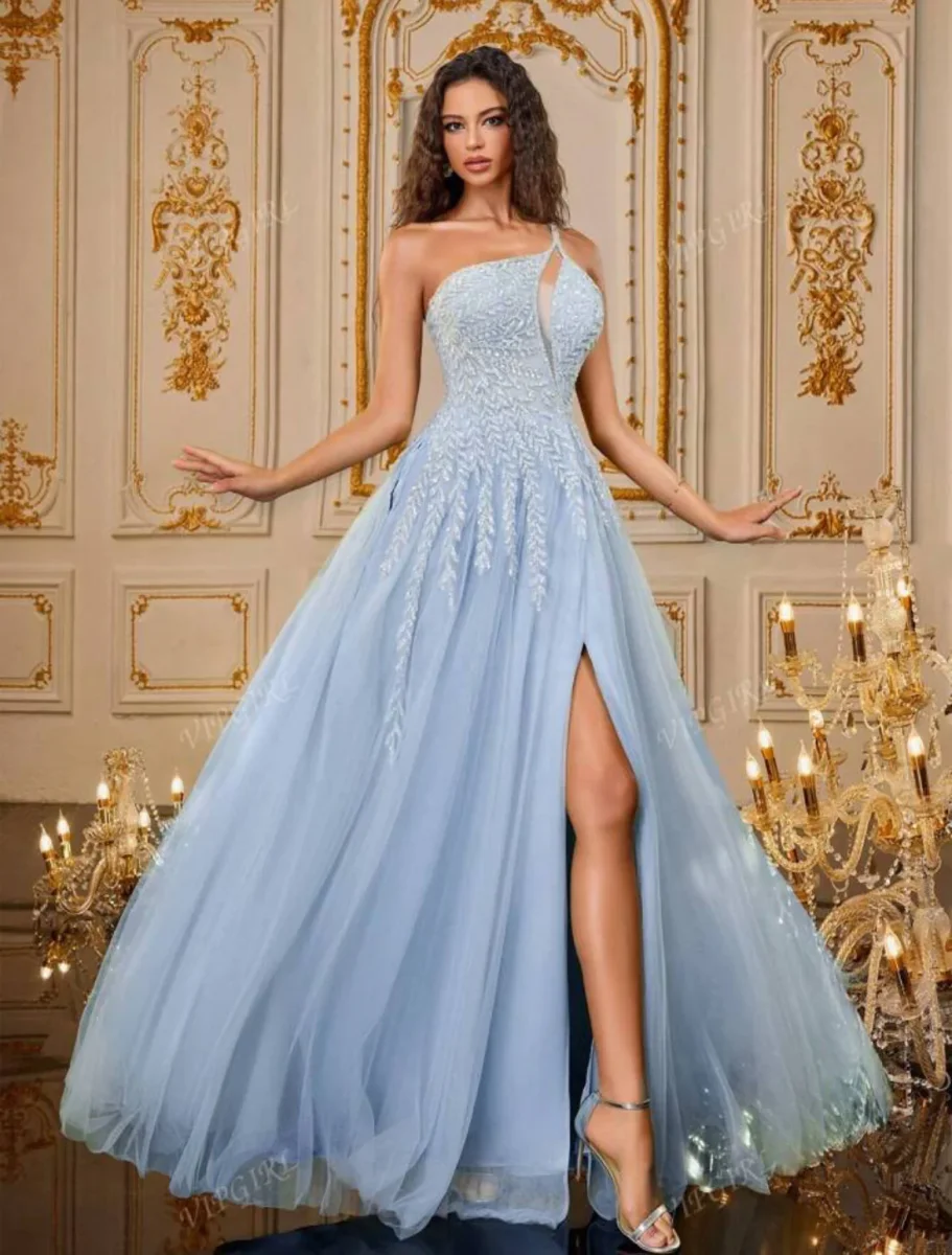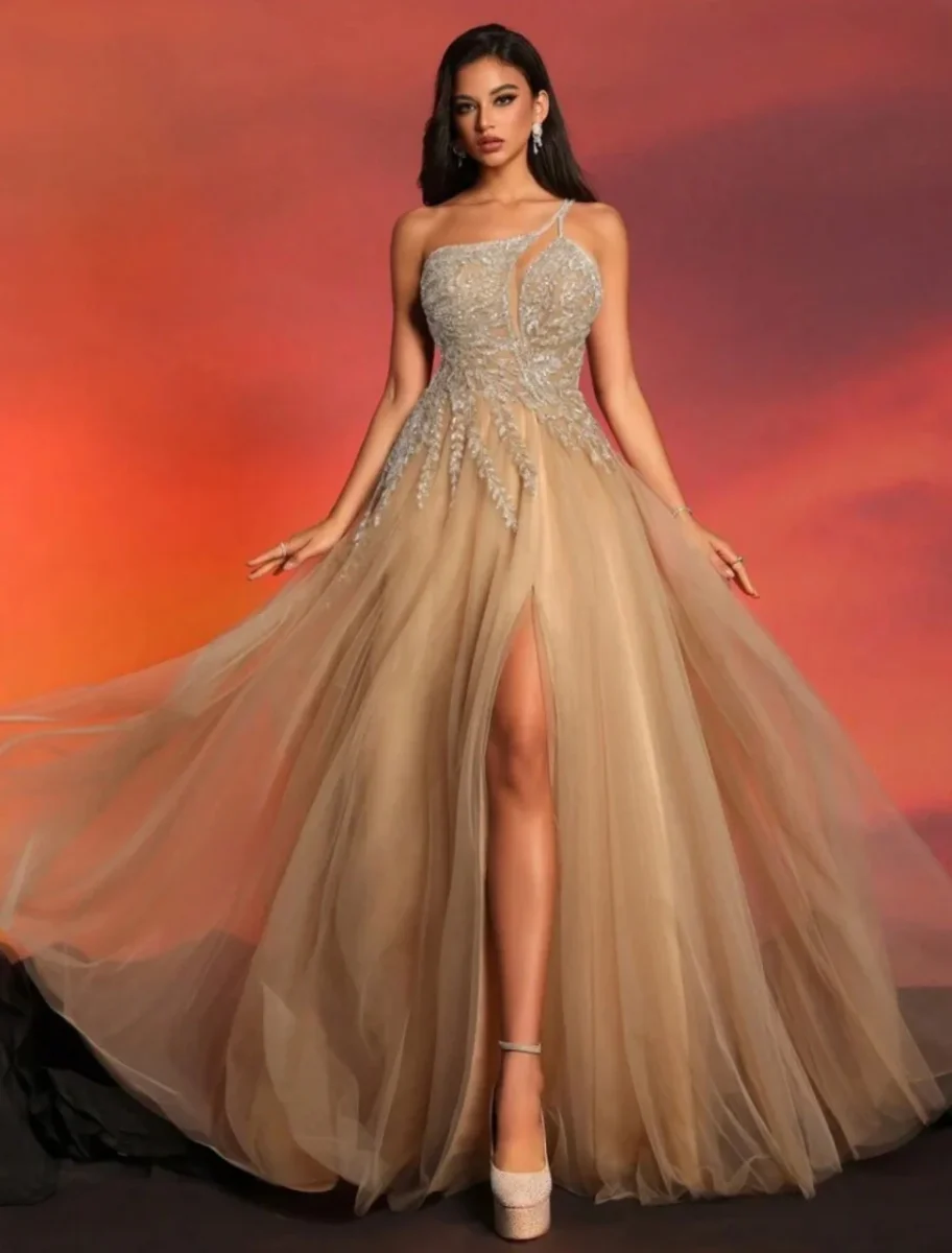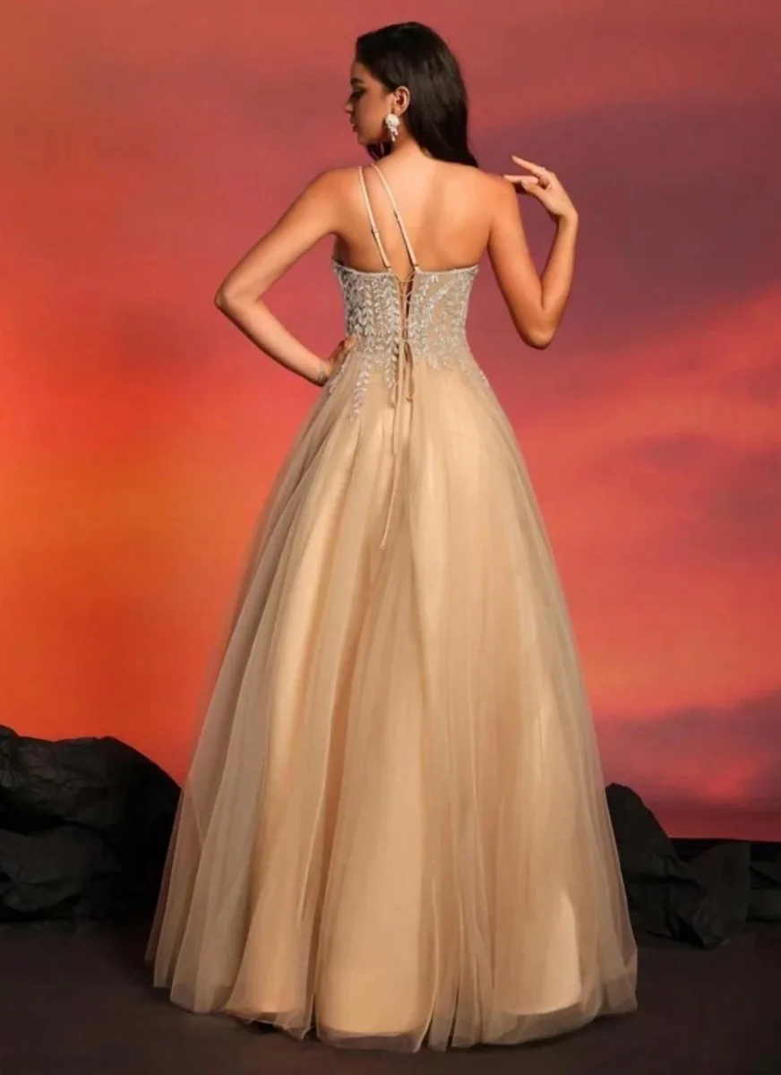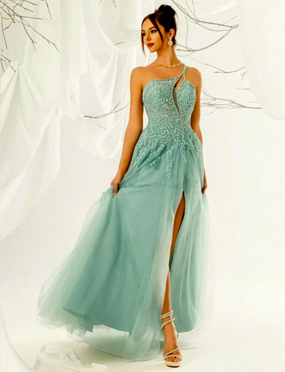 Abito cerimonia monospalla lavorato con paillettes e perline. Lungo in tulle.