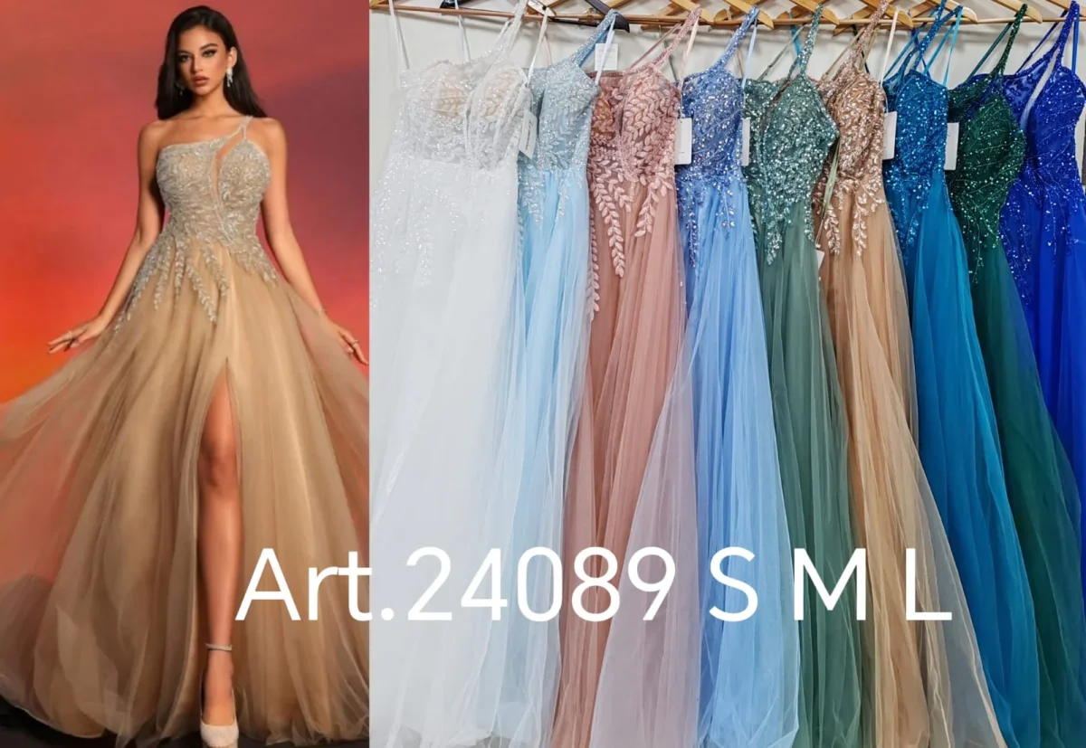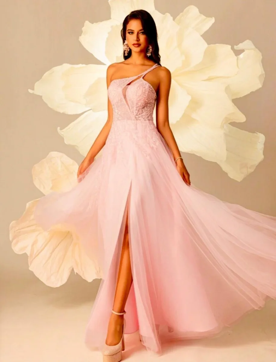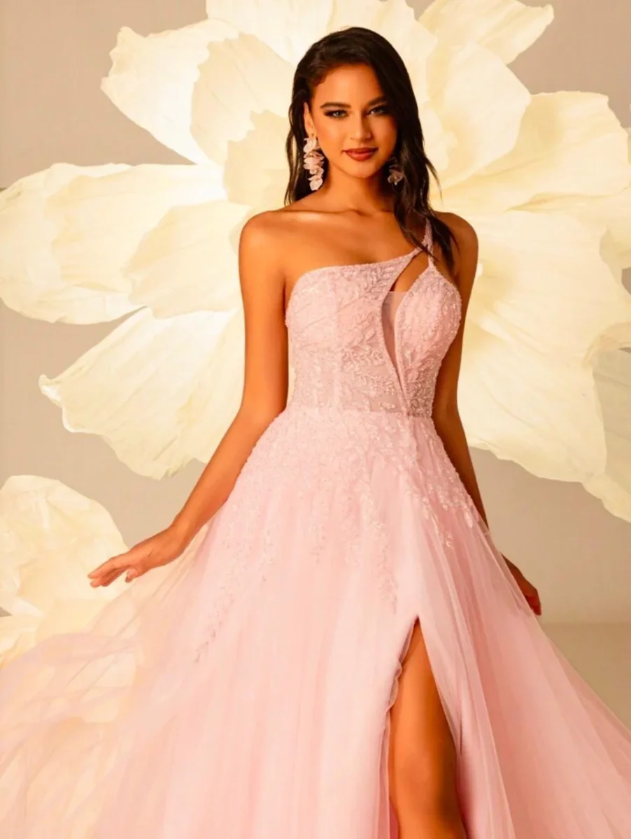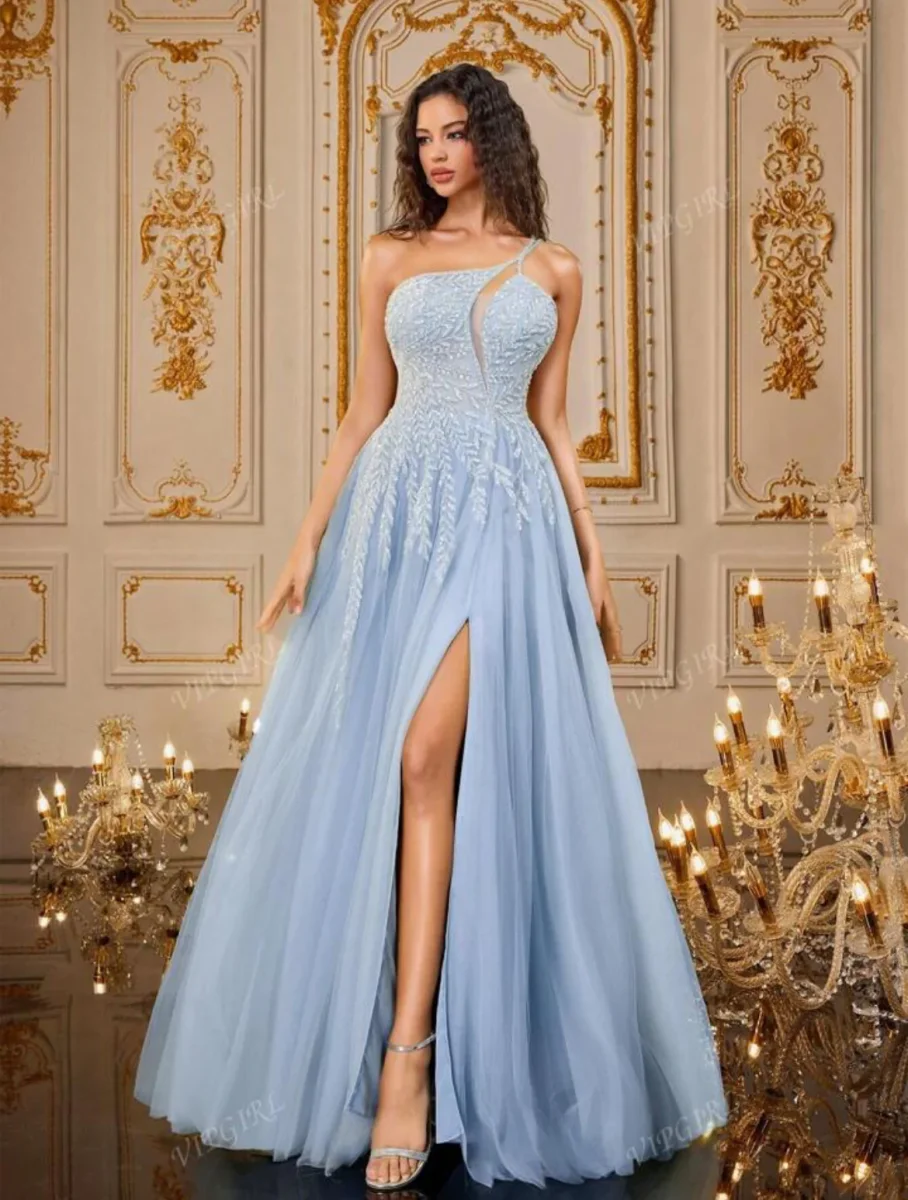 Abito cerimonia monospalla lavorato con paillettes e perline. Lungo in tulle.