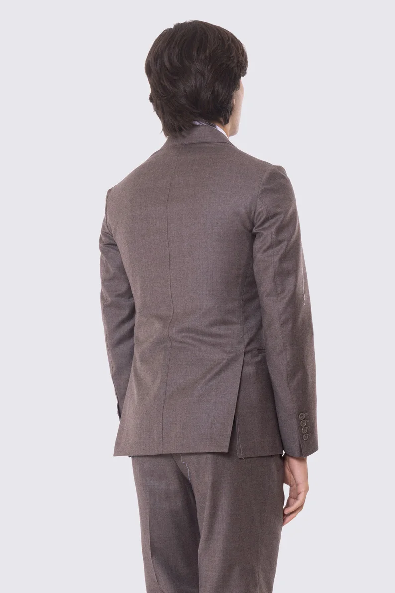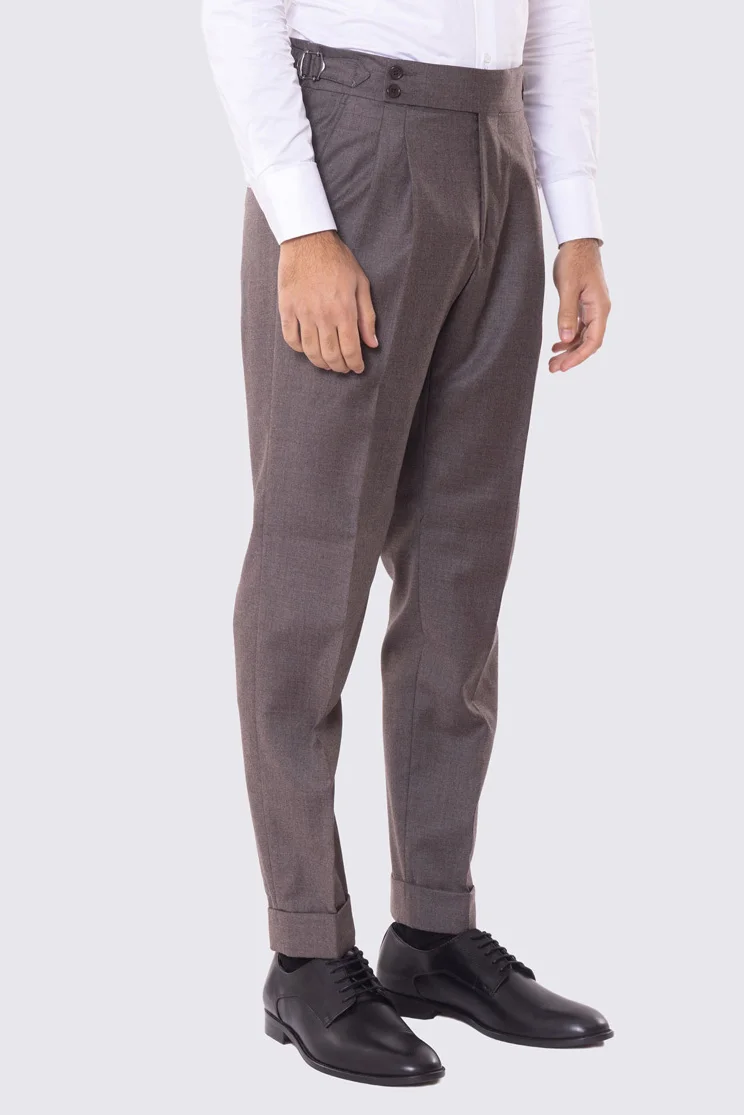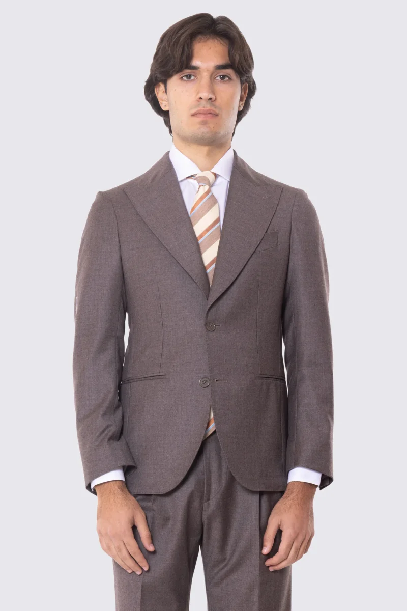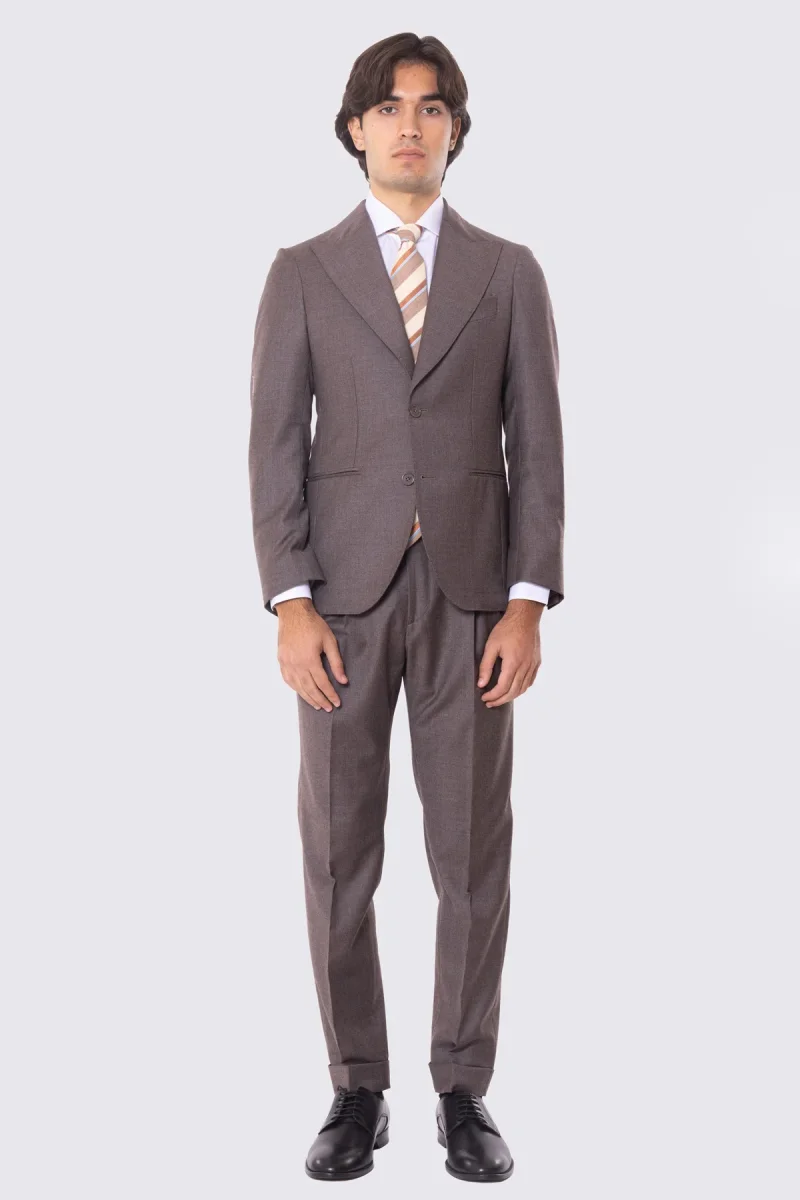 Abito marrone con giacca monopetto con rever a lancia tasche a filo e pantalone vita alta con fibbie laterali regolabili doppie pinces e risvolto 5cm 100% lana Flanella Carillo Drapers