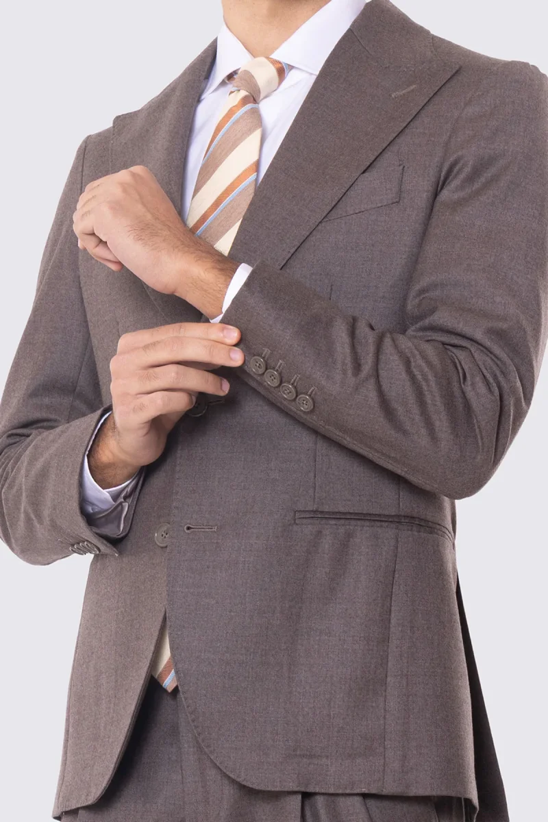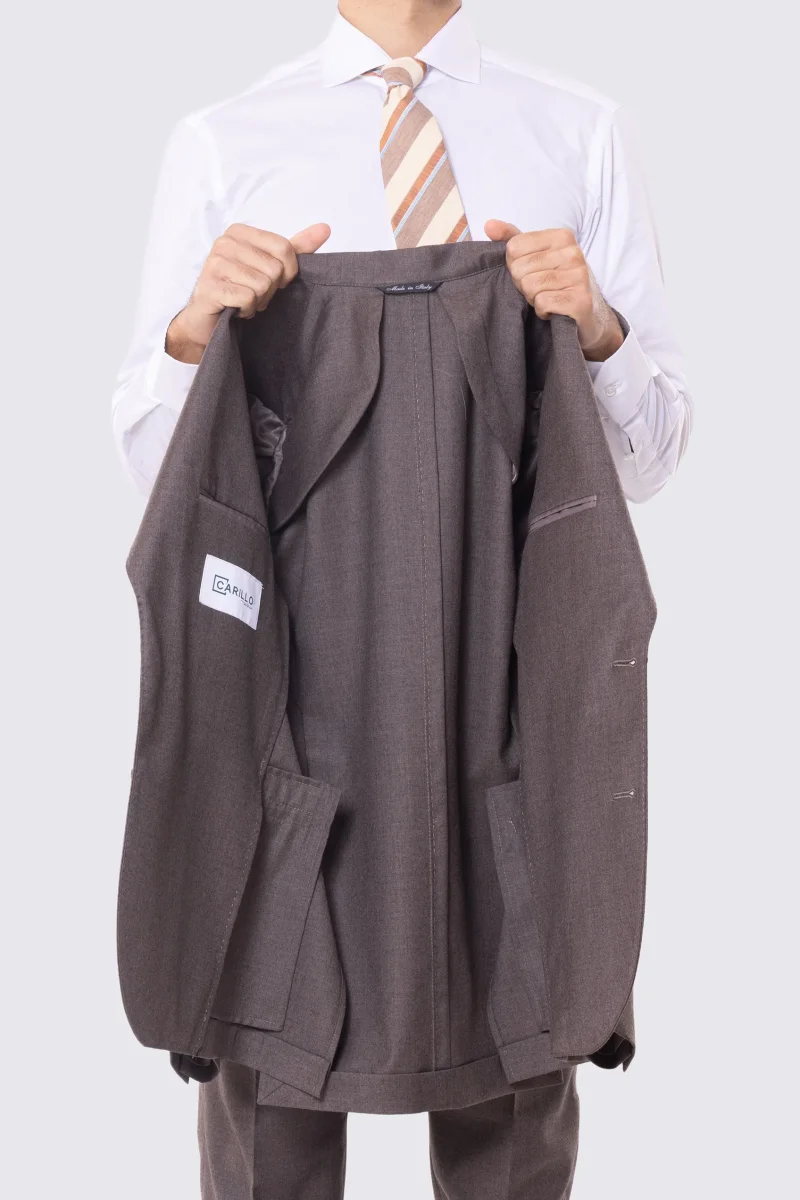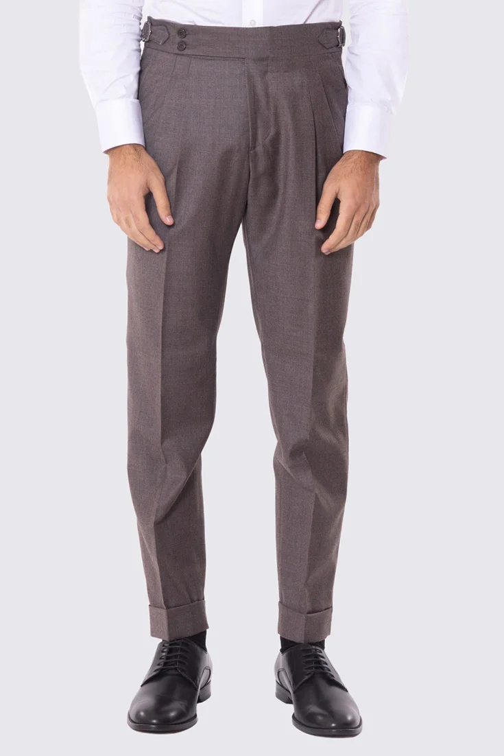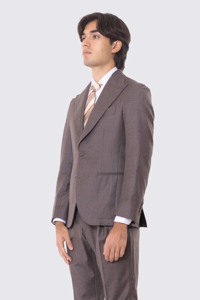 Abito marrone con giacca monopetto con rever a lancia tasche a filo e pantalone vita alta con fibbie laterali regolabili doppie pinces e risvolto 5cm 100% lana Flanella Carillo Drapers