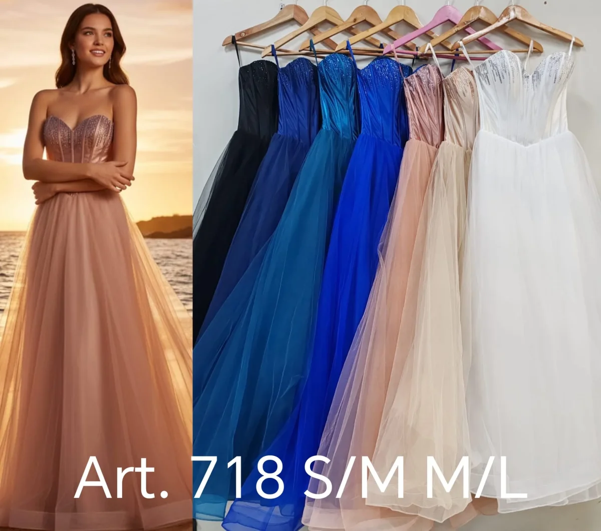 • Il Corpetto: Presenta uno scollo a cuore senza spalline con una struttura a corsetto. Le stecche a vista creano un effetto bustier che valorizza la silhouette, mentre la parte superiore è impreziosita da punti luce che sfumano verso il punto vita.