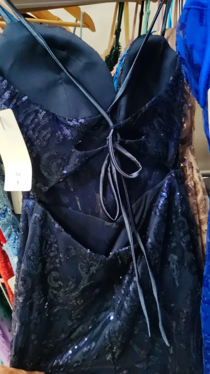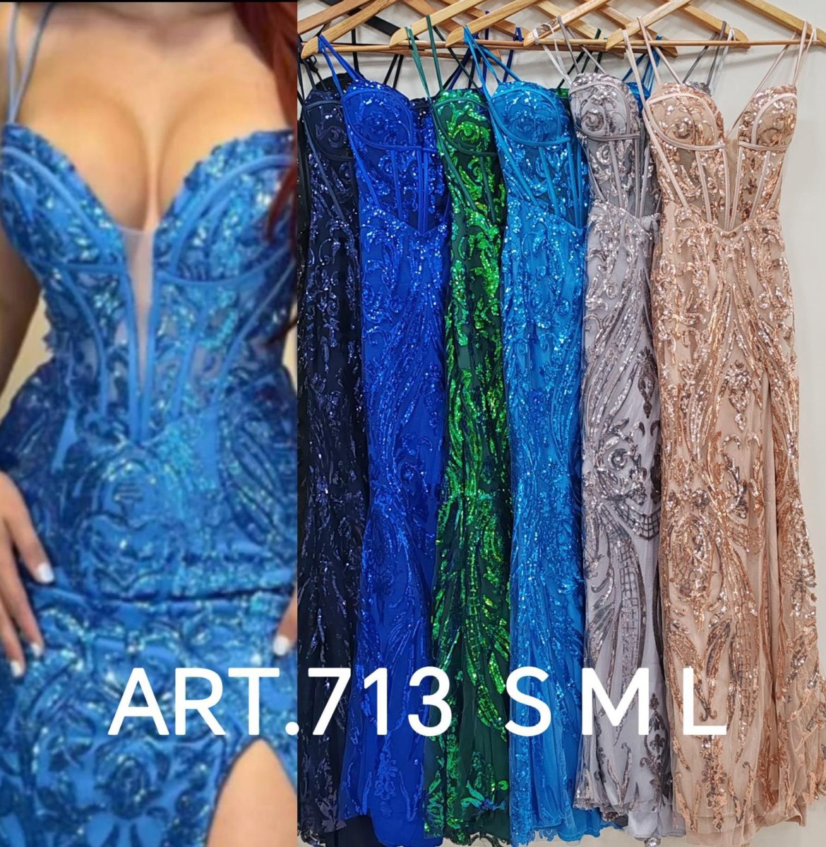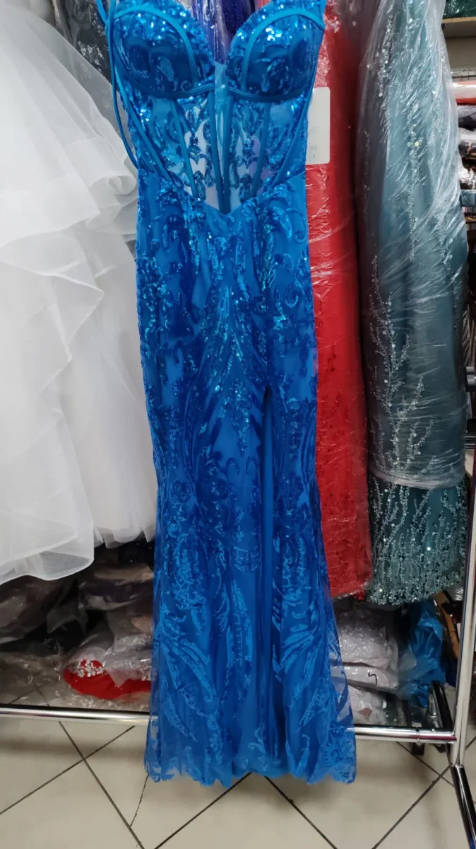 Abito lungo da cerimonia taglio a sirena con spacco. Lavorato con pailliettes. Bustino che sul retro si regola con laccetti.