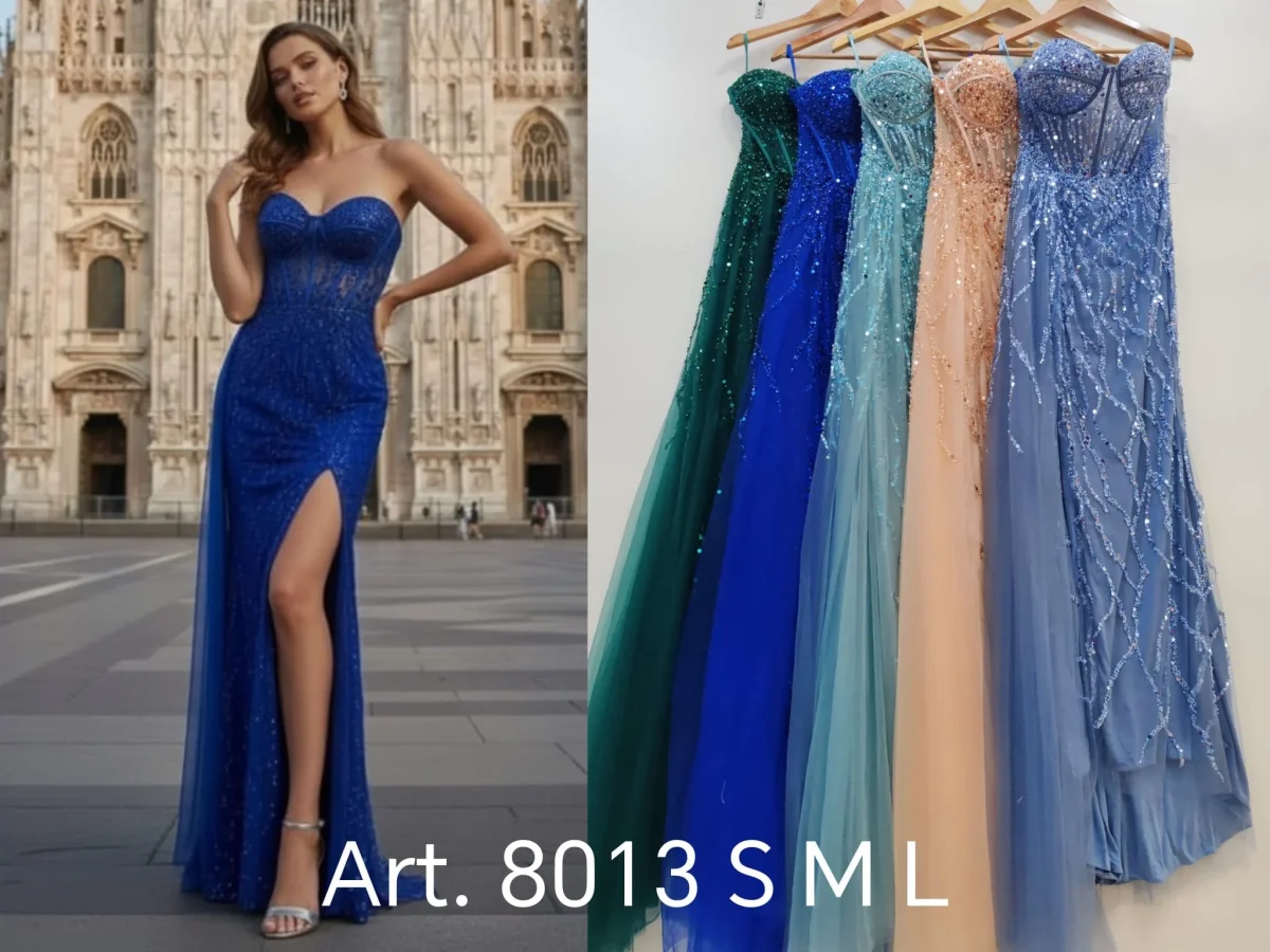 • Tessuto scintillante: L’intero abito è impreziosito da glitter, paillettes o piccoli cristalli che riflettono la luce, creando un effetto “polvere di stelle”.