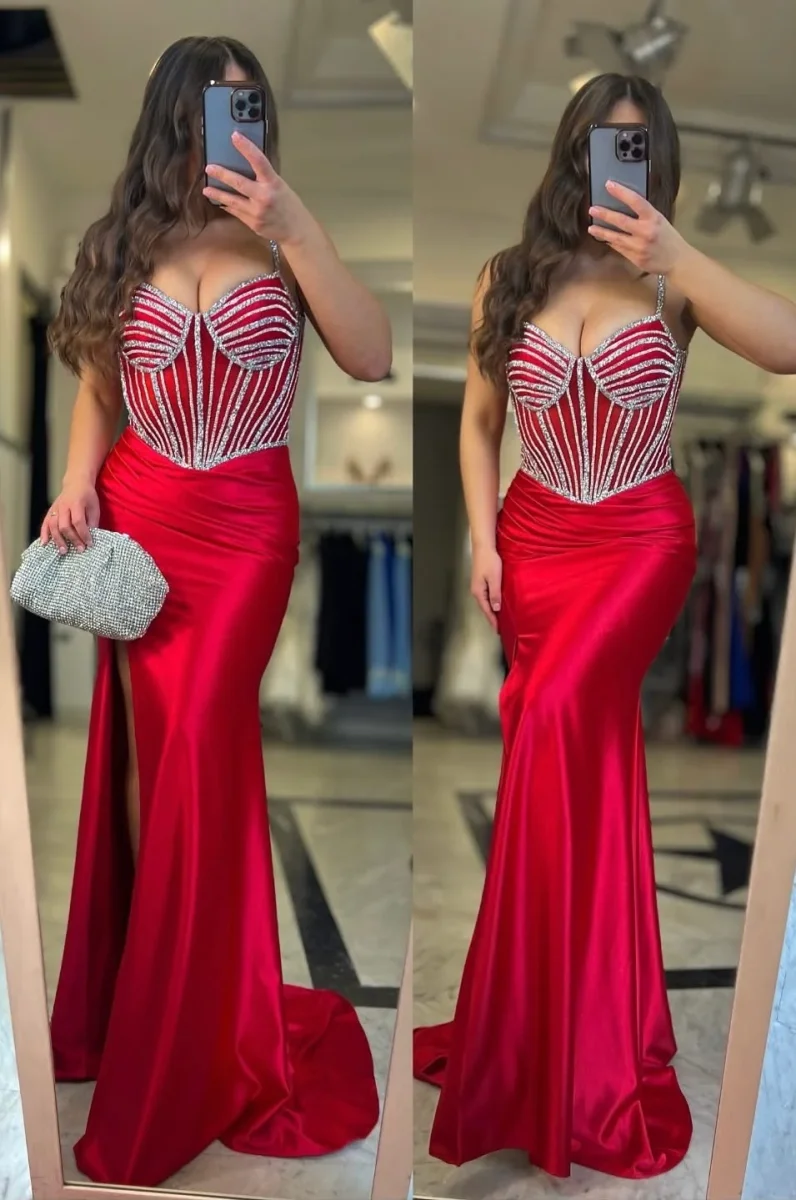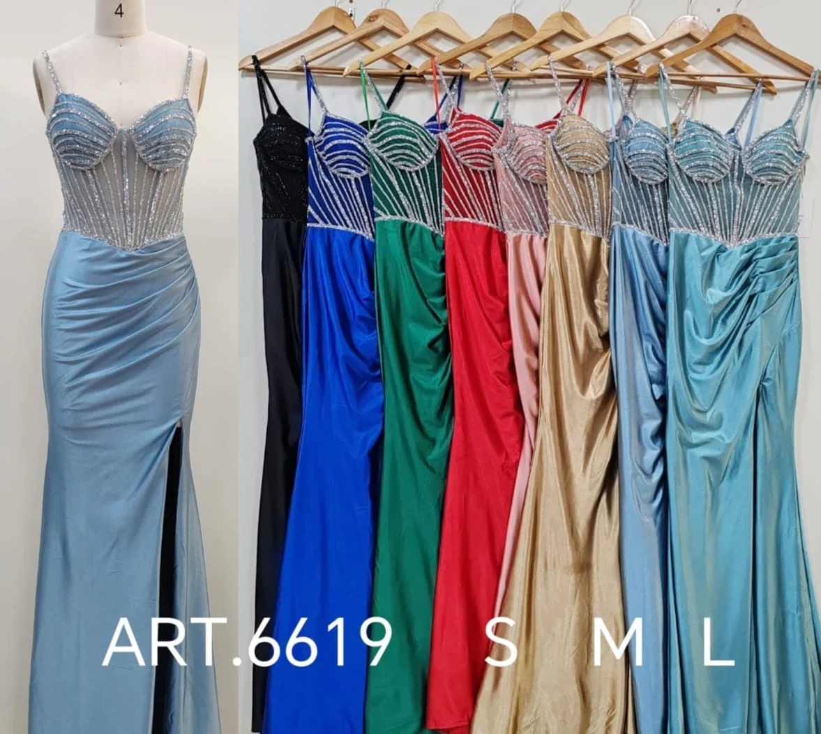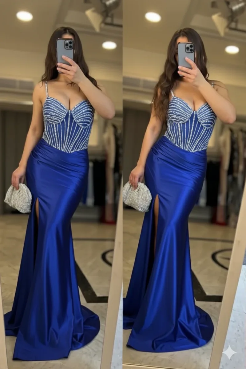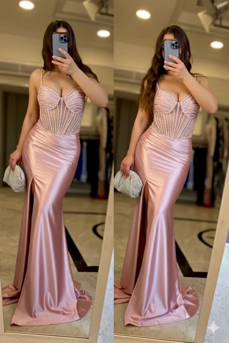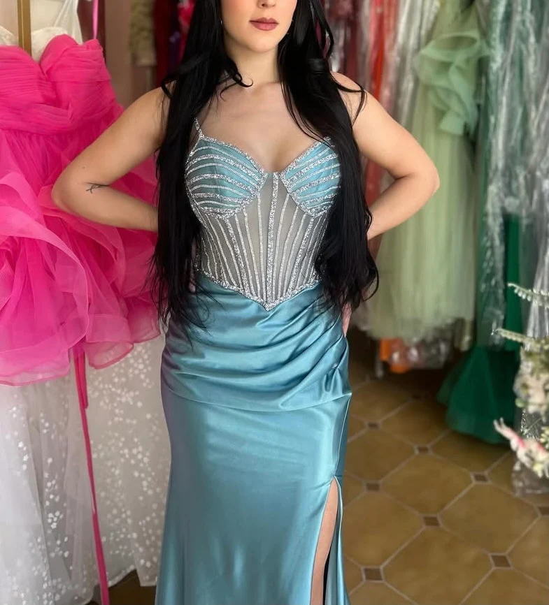 Abito da cerimonia con bustino impreziosito da strass. drappeggiato, con spacco laterale.