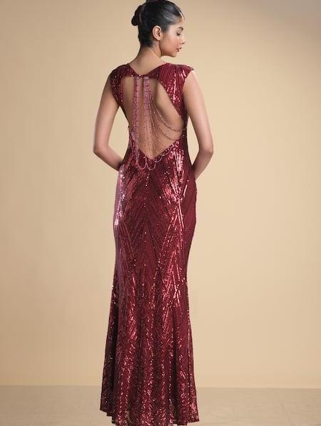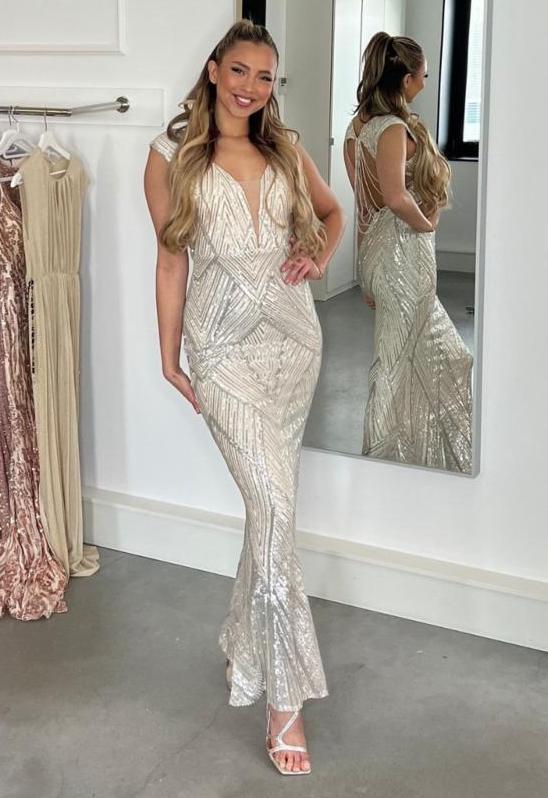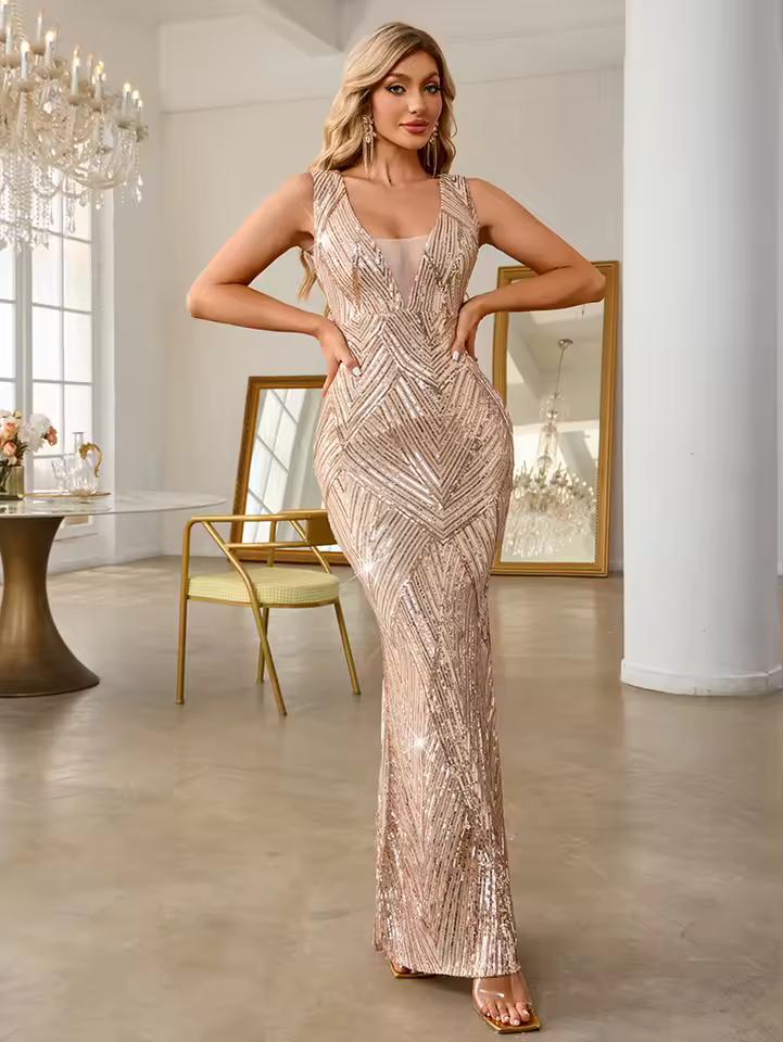Abito lungo da cerimonia taglio a sirena, lavorato con pailliettes con apertura sulla schiena e catenelle di strass