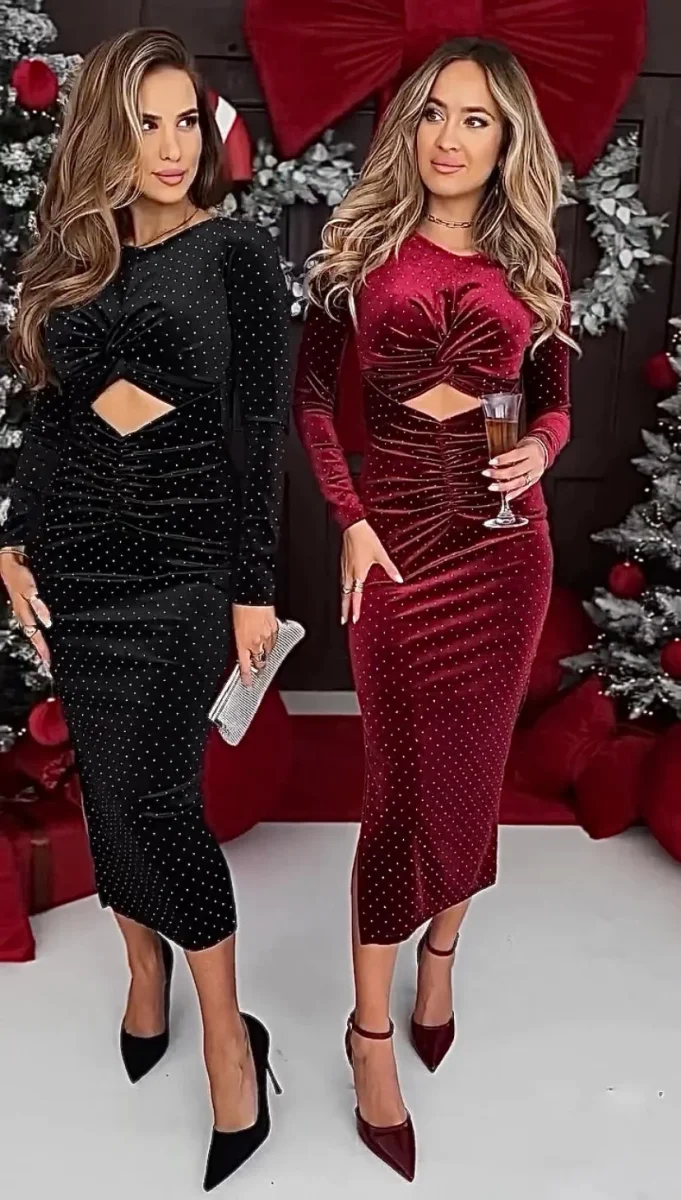 Abito elegante in velluto impreziosito da mini strass, drappeggio e piccola apertura. Perfetto per occasioni speciali!