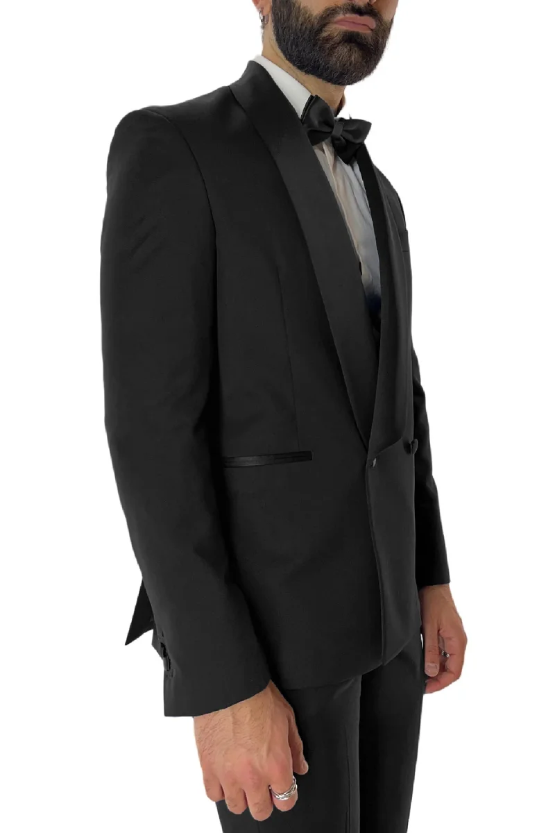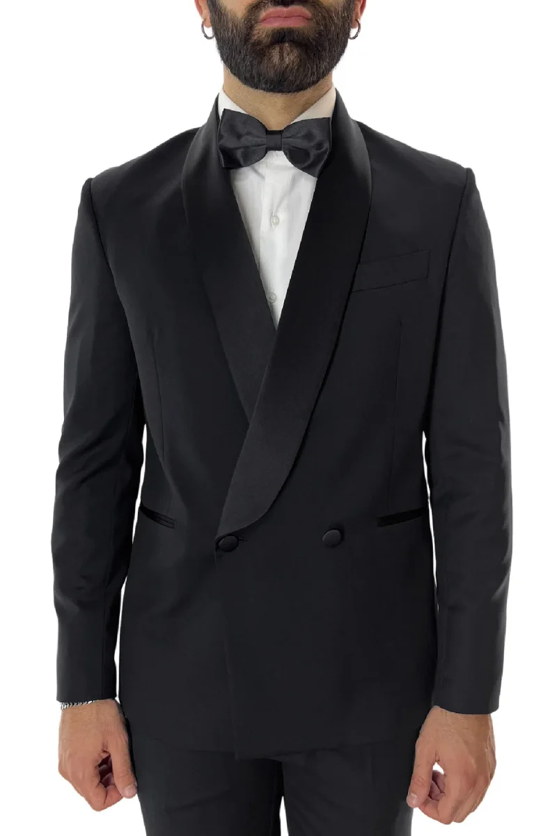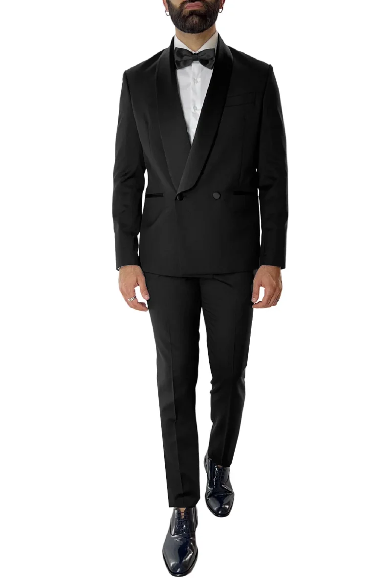 La Giacca smoking da uomo Doppiopetto nera rever a scielle nero in fresco lana 100% Vitale Barberis Canonico della linea di SARTORIA CARILLO e ormai per i nostri clienti sinonimo di garanzia e qualita. Questo modello, viene scelto da una tipologia di persone che amano vestire bene e nello stesso tempo scelgono la comodita. Infatti grazie alle caratteristiche del tessuto morbido permette a chi la indossa di scegliere la sua misura perfetta e non preoccuparsi delle limitazioni dei movimenti nonostante la sua vestibilita slim.