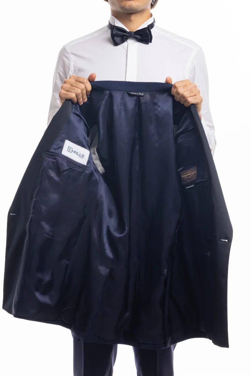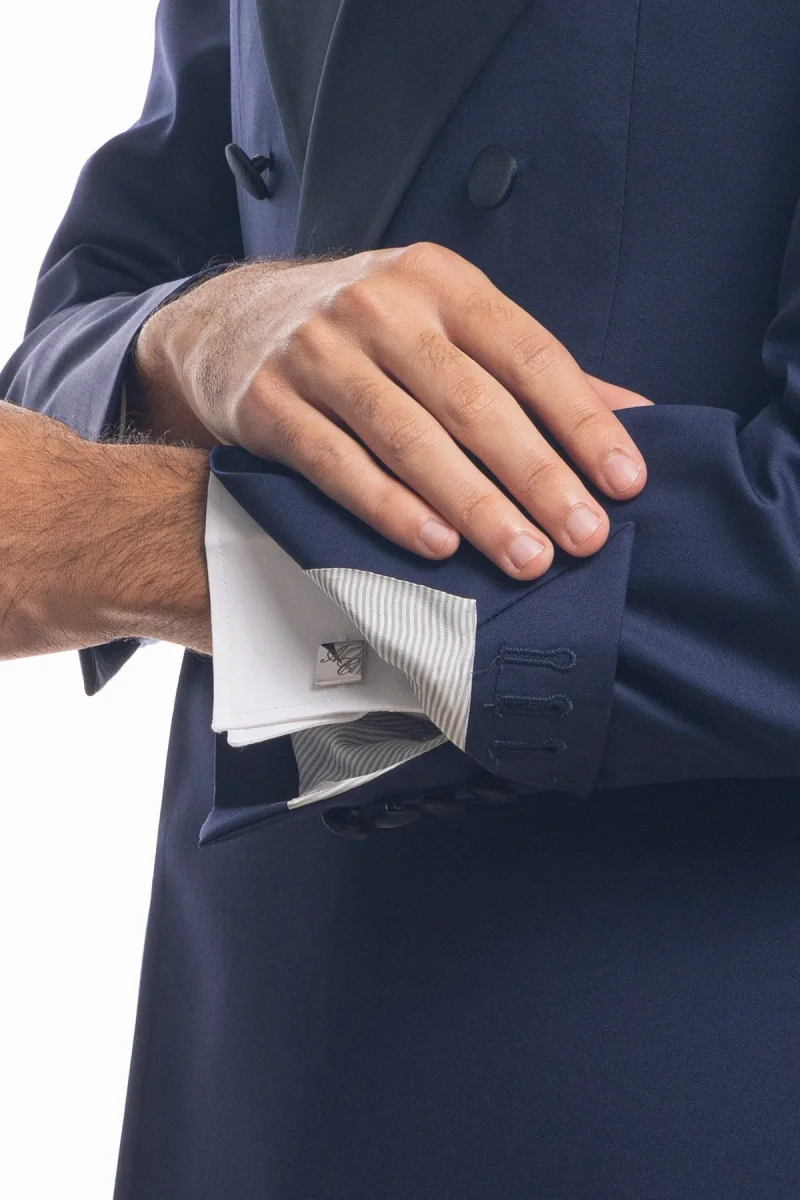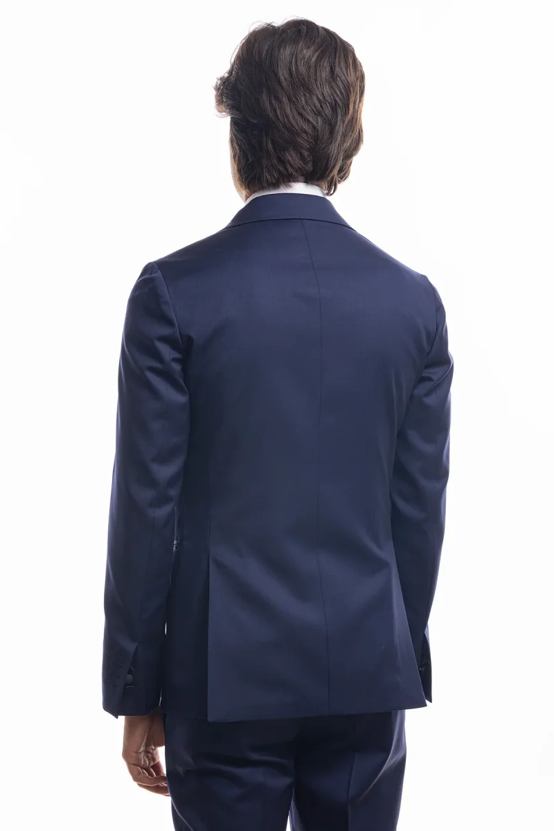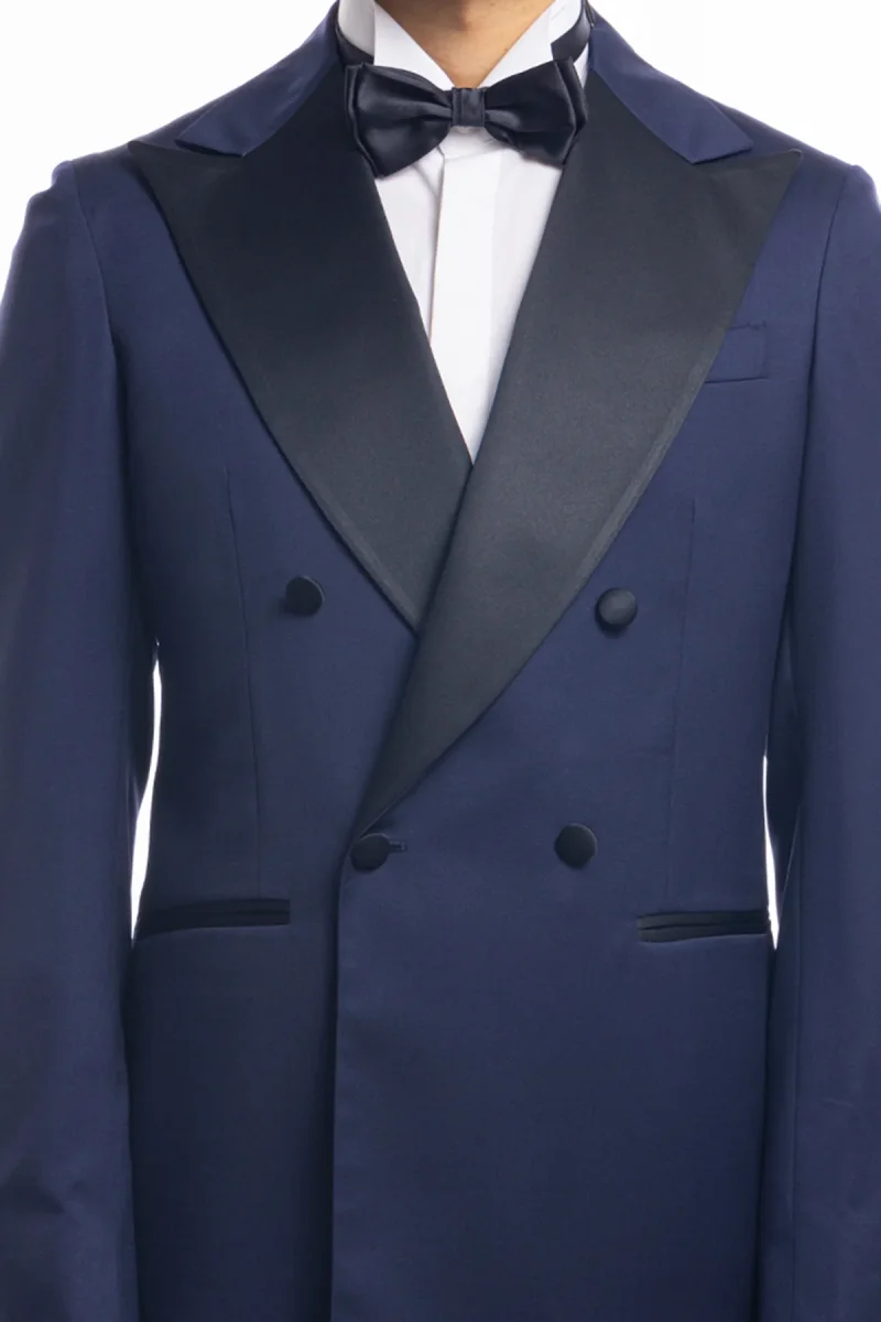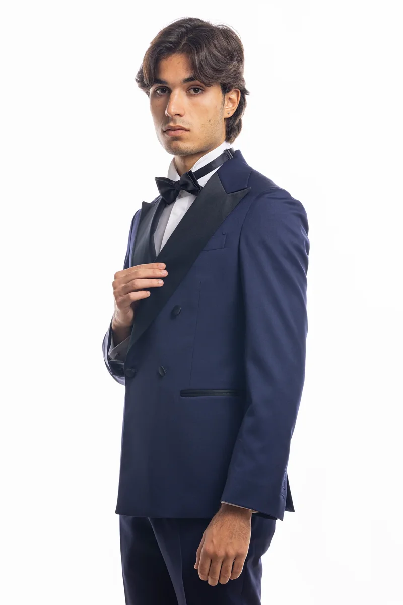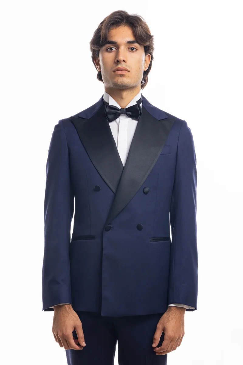 Abito smoking doppiopetto blu royal da uomo in fresco lana super 130’s Vitale Barberis Canonico con rever a Lancia largo in raso con pantalone doppia pinces