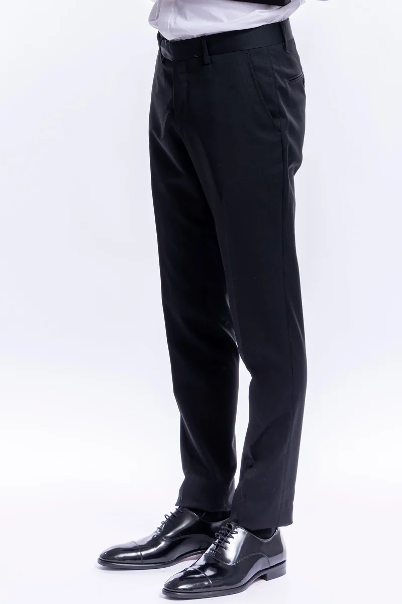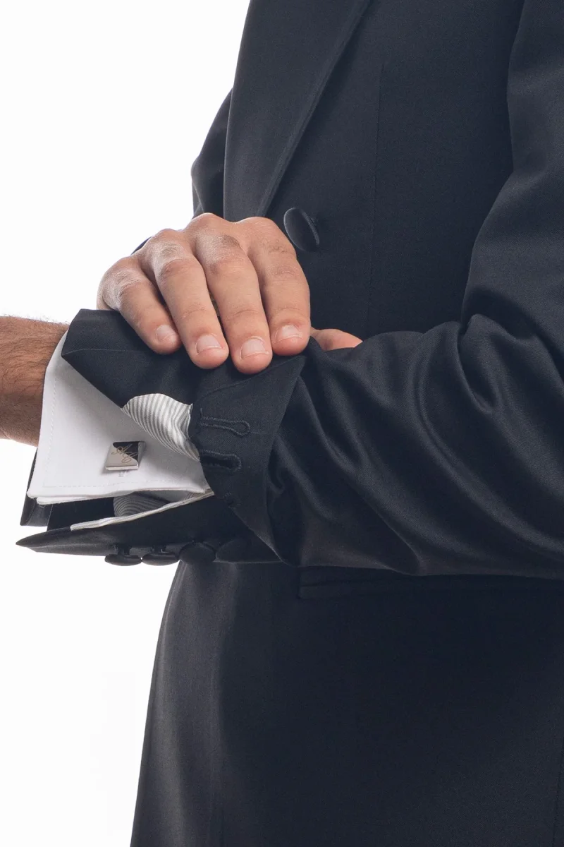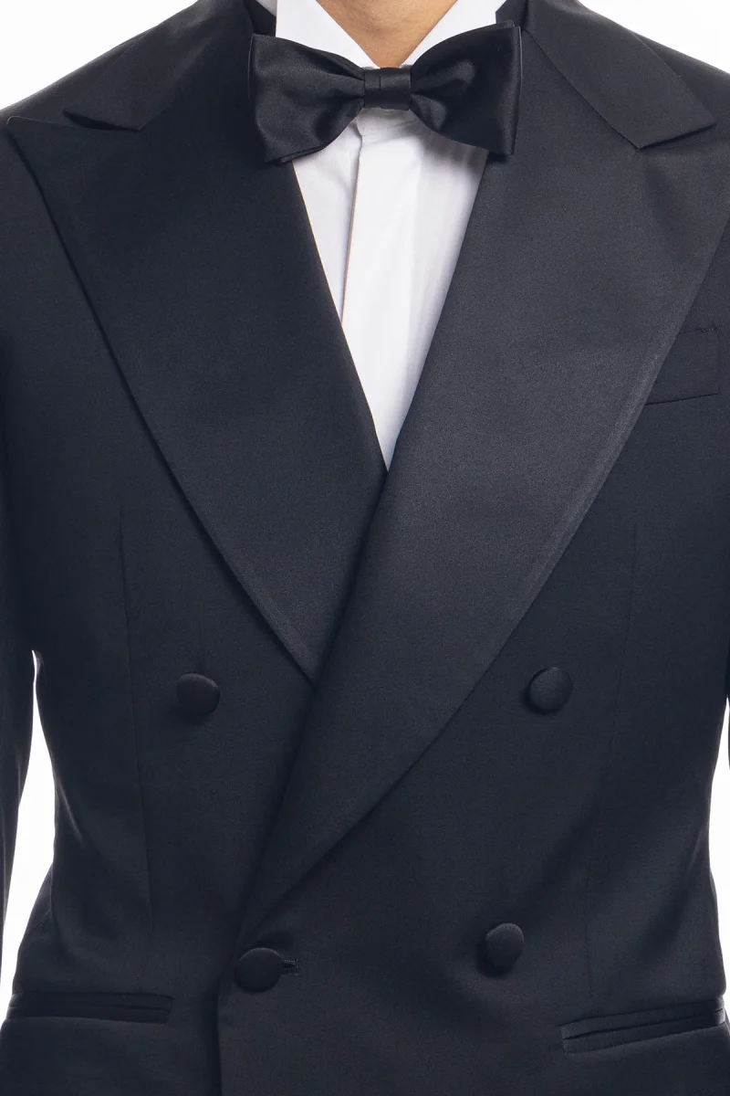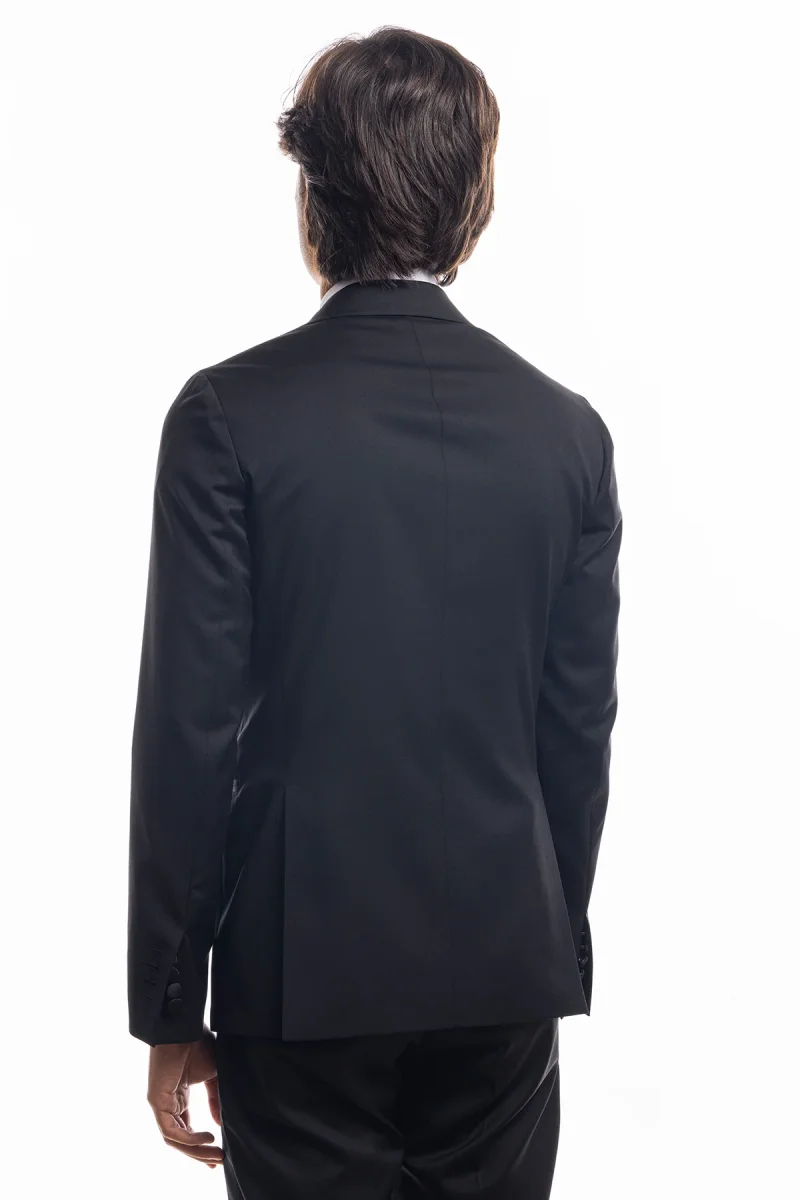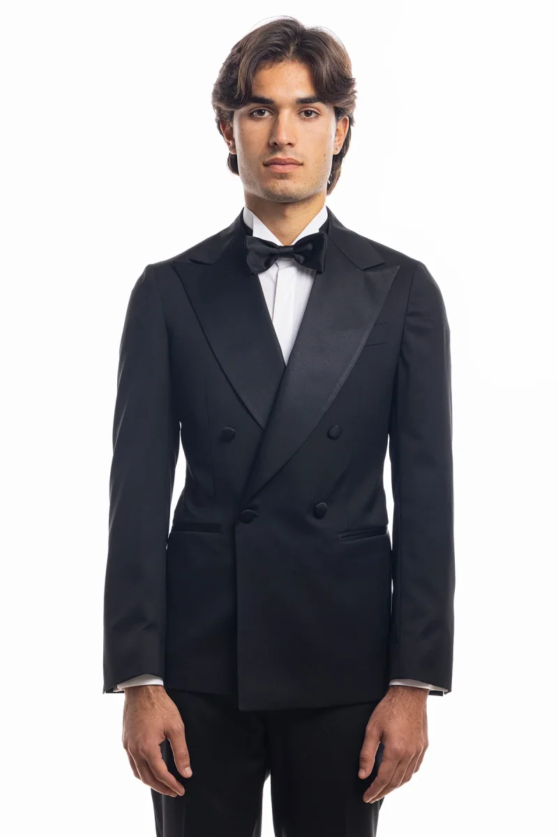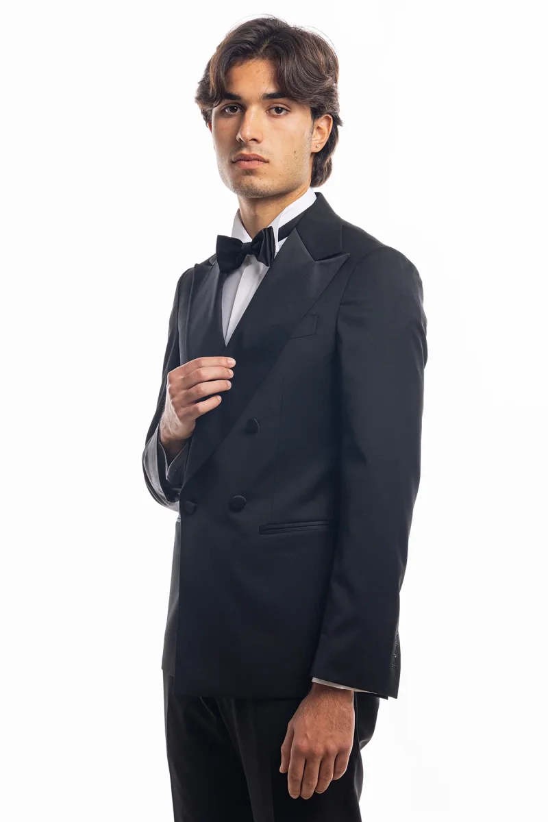 ABITO SMOKING DOPPIOPETTO NERO DA UOMO IN FRESCO LANA SUPER 130’S VITALE BARBERIS CANONICO CON IN REVER A LANCIA LARGO IN RASO