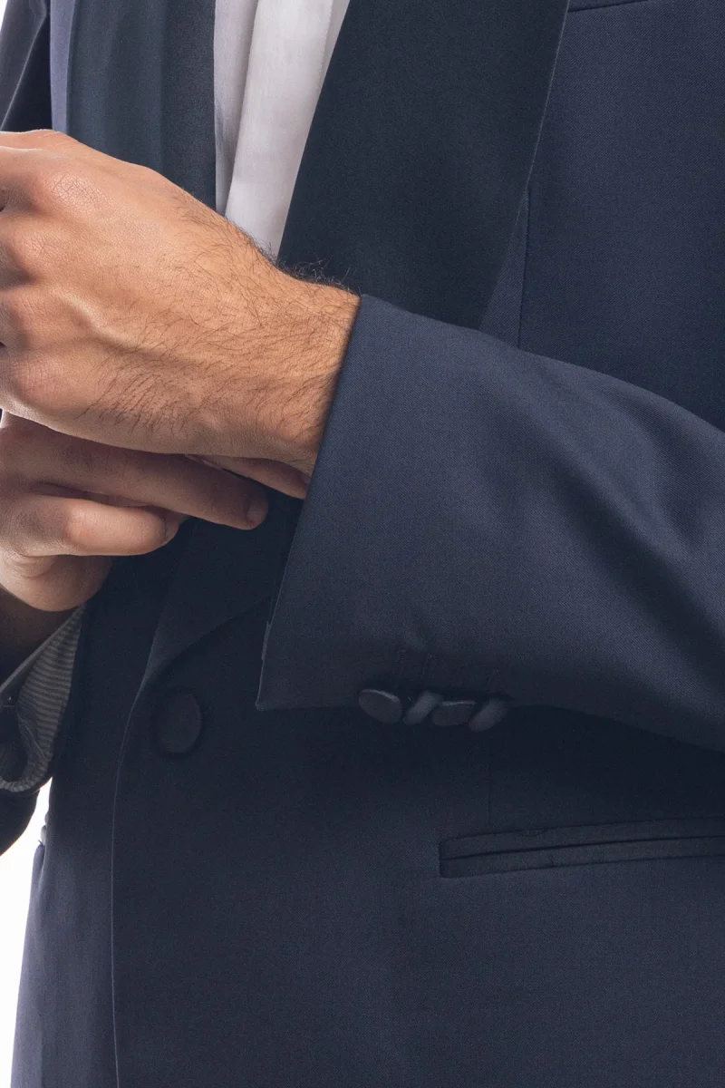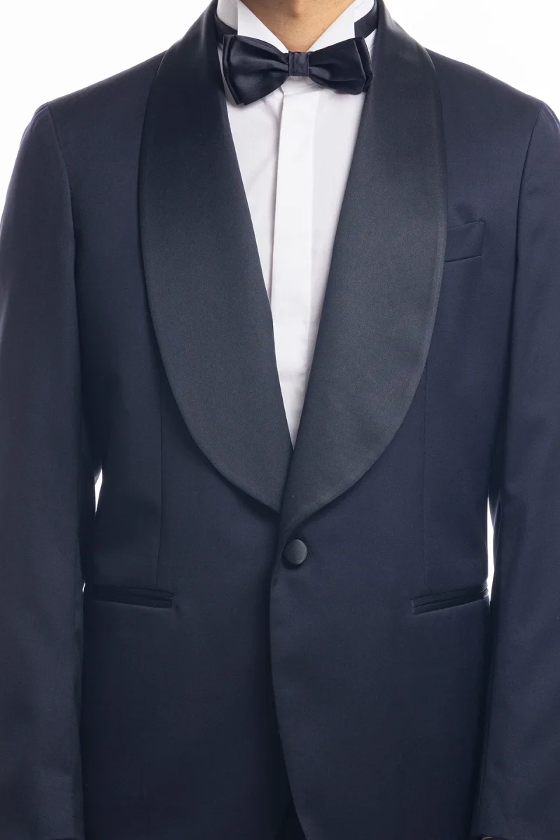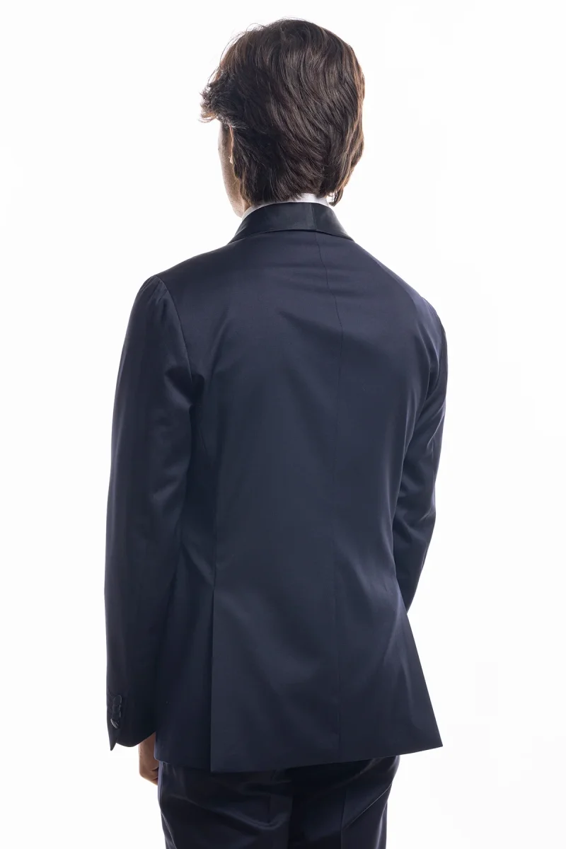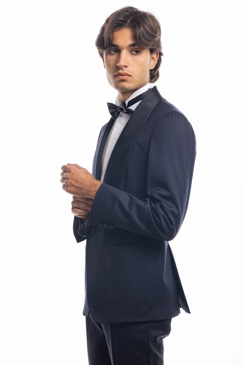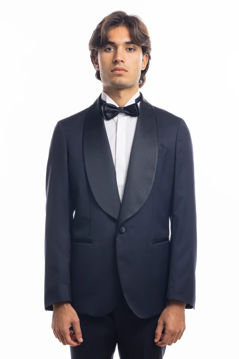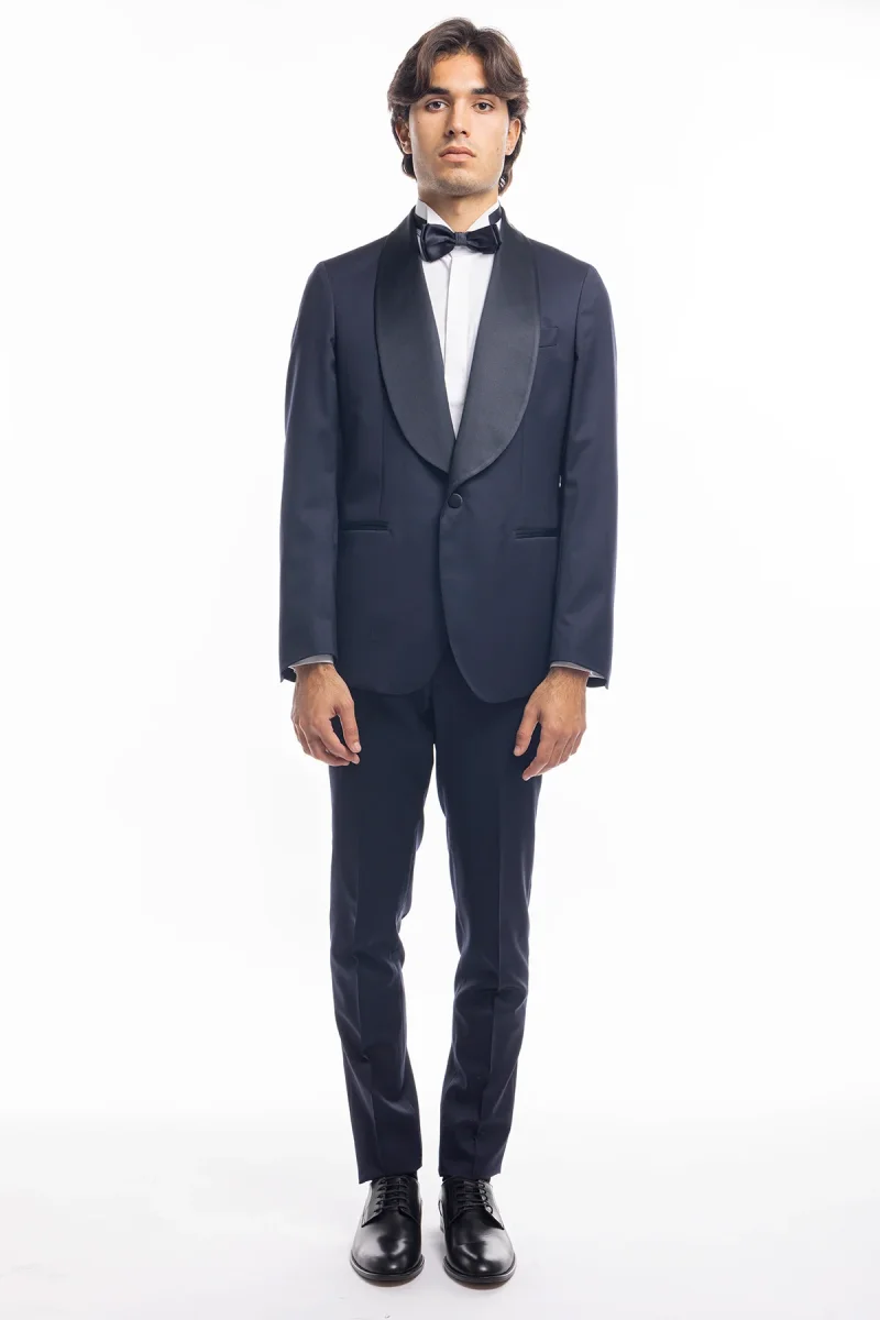 ABITO SMOKING MONOPETTO BLU NOTTE DA UOMO IN FRESCO LANA SUPER 130’S VITALE BARBERIS CANONICO CON REVER A SCIALLE LARGO IN RASO