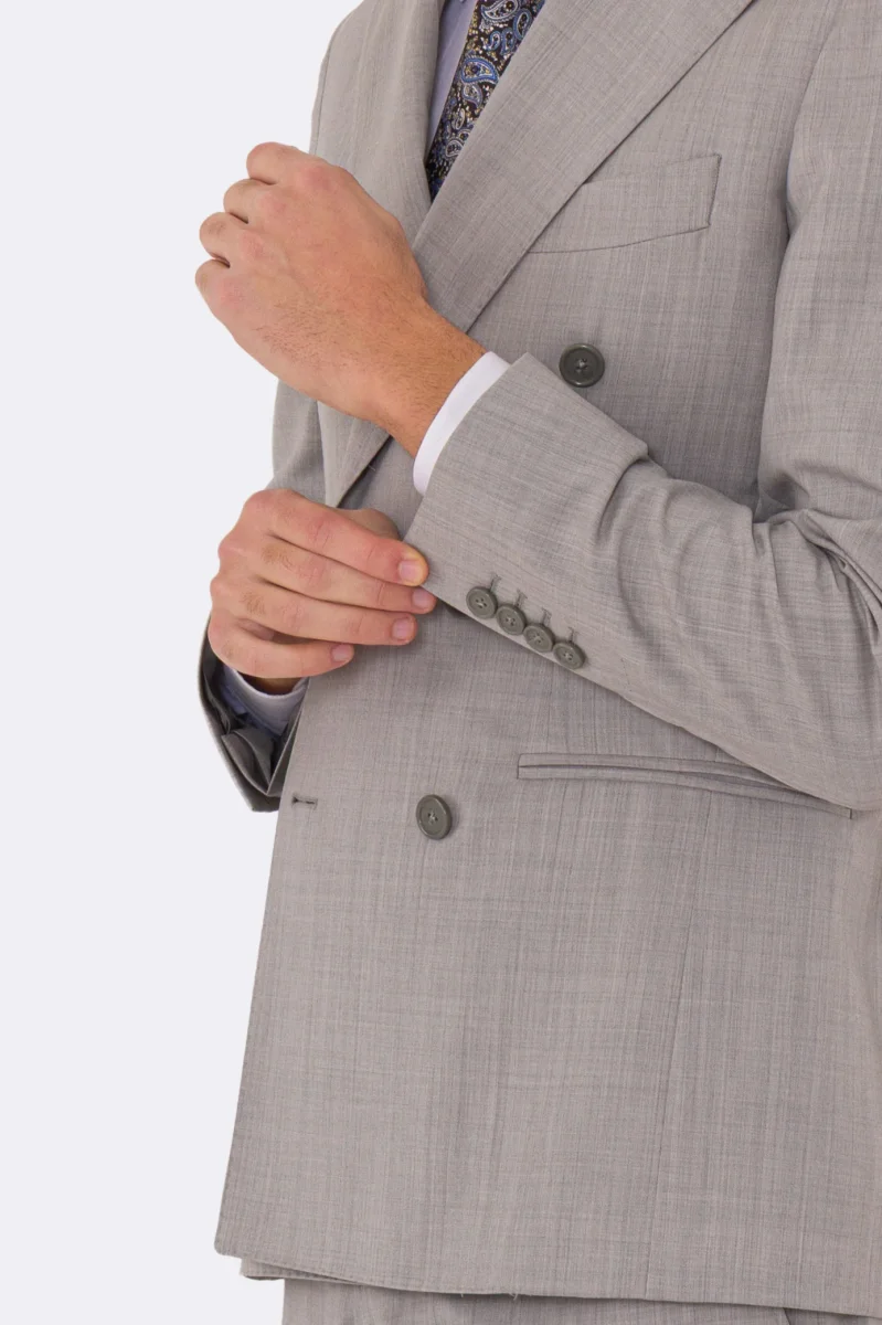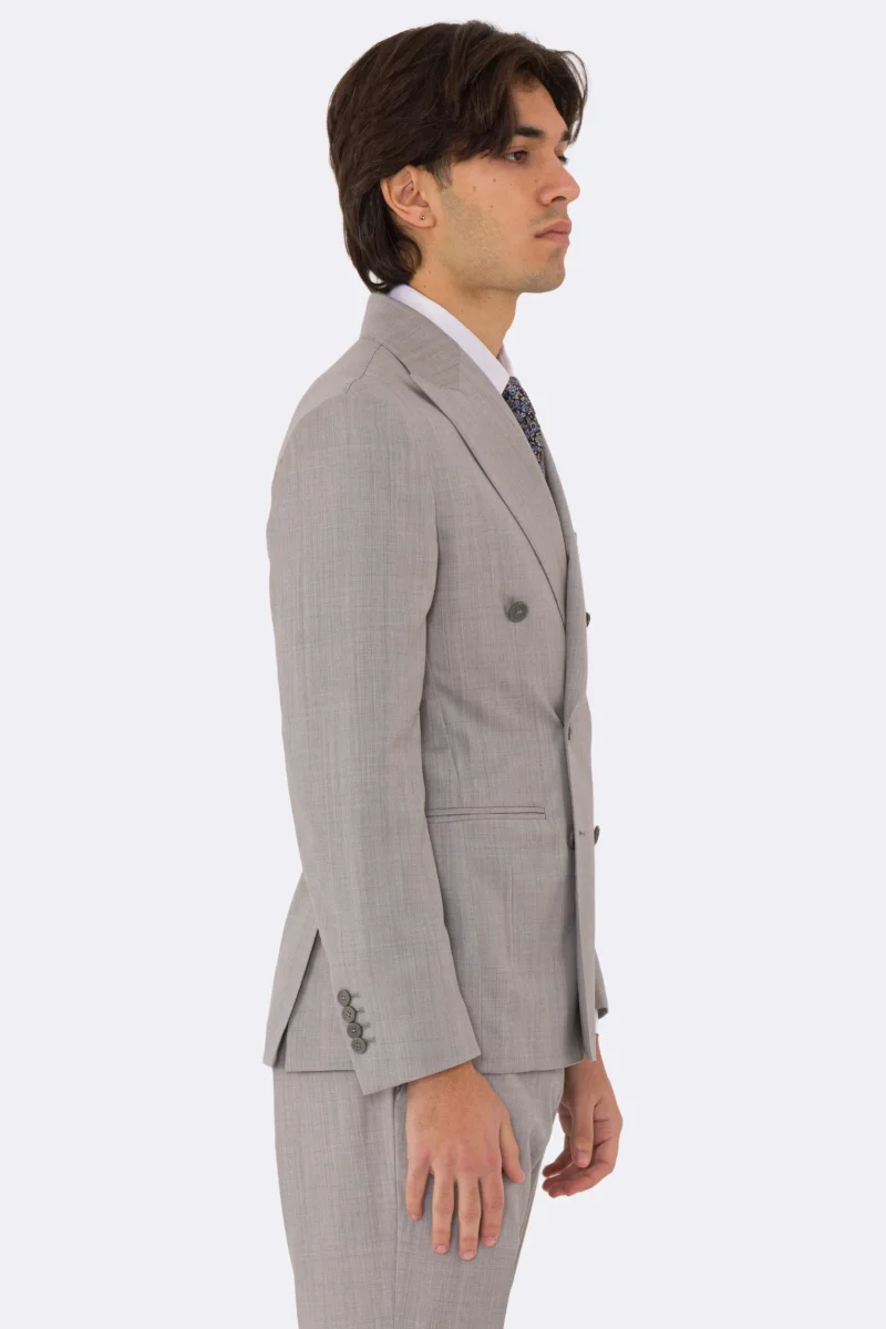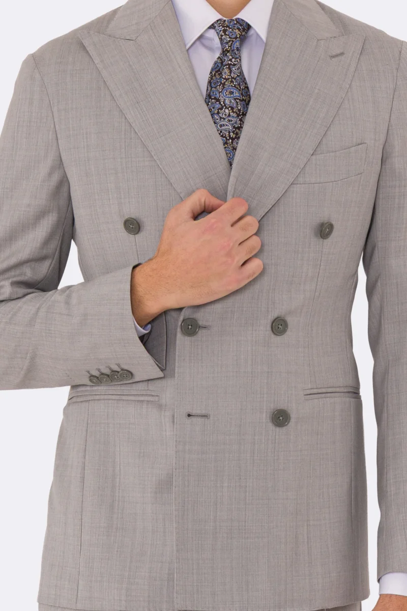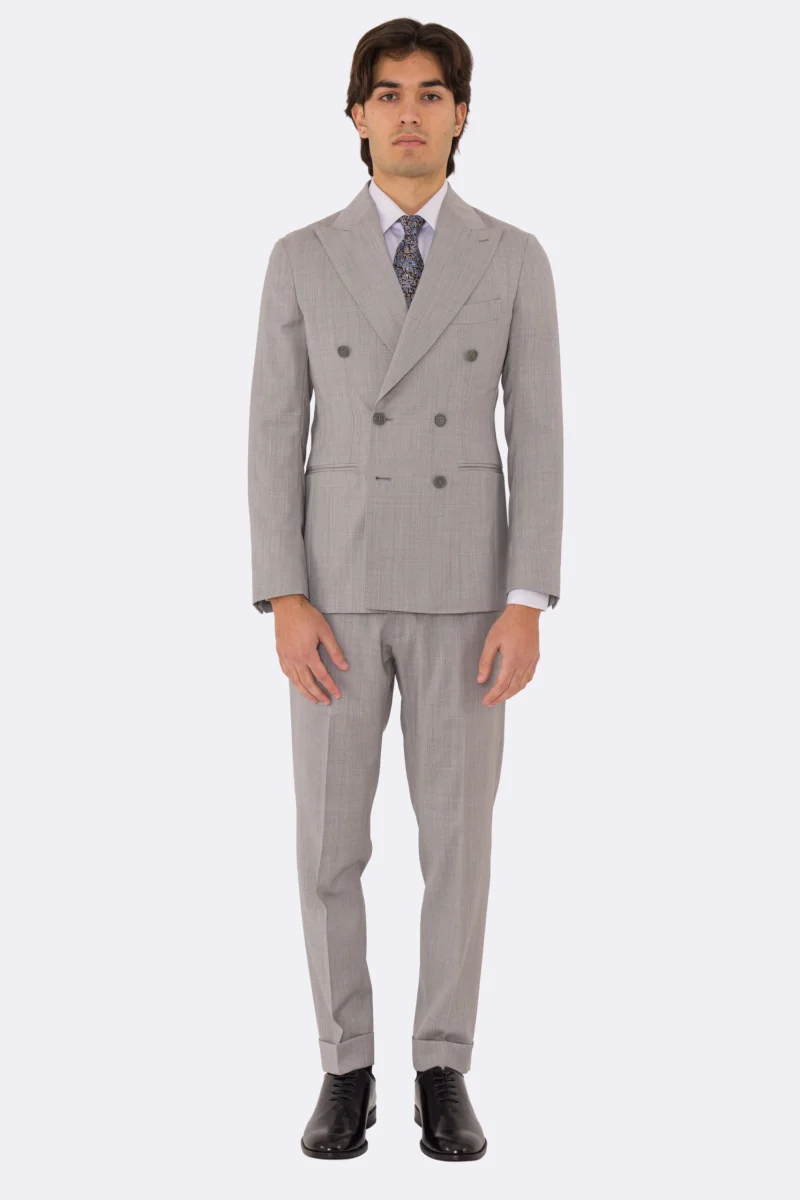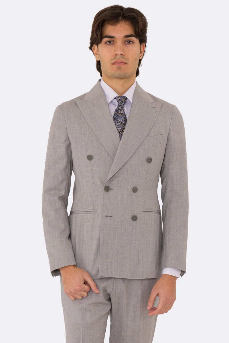 Abito uomo Doppiopetto grigio chiaro fresco lana super 110’s Tessuti in esclusiva Sartoria Carillo completamente sfoderato con Rever a lancia e tasche a filetto