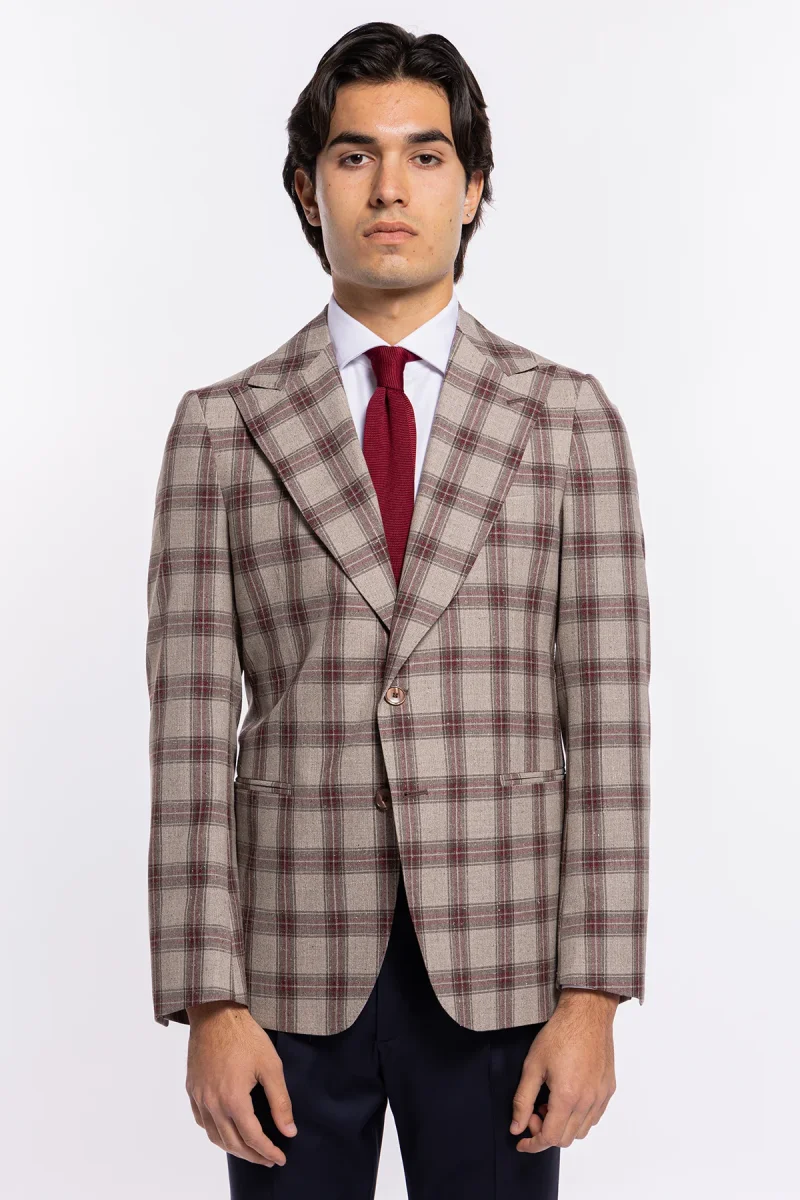 Scopri l’eleganza senza tempo di questa giacca beige a quadri bordeaux, un capolavoro sartoriale realizzato con i prestigiosi tessuti Vitale Barberis Canonico. Perfetta per un uomo moderno che desidera un look raffinato, versatile e di alta qualità.