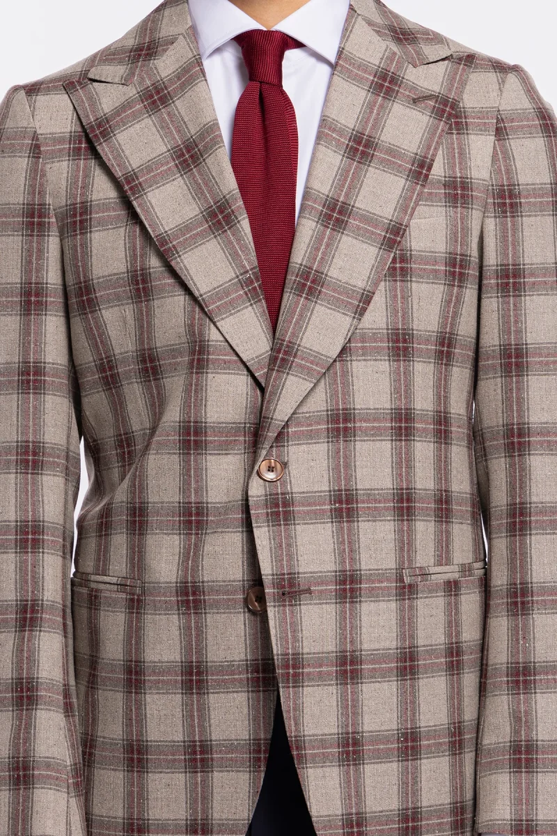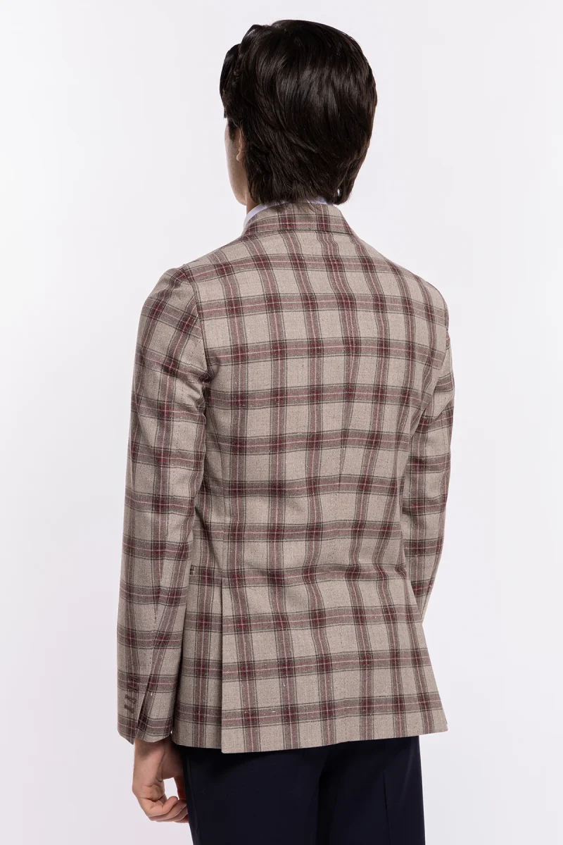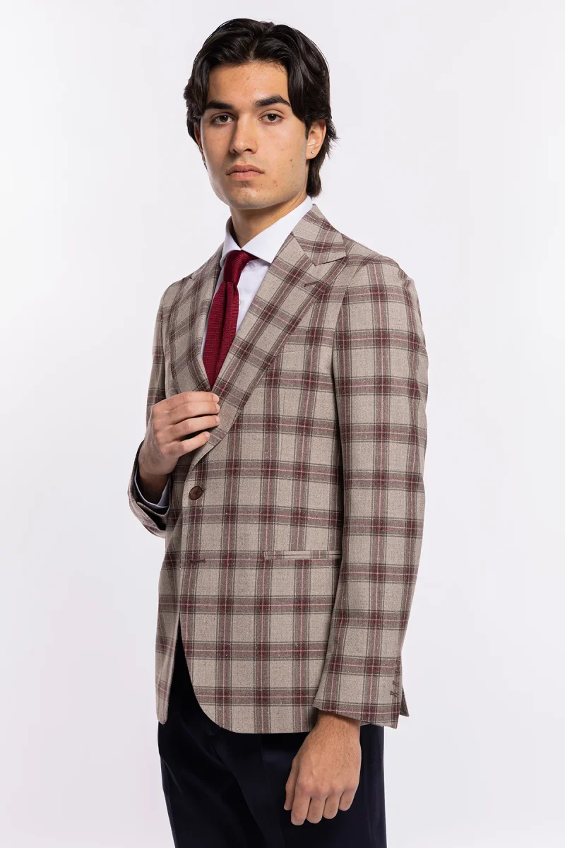 Questa giacca monopetto beige a quadri bordeaux, con tessuto pregiato Vitale Barberis Canonico e sartorialità italiana, è la scelta perfetta per un uomo elegante e moderno: un capo che coniuga stile, comfort e prestigio in ogni stagione.